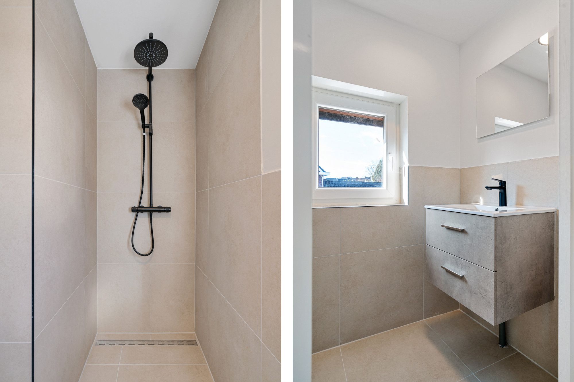 De moderne, betegelde badkamer is uitgerust met een inloopdouche en een vaste wastafel met meubel.