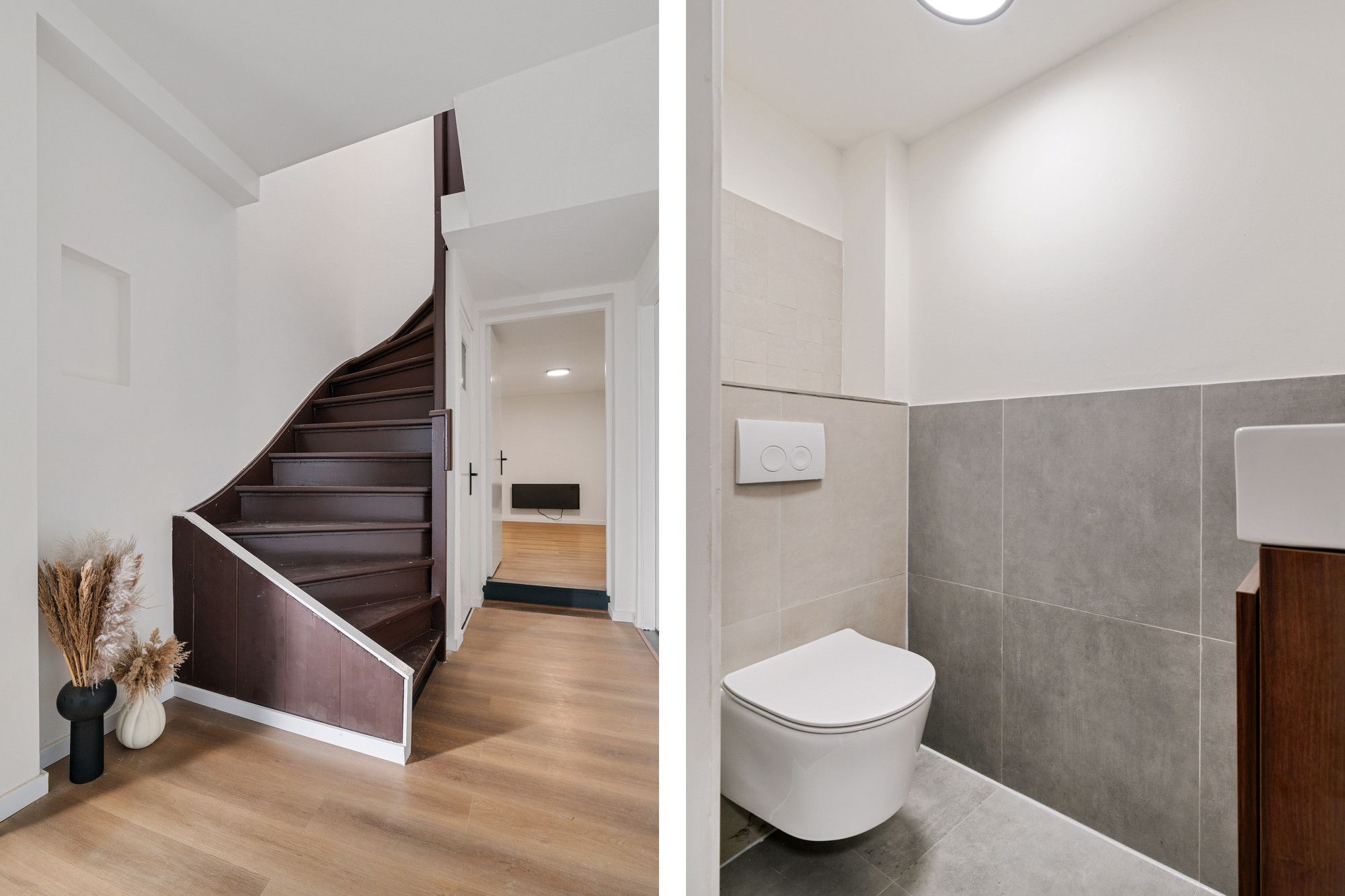 Via de entree kom je binnen in de hal met meterkast en trapopgang naar de eerste verdieping. Hier bevindt zich tevens de moderne toiletruimte voorzien van een zwevend toilet, fonteintje en meubel.