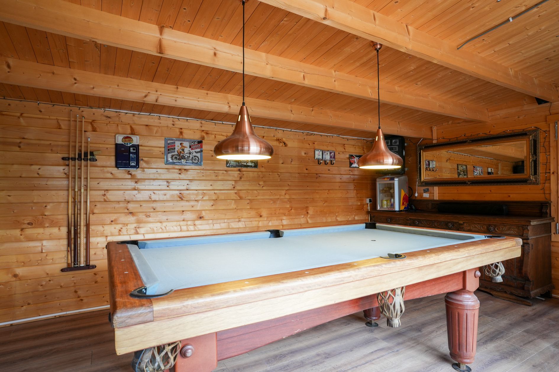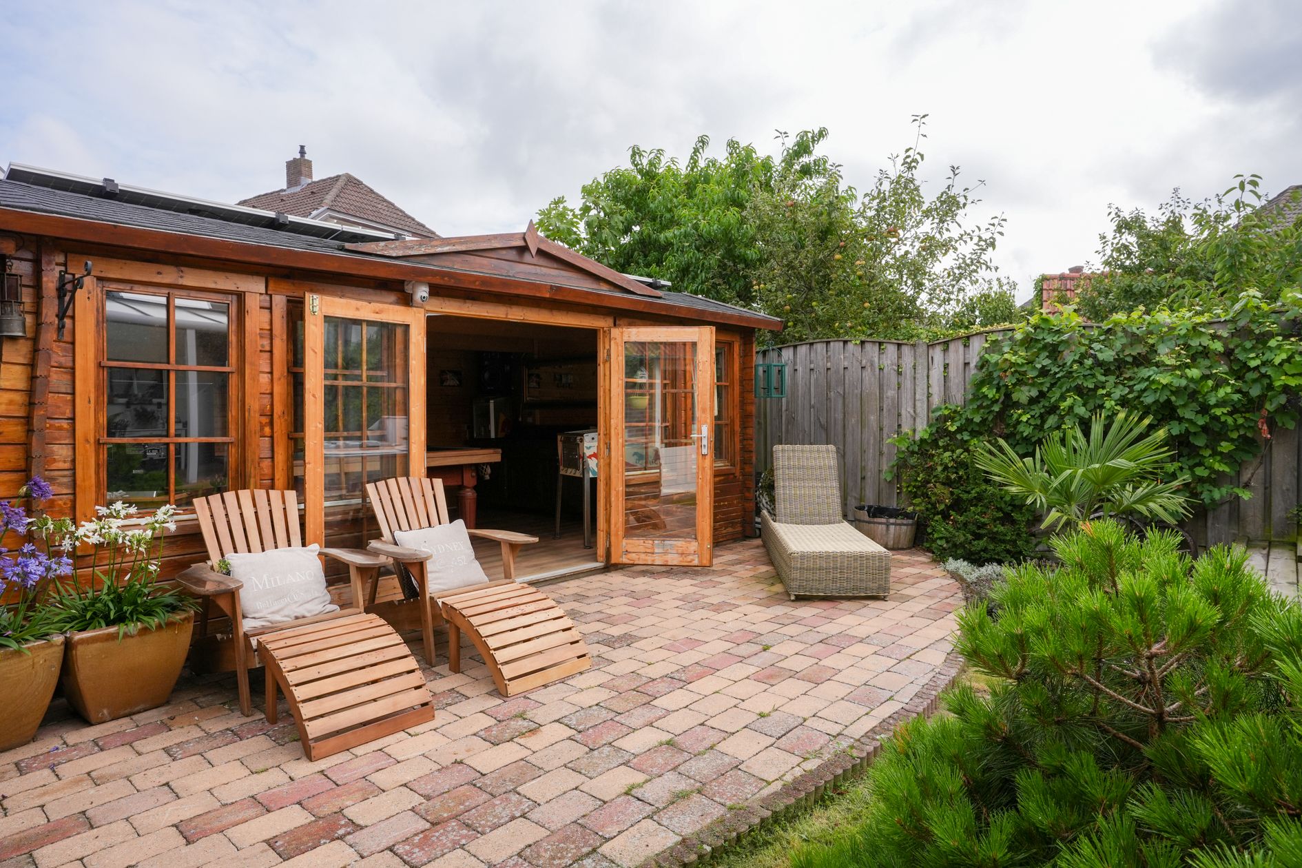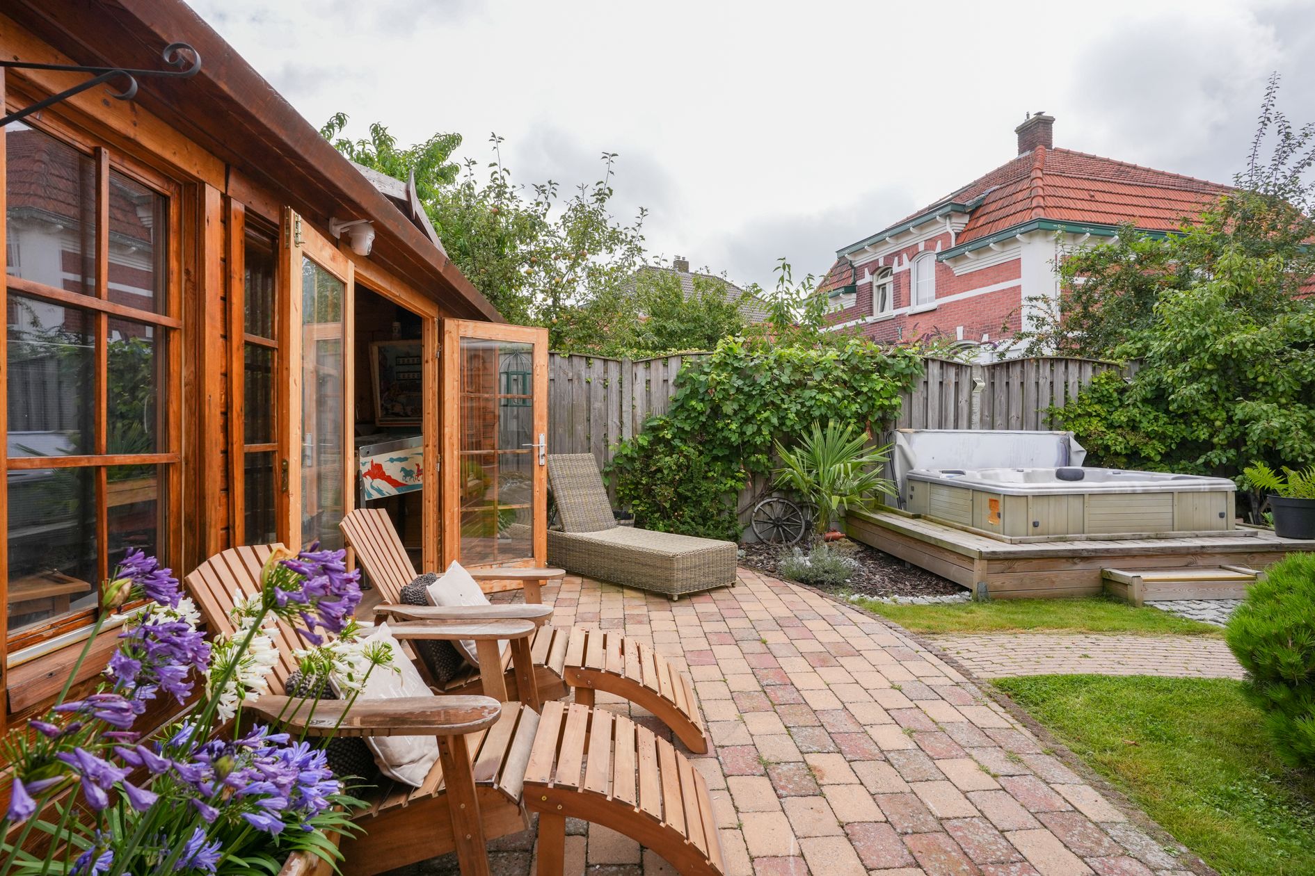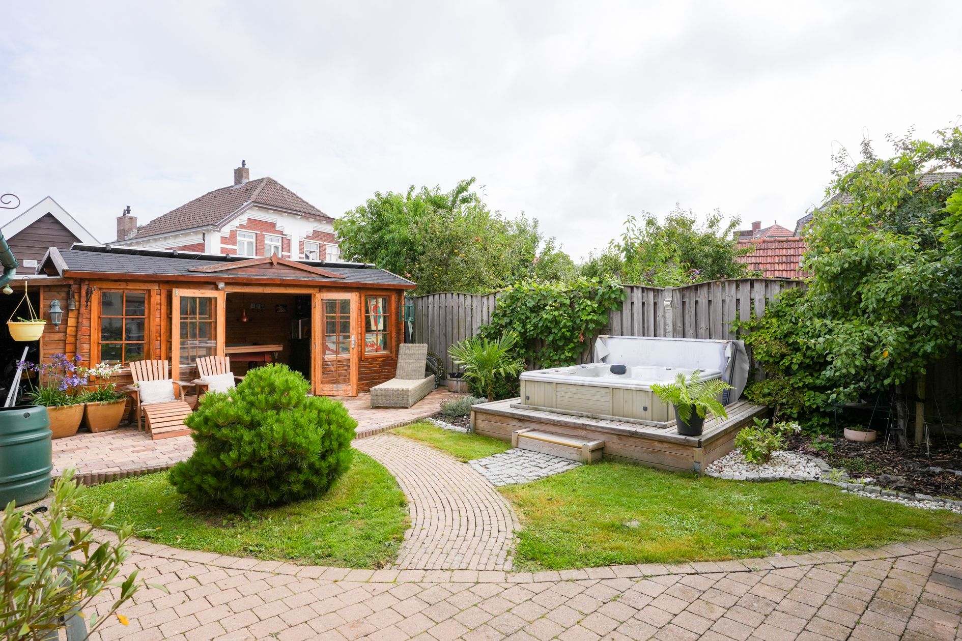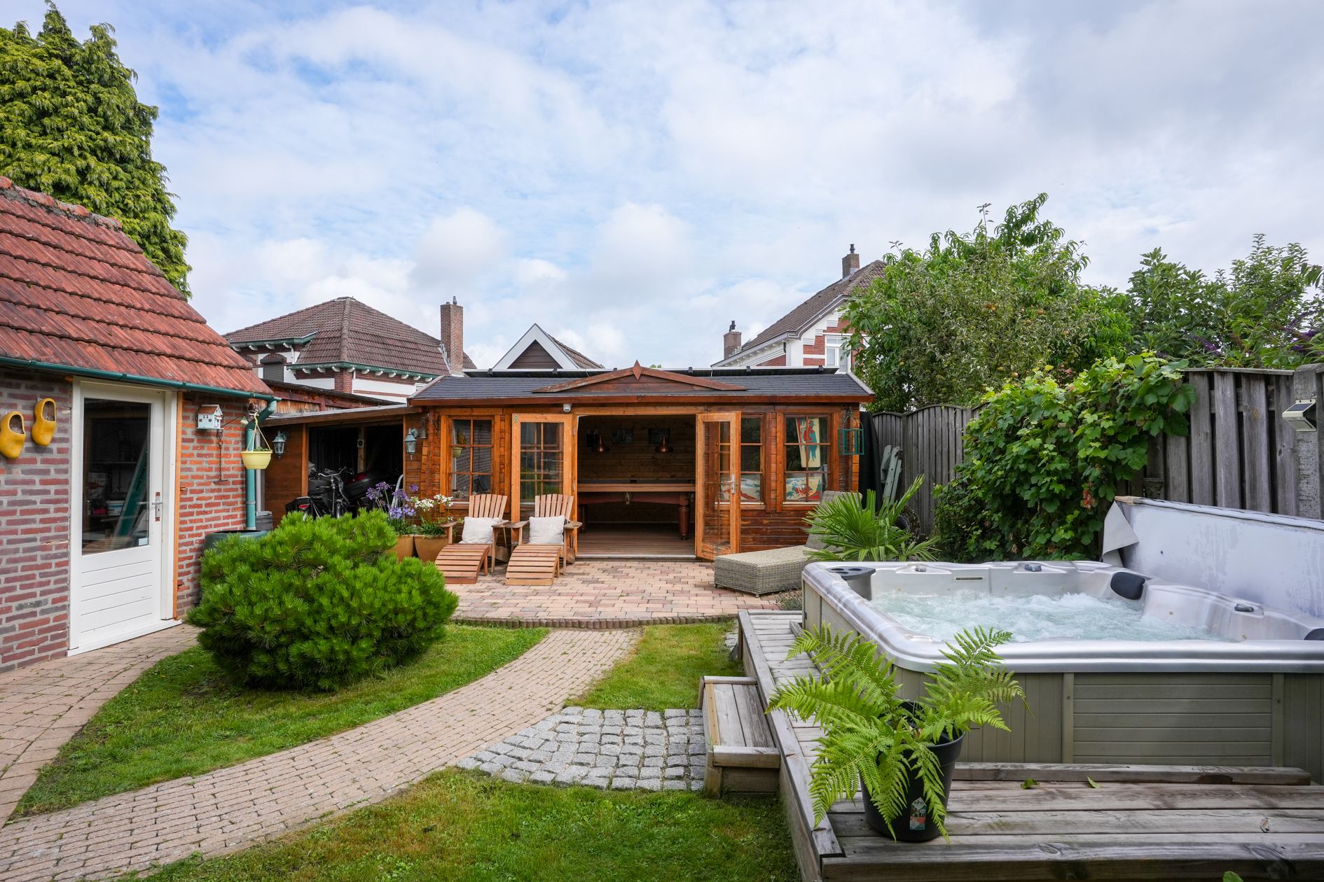 Aan de achtergevel (uitgang keuken) is een overkapping aangebracht. In de tuin bevindt zich een jacuzzi (ter overname) en het tuinhuis is omgetoverd tot een mancave. Ruime berging en fietsenstalling.