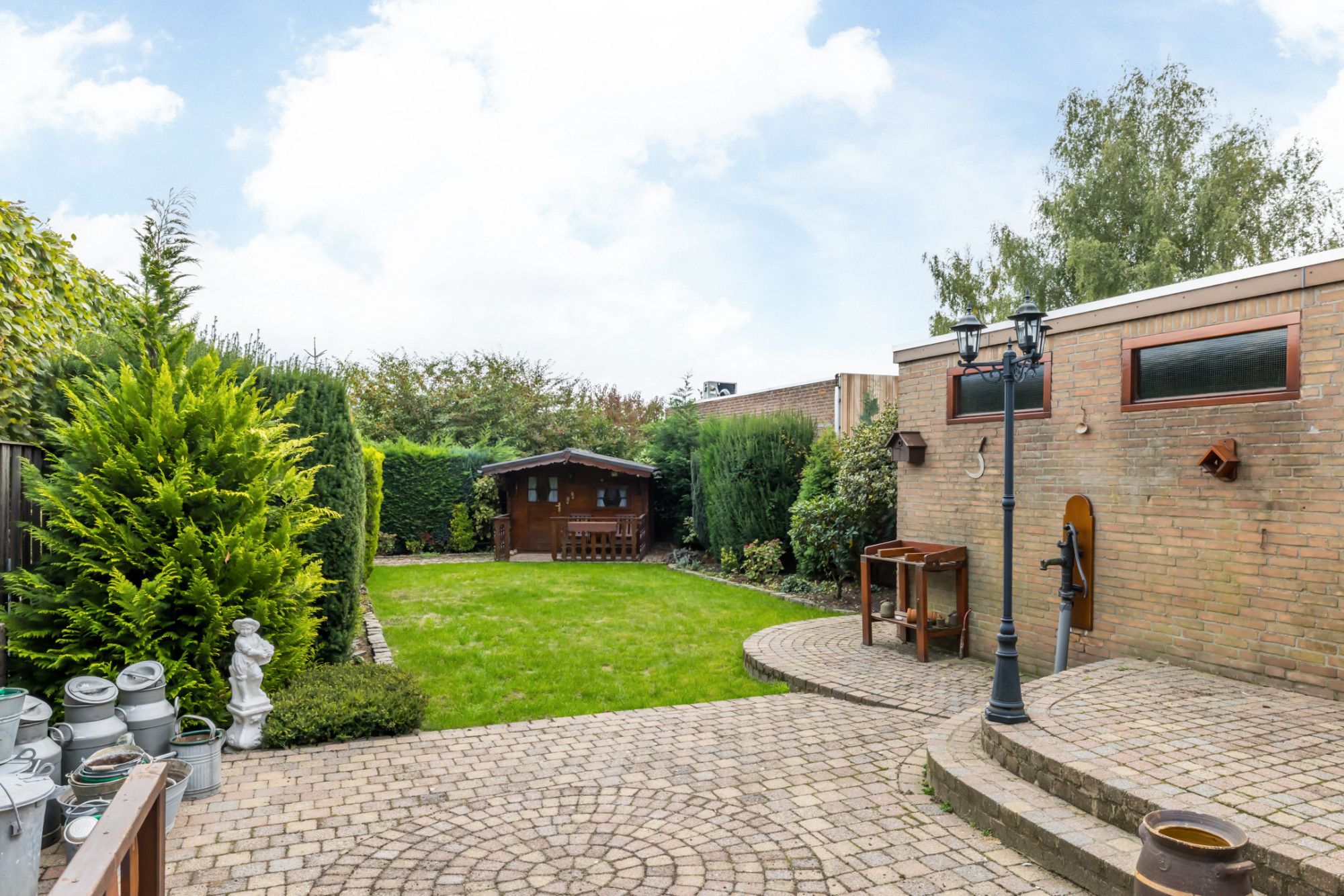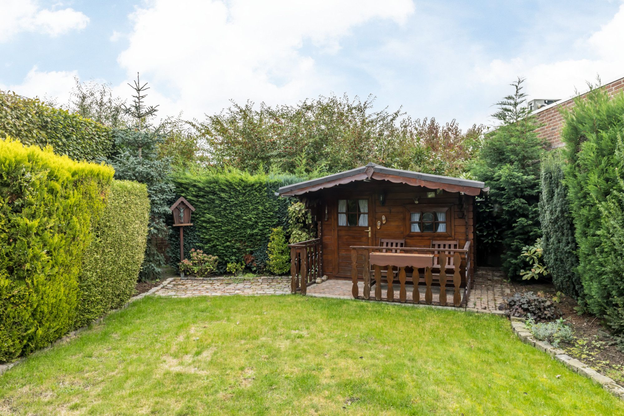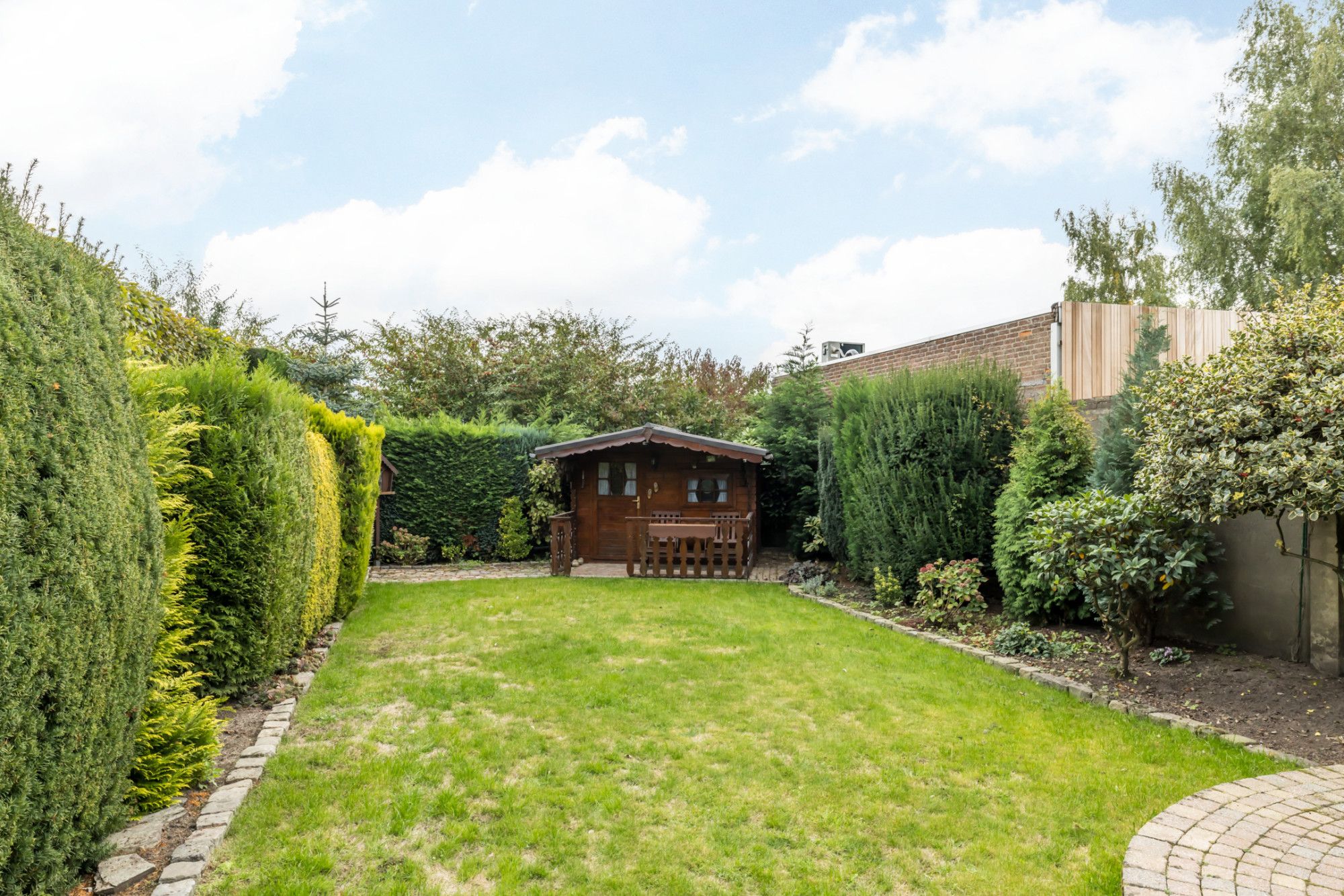 De diepe achtertuin is verzorgd aangelegd met een terras, gazon, borders met aanplanting, een houten tuinhuis en een handige zijingang.