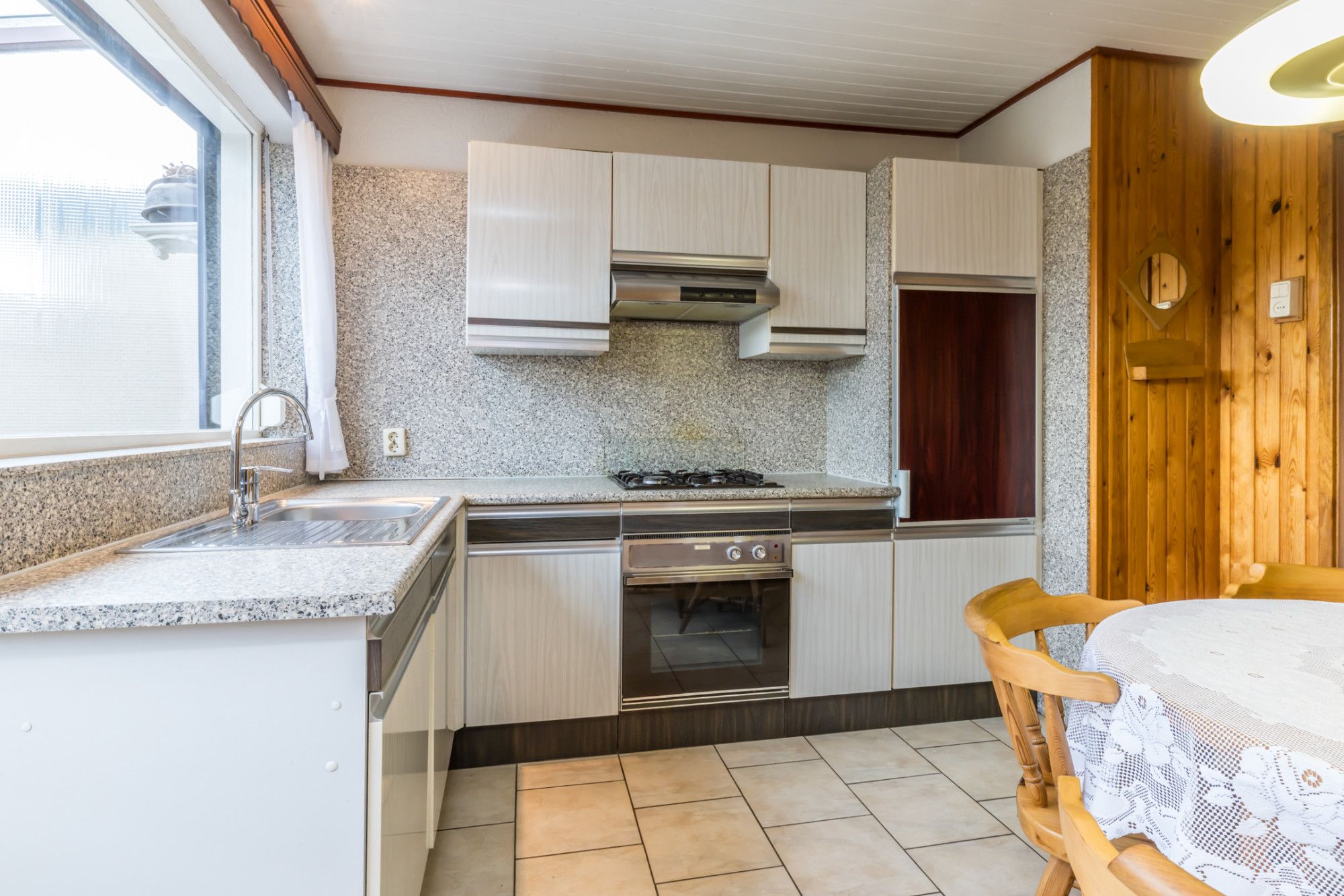 Een gesloten keukenruimte met een eenvoudige inbouwkeuken in hoekopstelling, voorzien van apparatuur, te weten: 4 pits gasfornuis / afzuigkap / elektrische oven / wasbak / koelkast en opbergruimte. Loopdeur naar de achtergelegen veranda met extra leefruimte, voorzien van glazen schuifwanden en direct tuincontact.