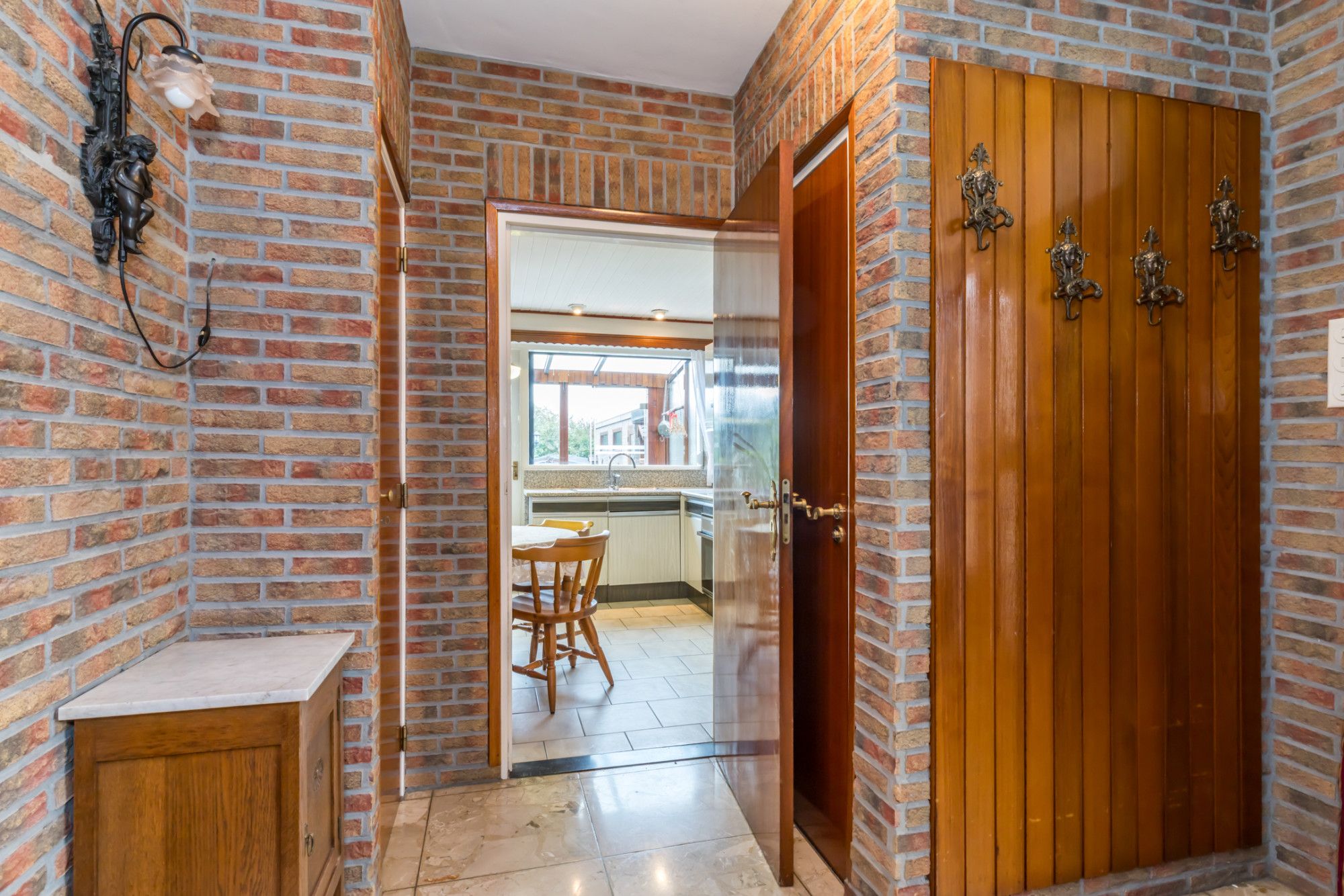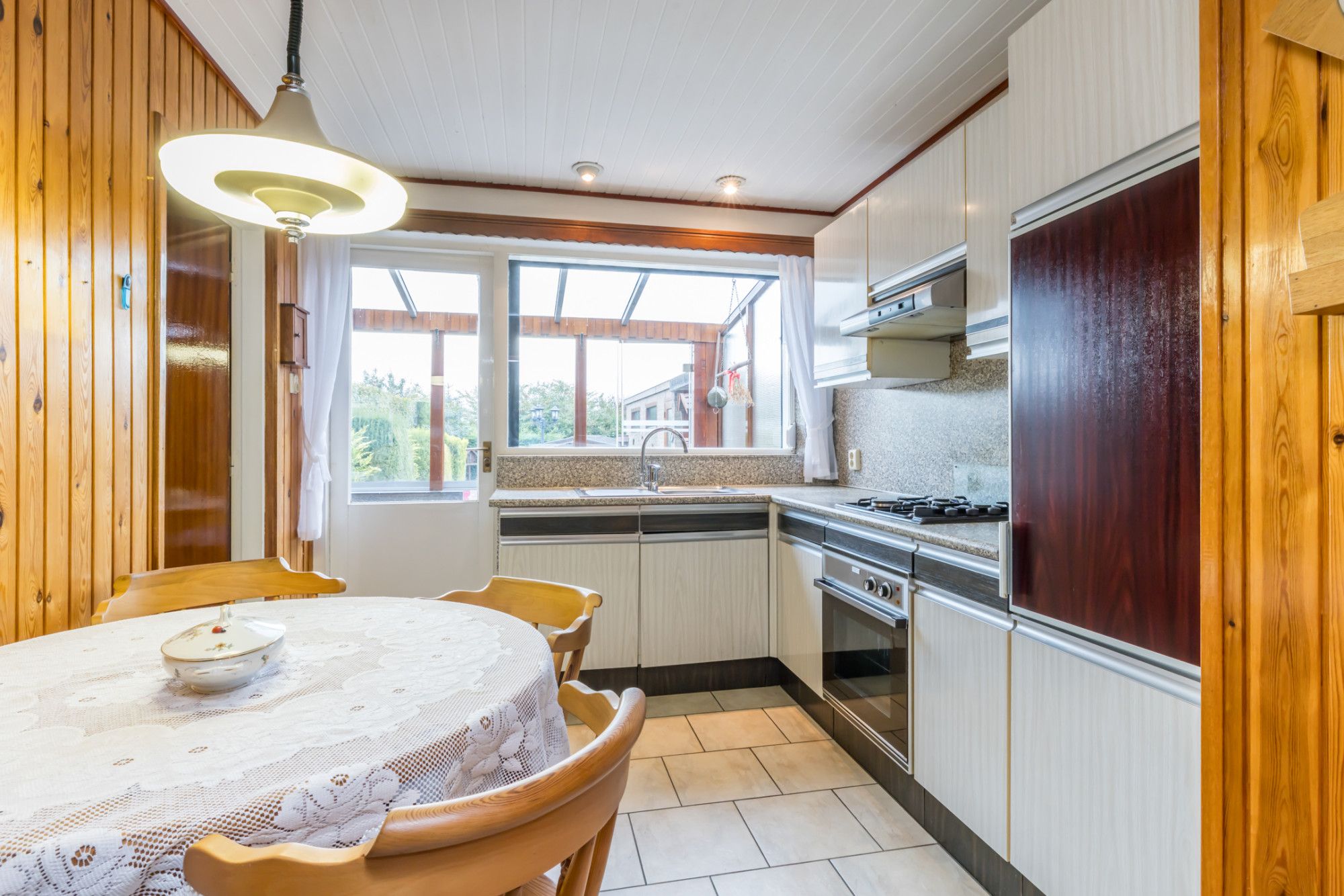 De keuken is voorzien van een eenvoudige inbouwkeuken met apparatuur en biedt toegang tot de aangebouwde veranda met glazen schuifwanden – een heerlijke plek om het hele jaar door te genieten van het tuincontact en extra leefruimte.