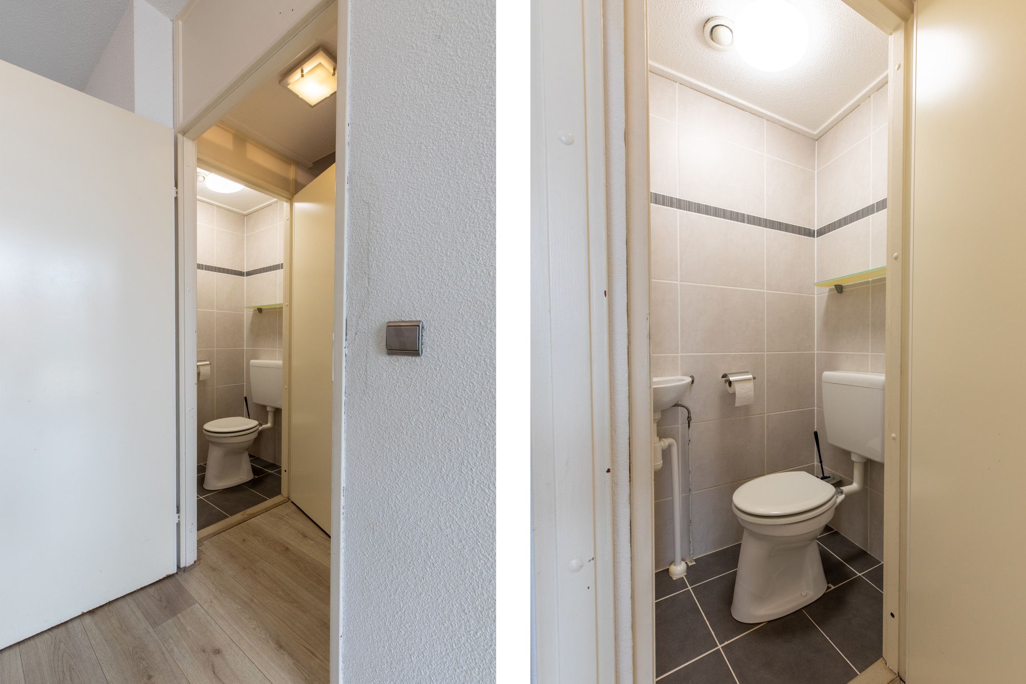 Doorloop hal naar verdieping met geheel betegelde toiletruimte met duo-closet en fonteintje.