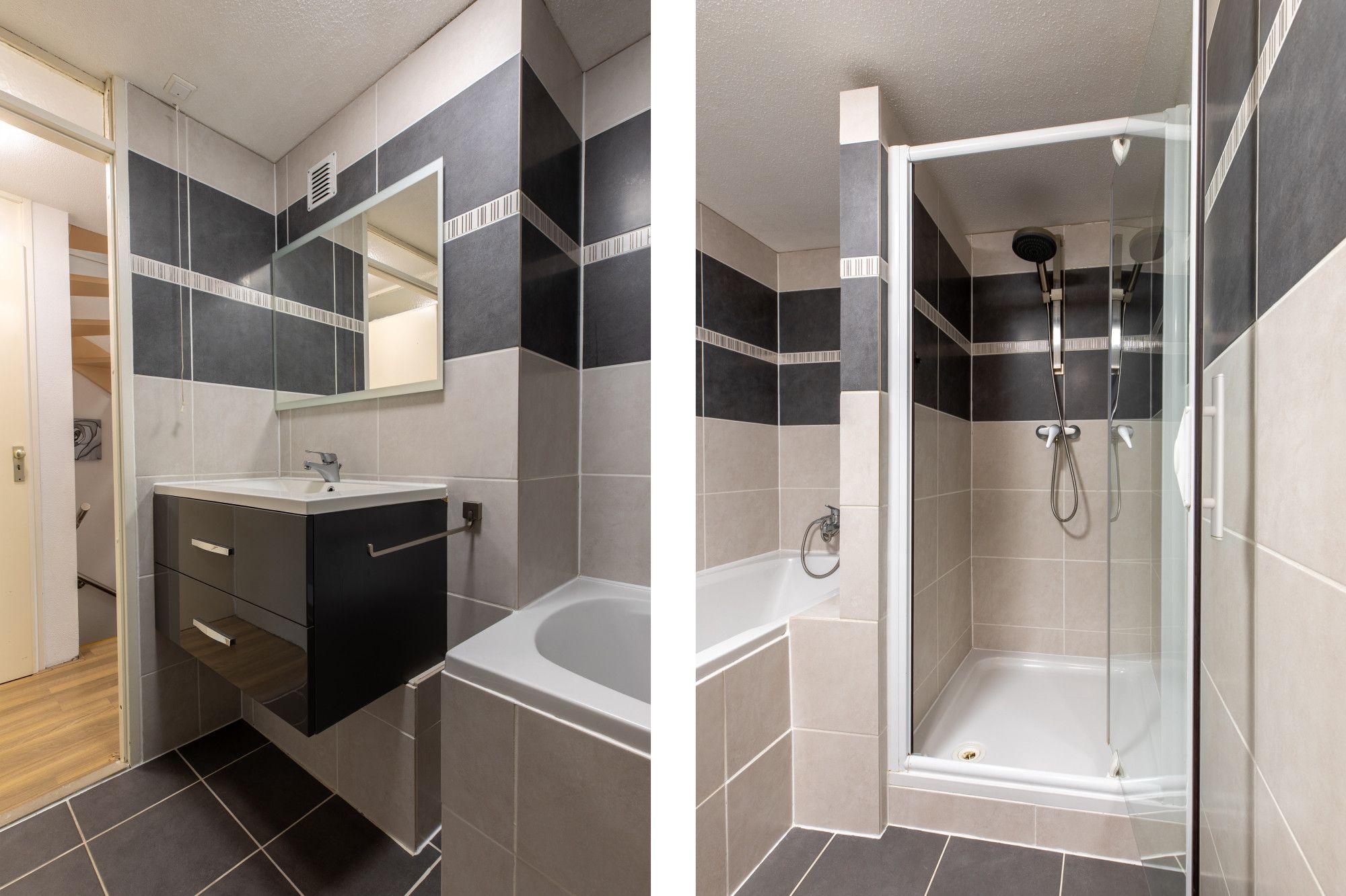 Geheel betegelde moderne badkamer (2.79 x 1.97 m) met douchecabine, ligbad, badmeubel met wastafel en design radiator.