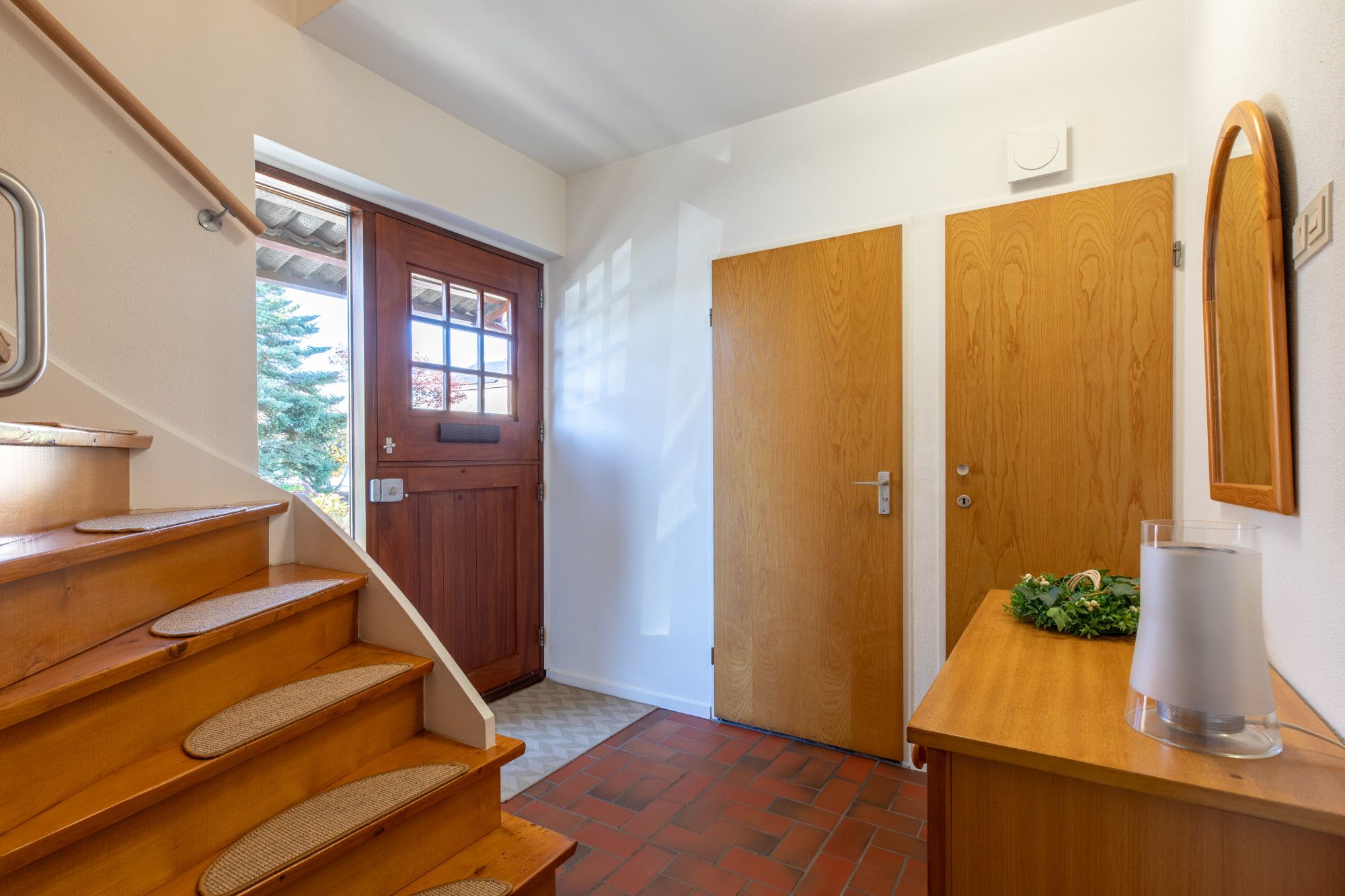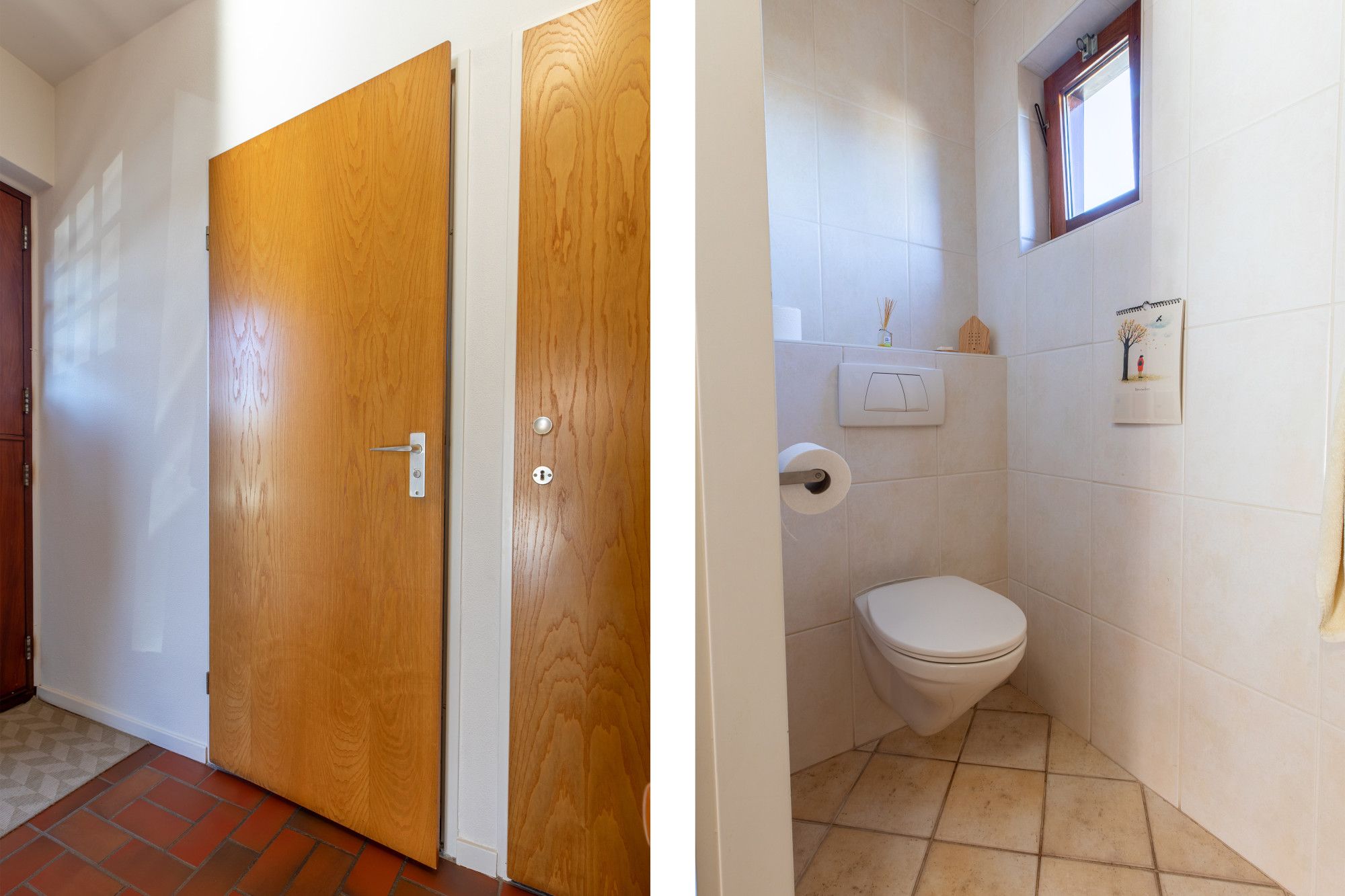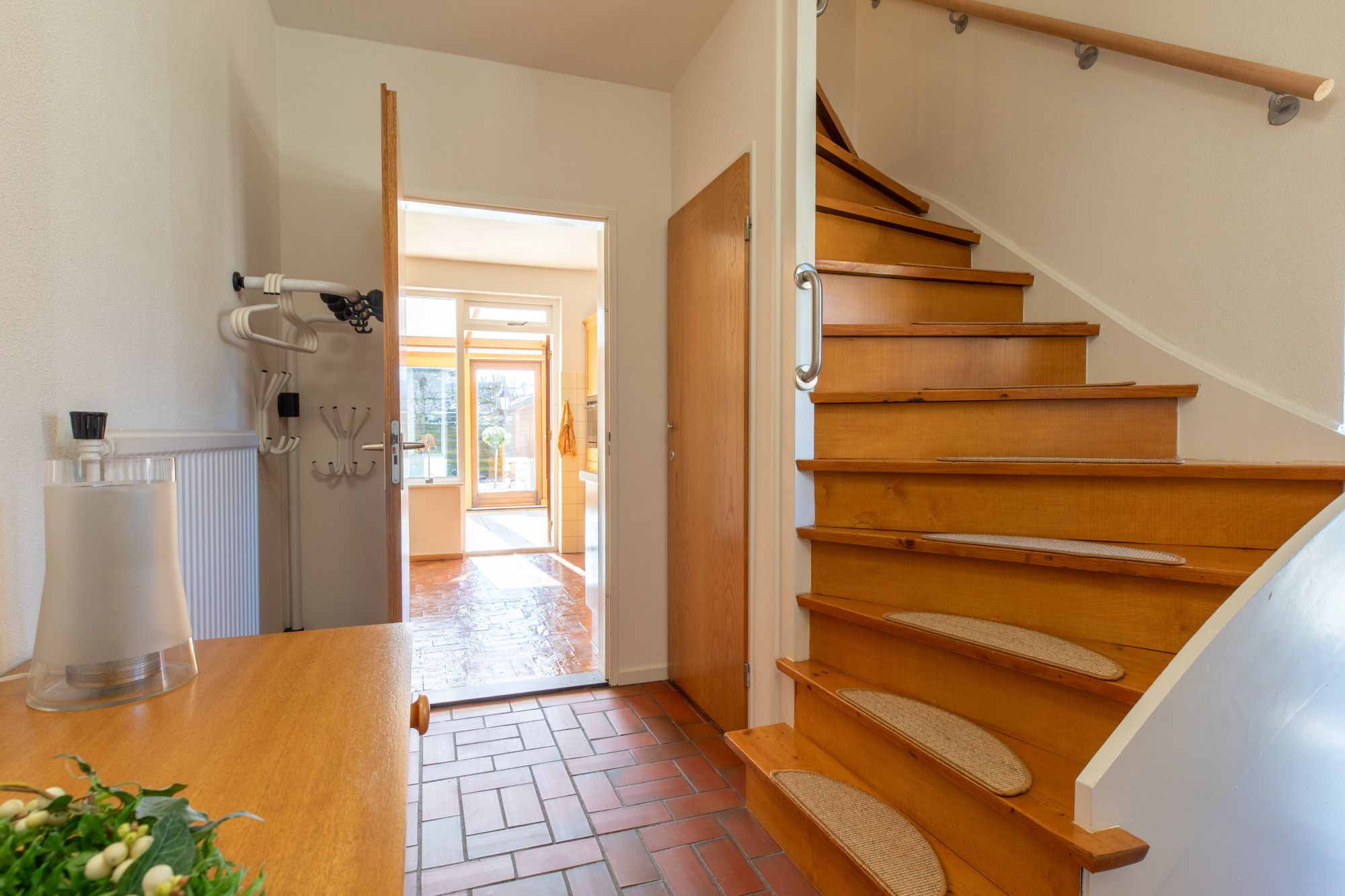 Ruime en keurig aangelegde voortuin met diverse beplantingen en begroeiingen. Overdekte entree. Hal met meterkast, verdiepingstrap, trapberging en toiletruimte voorzien van hangend toilet met fonteintje.
