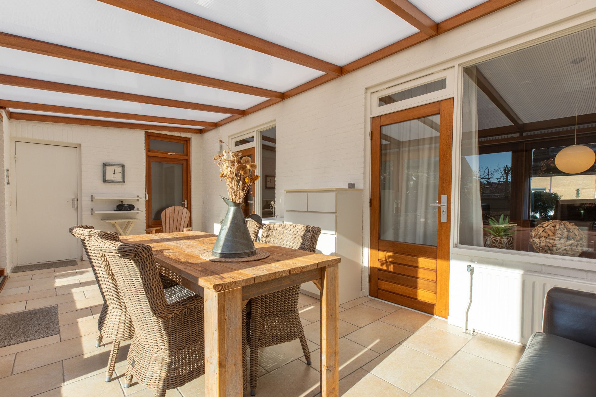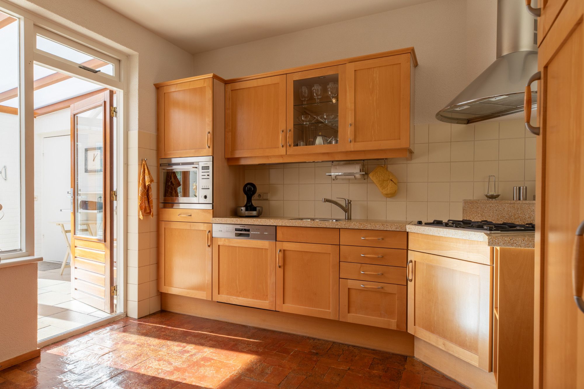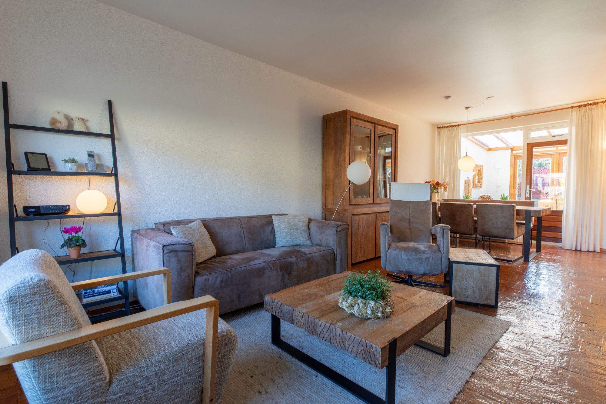 Doorzonwoonkamer met schouwpartij. Halfopen keuken ruimte voorzien van een keukeninstallatie met diverse inbouwapparatuur. Vanuit de keuken is er een toegangsdeur naar de riante serre. De serre heeft een doorloop naar de garage, de oprit en middels een schuifpui naar de achtertuin. De achtertuin is op het zuiden gesitueerd en is voorzien van terras, borderbeplantingen, enkele bomen en een groot tuinhuis. Naast de woning is de oprit met toegang naar de garage.