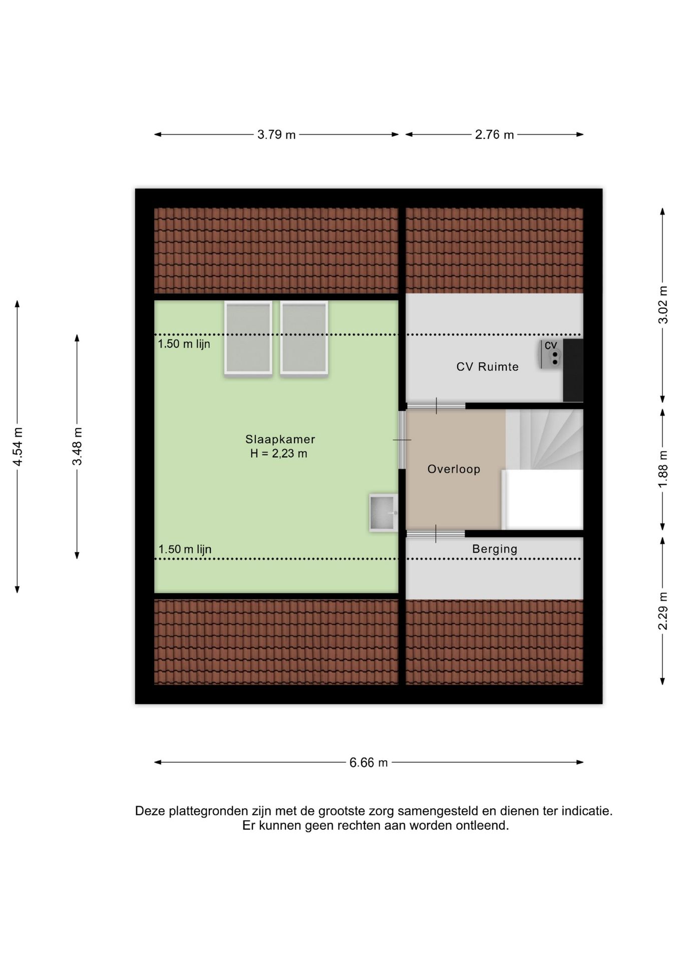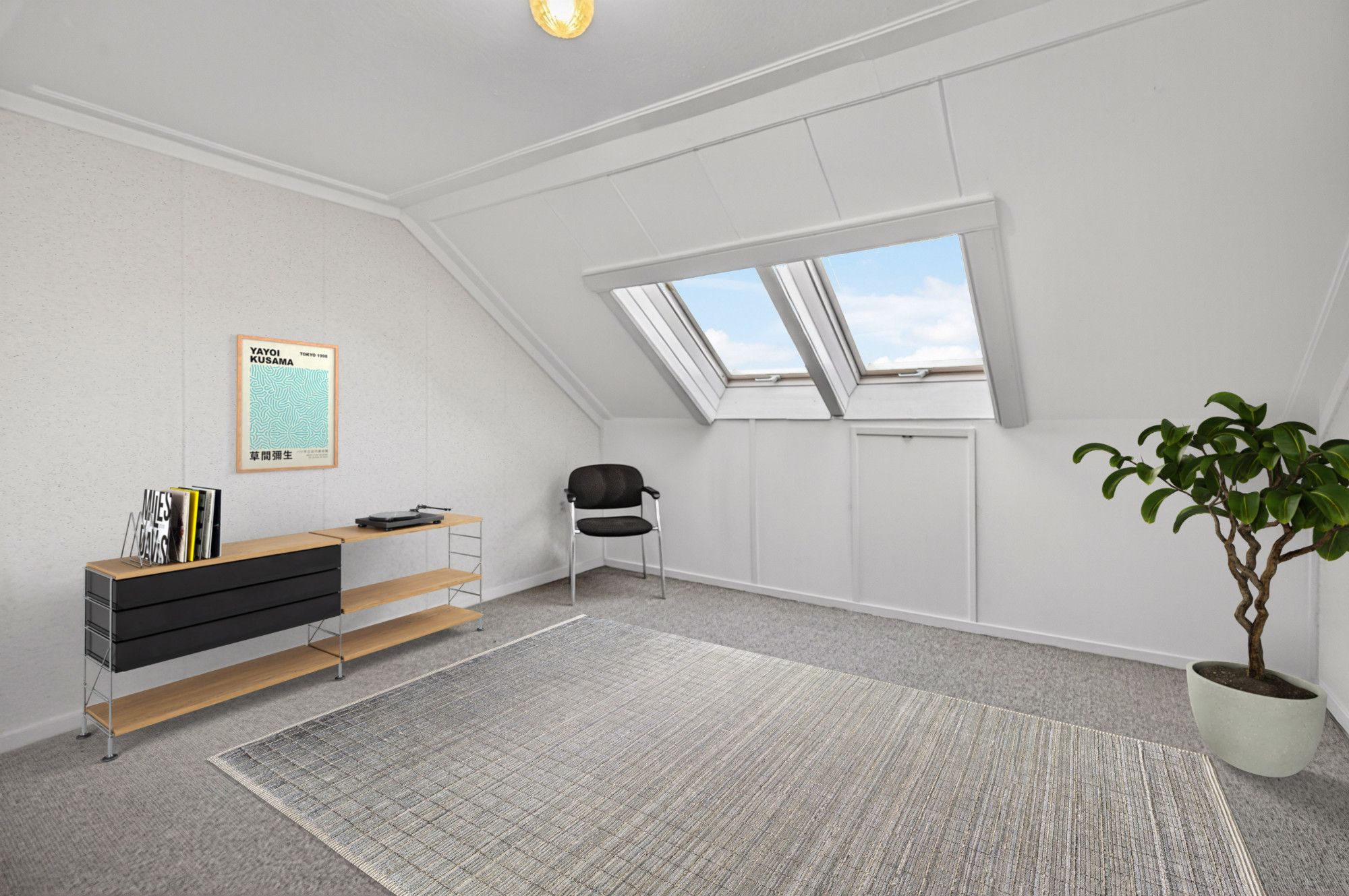 De vaste trap brengt je naar de zolderverdieping. Hier vind je een overloop met toegang tot een extra slaapkamer met twee dakramen, een Cv-ruimte met Cv-ketel (nieuw geplaatst in augustus 2025) en een praktische berging. Ook deze slaapkamer is voorzien van vloerbedekking.
