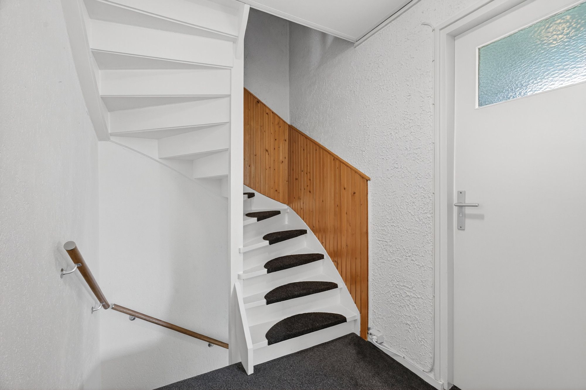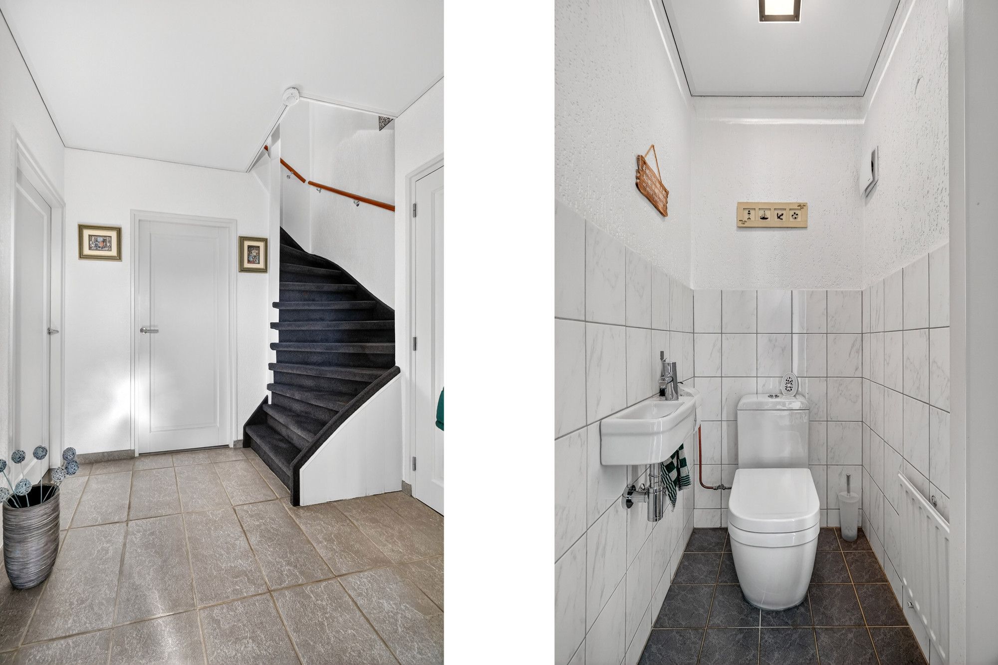 Je betreedt de woning via de verzorgde voortuin, waar zich de entree bevindt. In de hal vind je de meterkast, garderobe en het half betegelde toilet met fonteintje. Vanuit de hal heb je toegang tot de woonkamer, de keuken en de vaste trap naar de eerste verdieping.