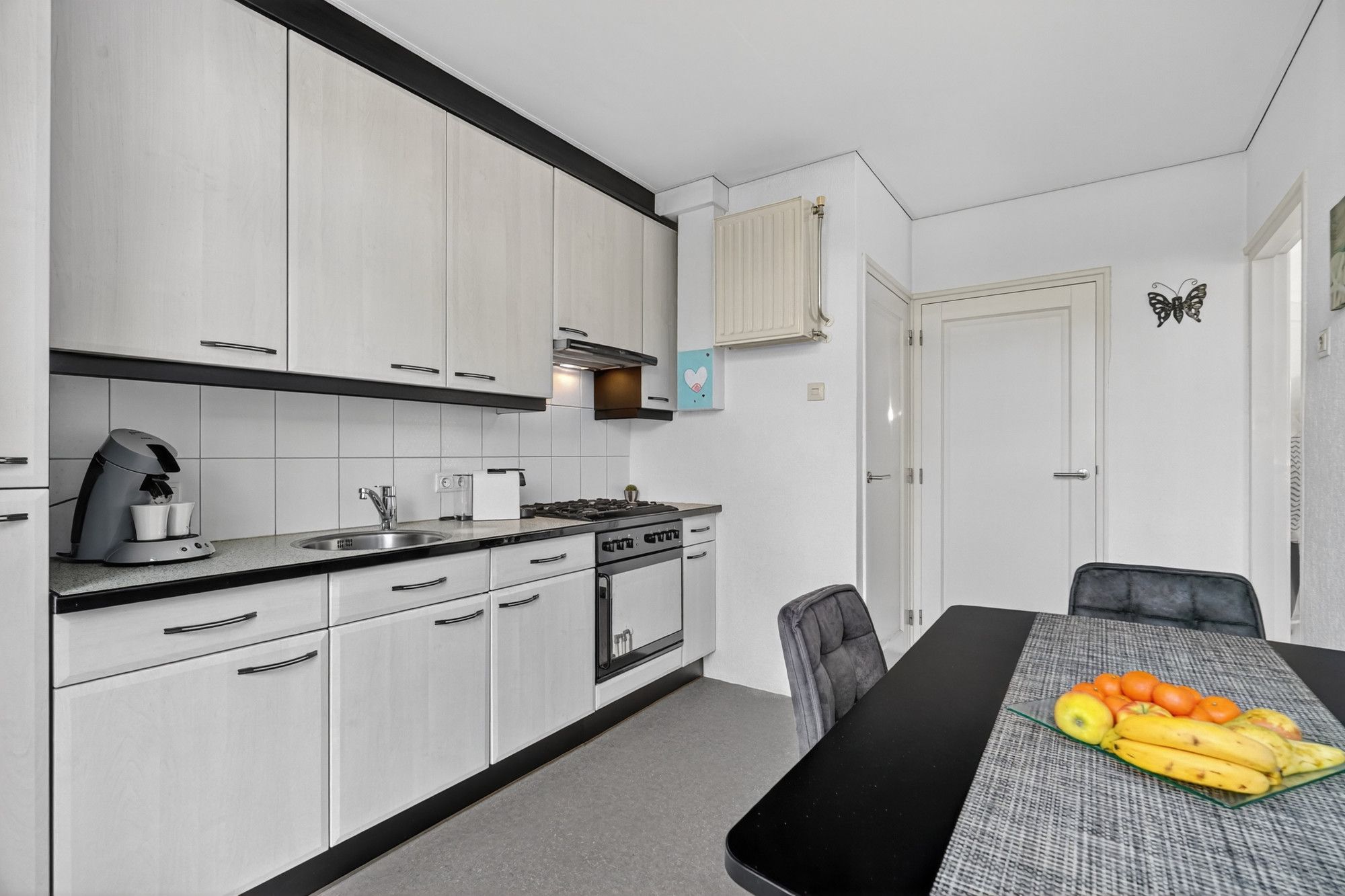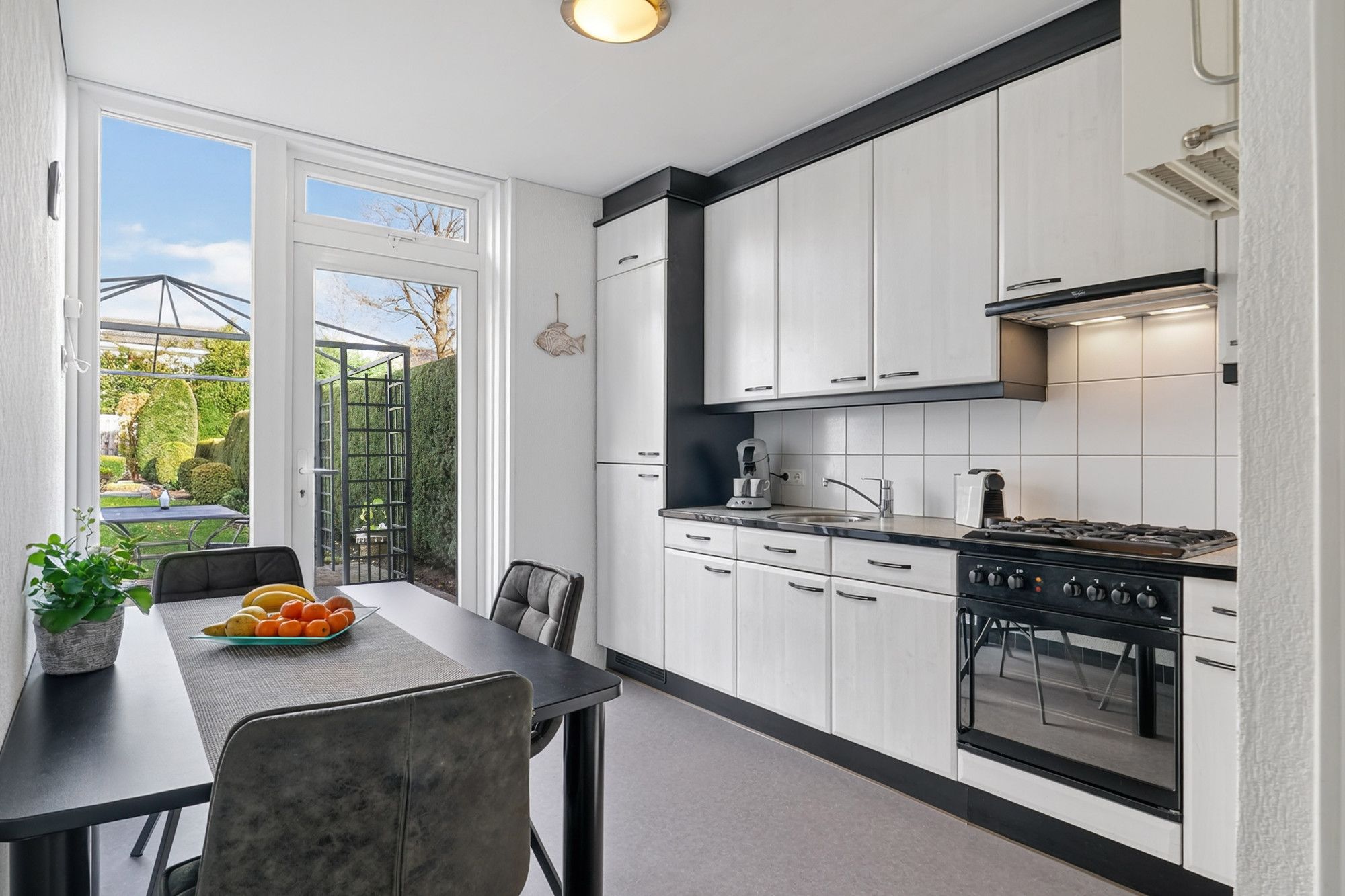 De keuken is uitgerust met boven- en onderkastjes, een wasbak, 4-pits gasfornuis, afzuigkap, koelkast en vriezer. Ook is er een praktische trapkast aanwezig. Vanuit de keuken bereik je eveneens de tuin.