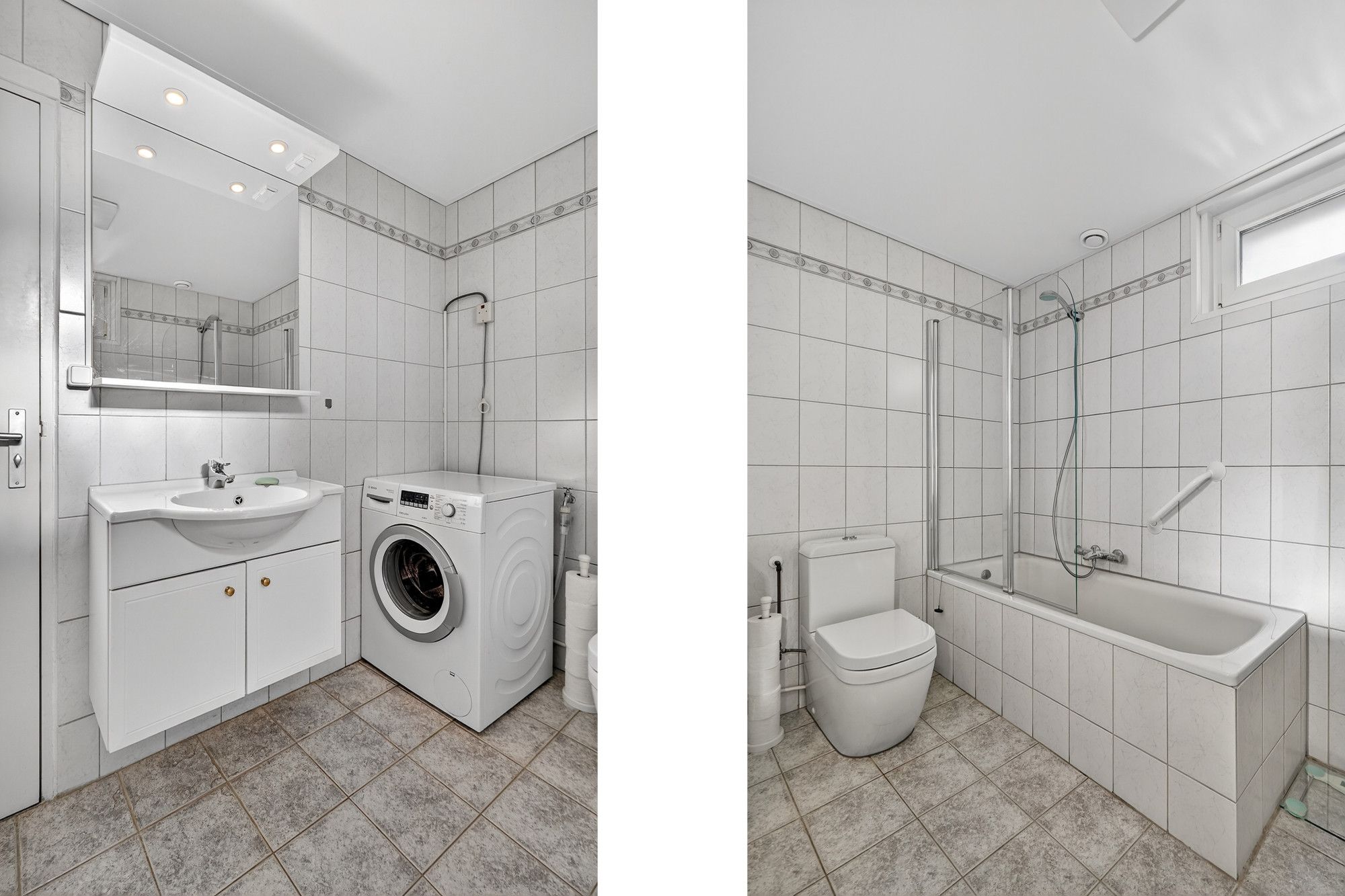 De badkamer is volledig betegeld en uitgerust met een ligbad met douchewand, een toilet en een wastafel met meubel. Deze verdieping is voorzien van vloerbedekking.