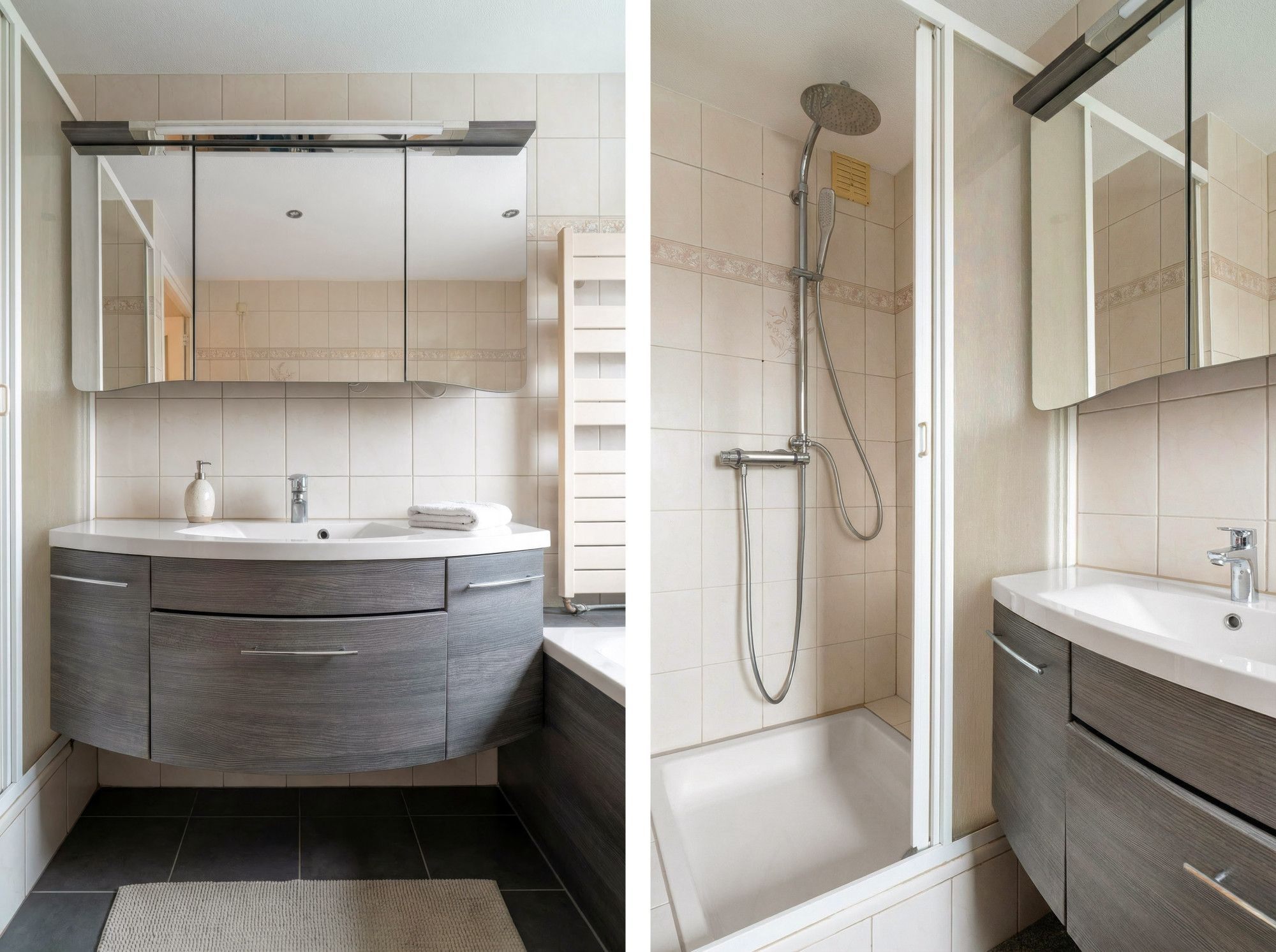 Op de eerste verdieping vindt u twee ruime slaapkamers en kleedkamer aan, allen met laminaatvloer en handmatige rolluiken. De overloop beschikt over een airco voor aangenaam comfort. De betegelde badkamer is voorzien van een ligbad, toilet, douche en vaste wastafel met meubel. Vanuit de overloop is tevens een de vaste trap naar de tweede verdieping.