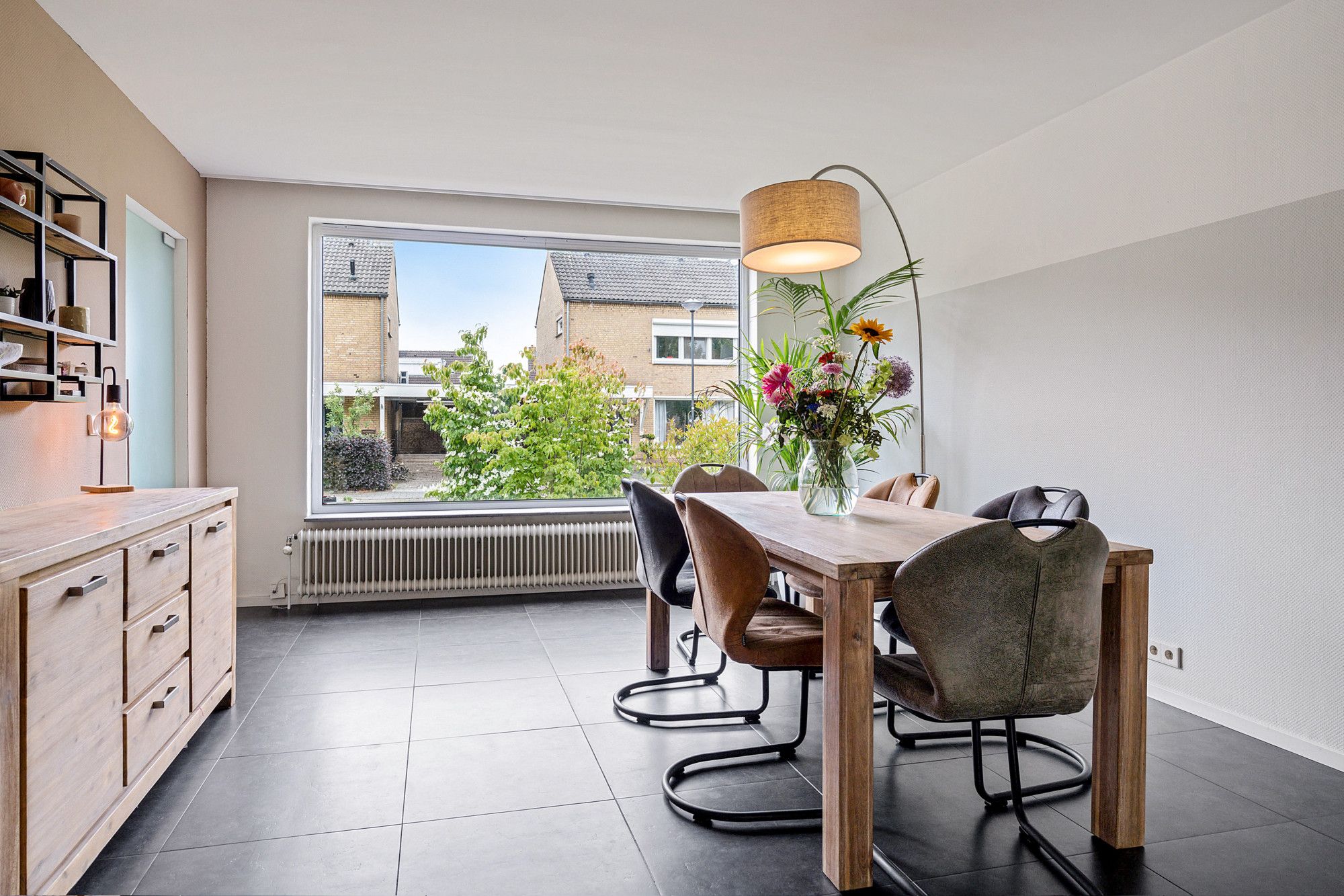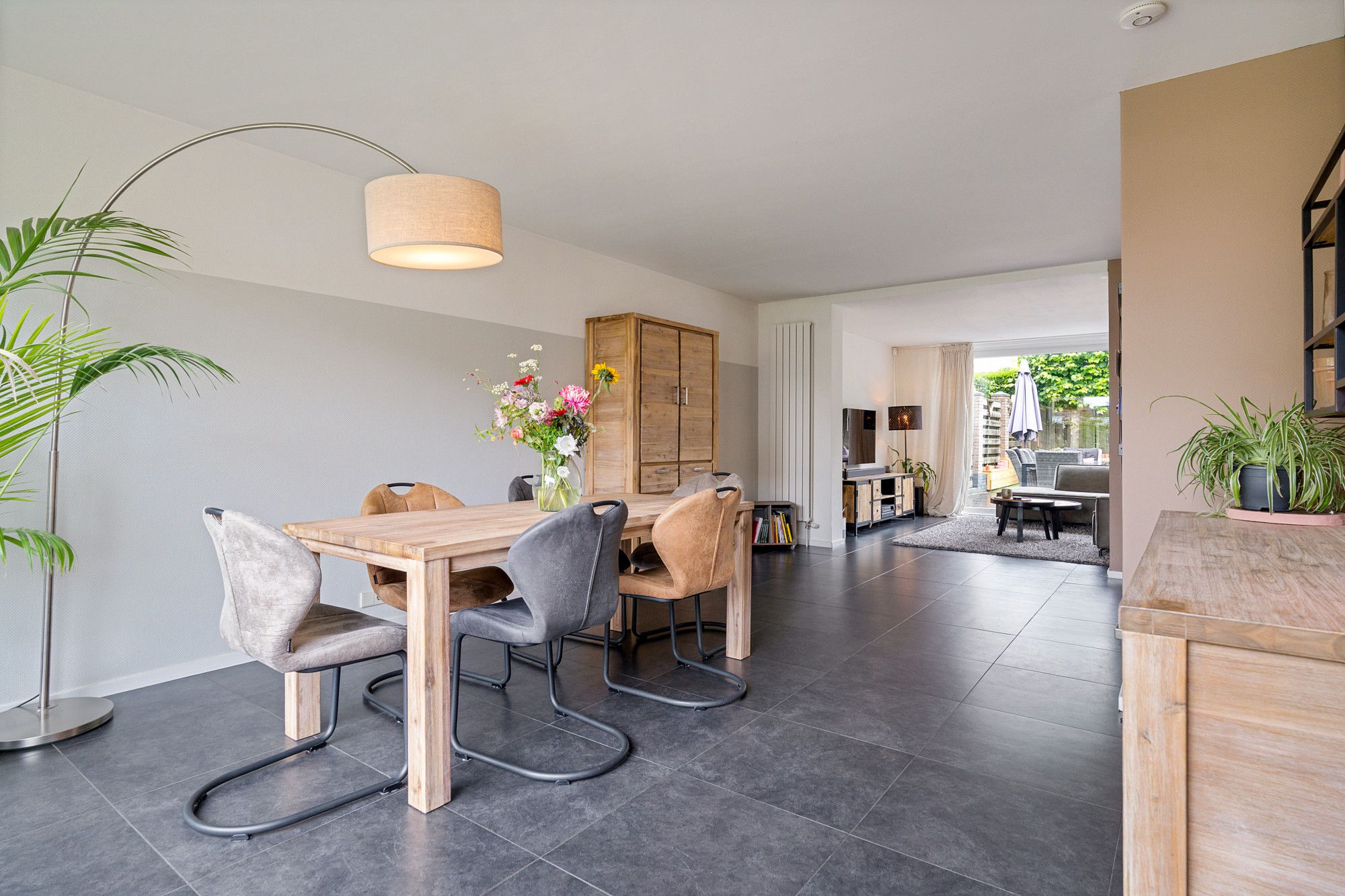 Je komt binnen in de hal, waar zich de meterkast, het toilet en de trap naar boven bevinden. Vanuit de hal stap je de royale eetkamer binnen (ca. 4,15 x 6,99 m), die naadloos overloopt in de gezellige woonkamer (ca. 3,65 x 6,10 m). Dankzij de grote raampartij is het hier heerlijk licht.