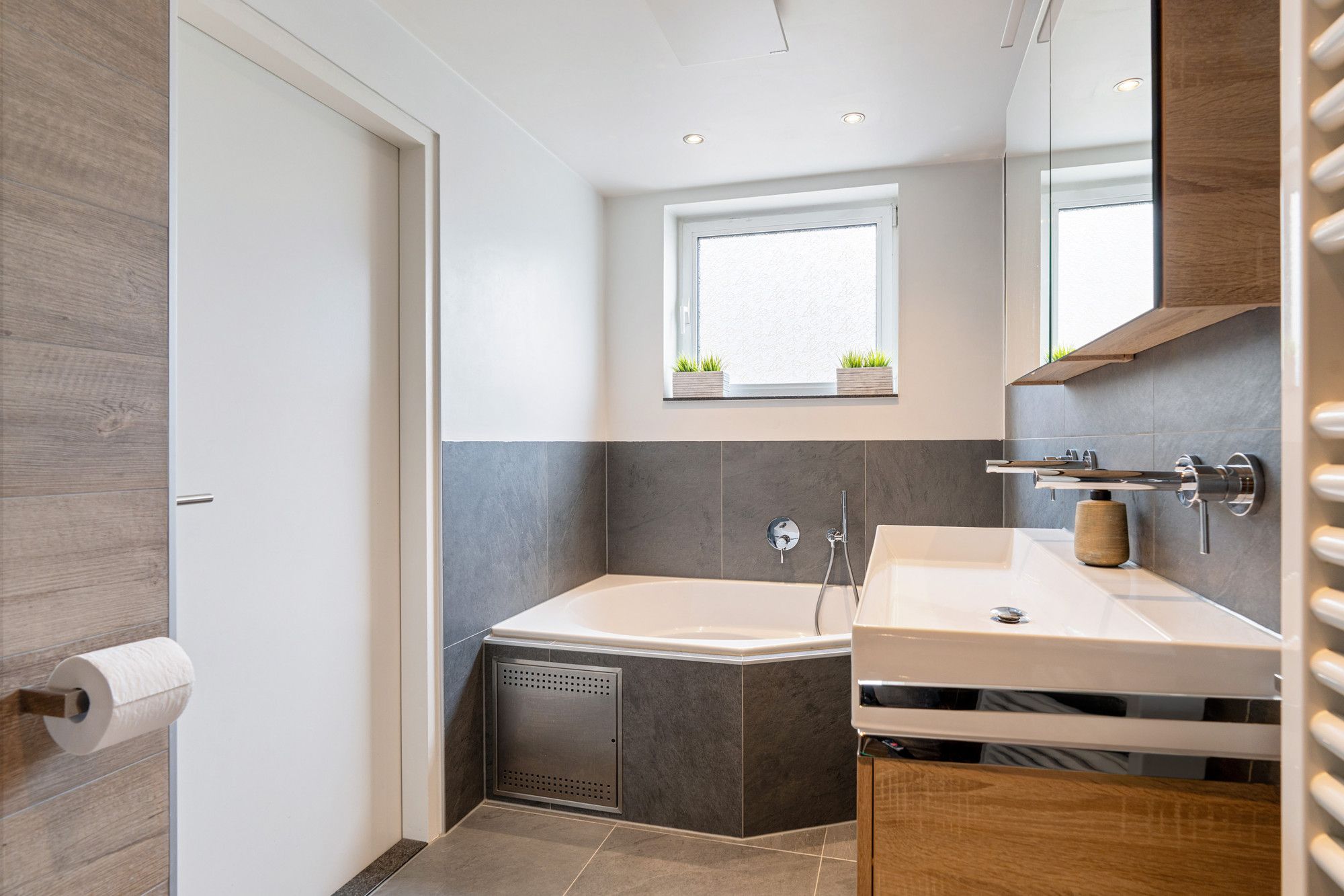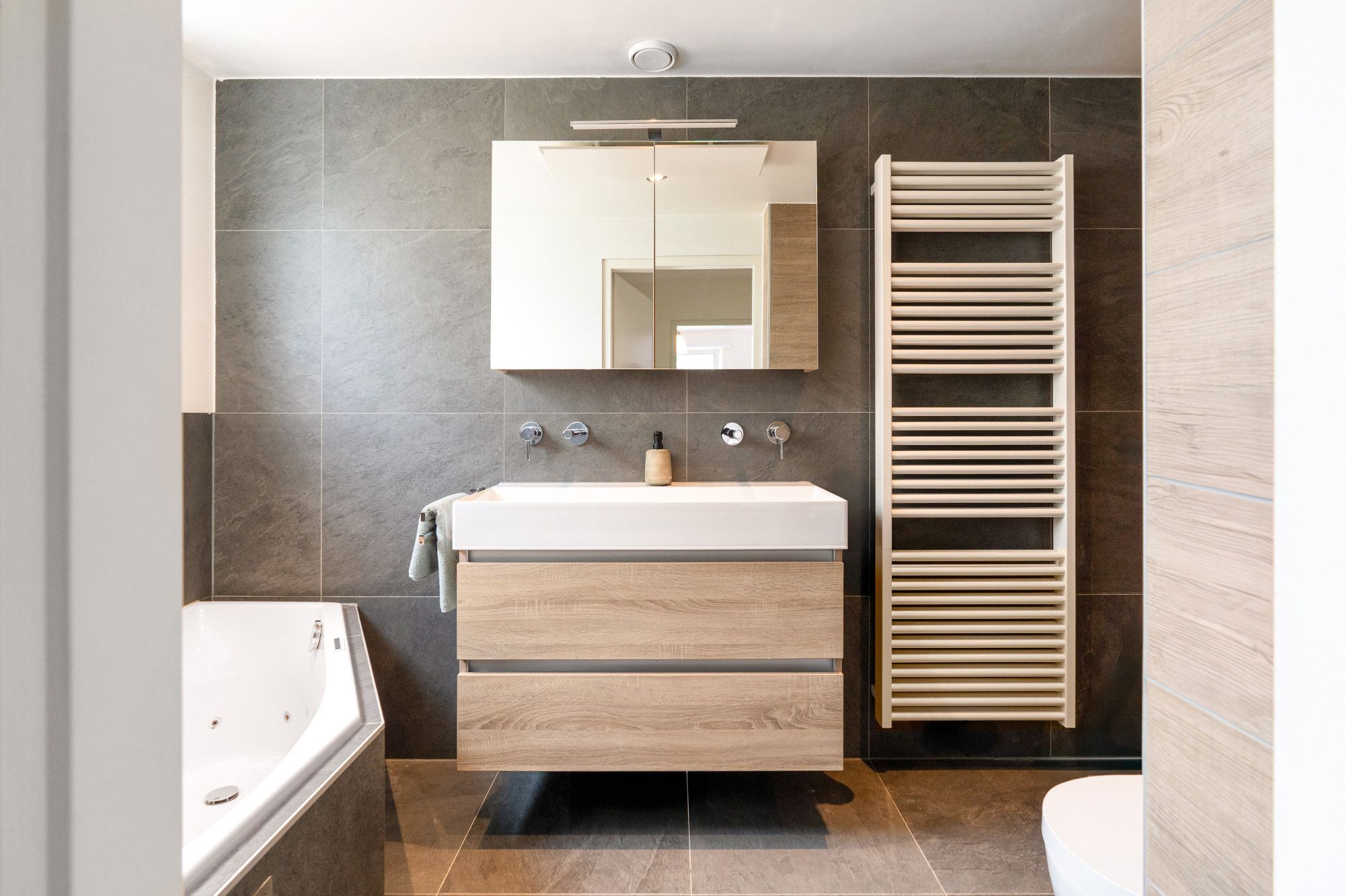 De ruime badkamer (ca. 1,64 x 3,72 m) is voorzien van een ligbad met jets, een inloopdouche, een toilet en een wastafel.