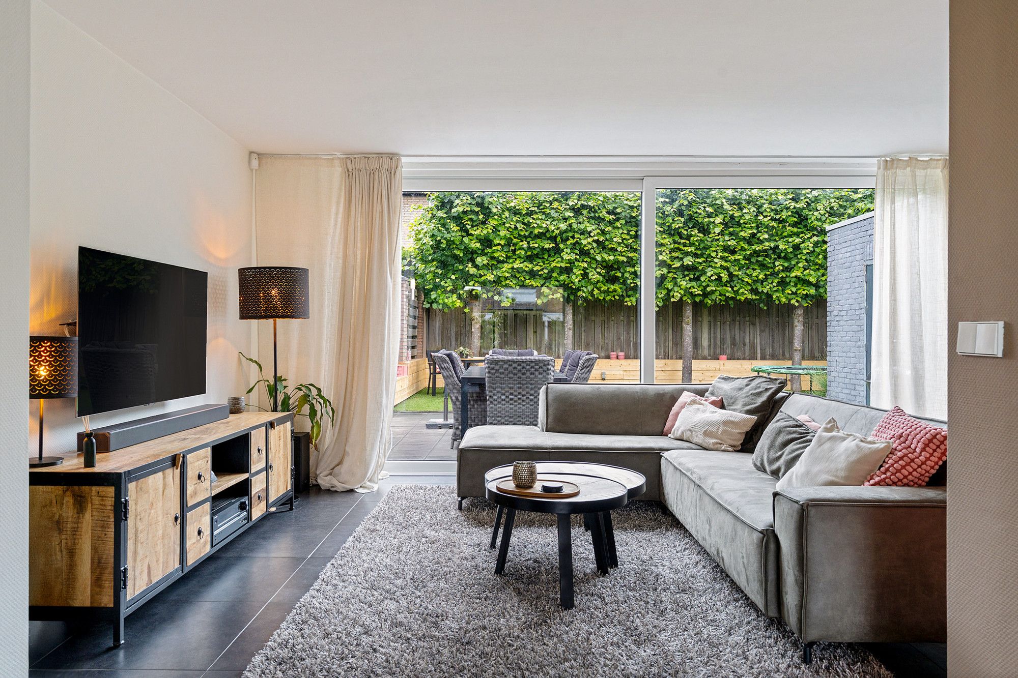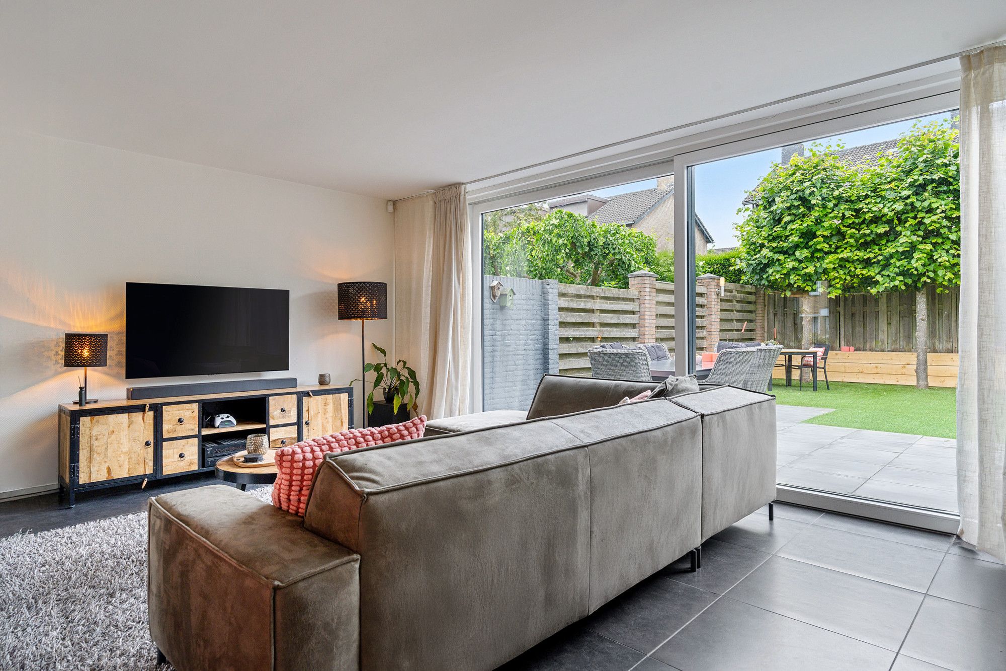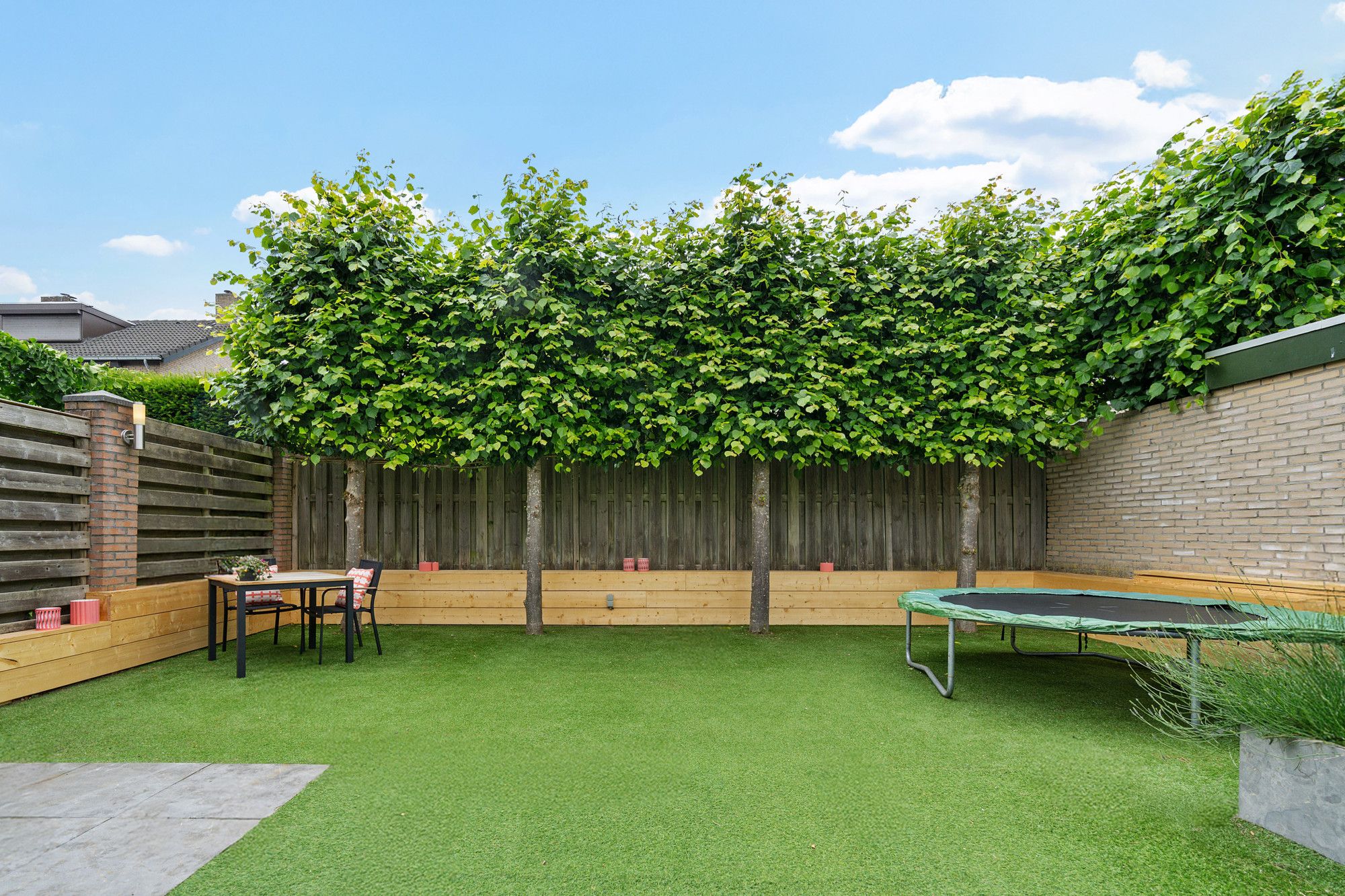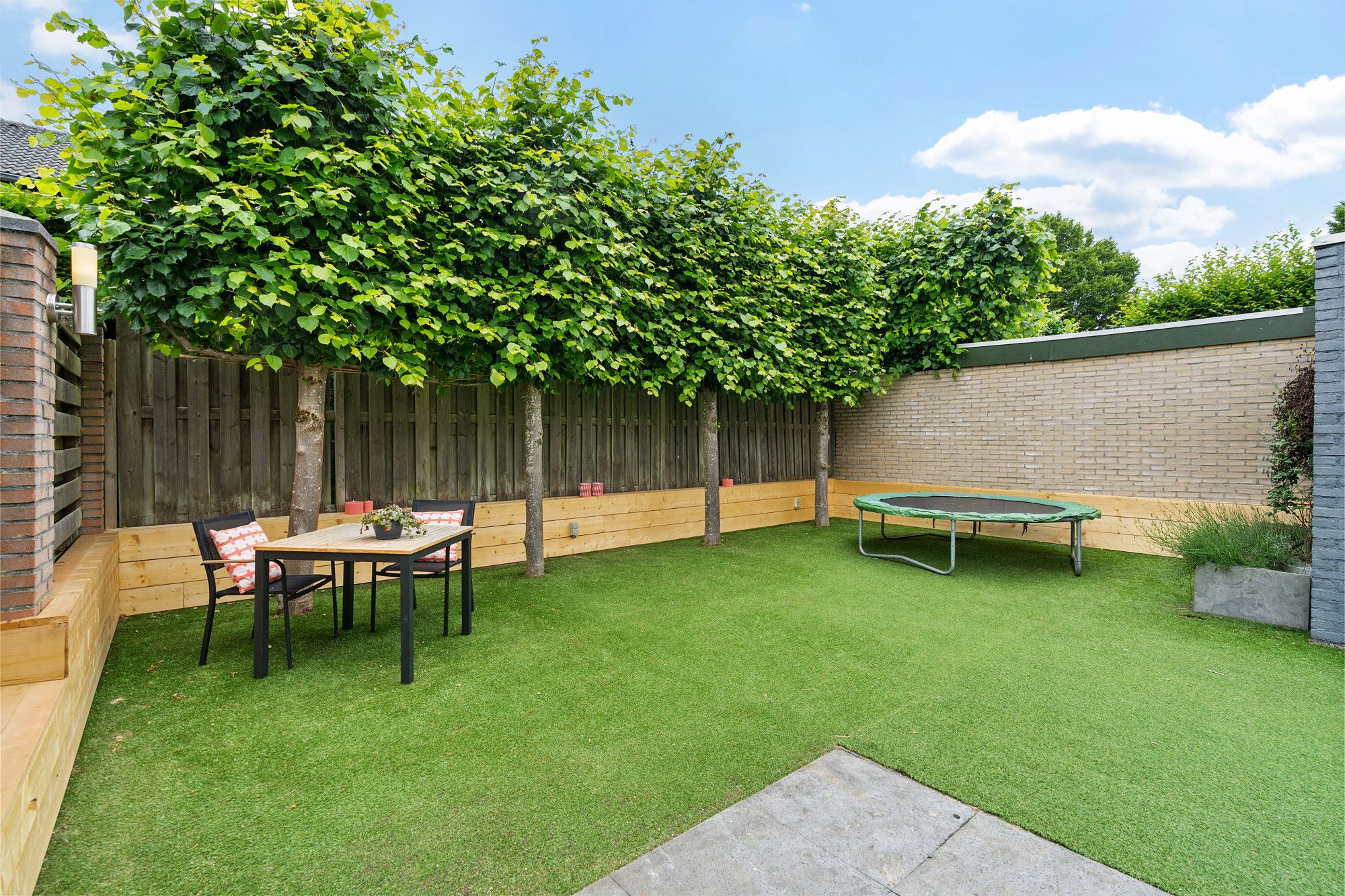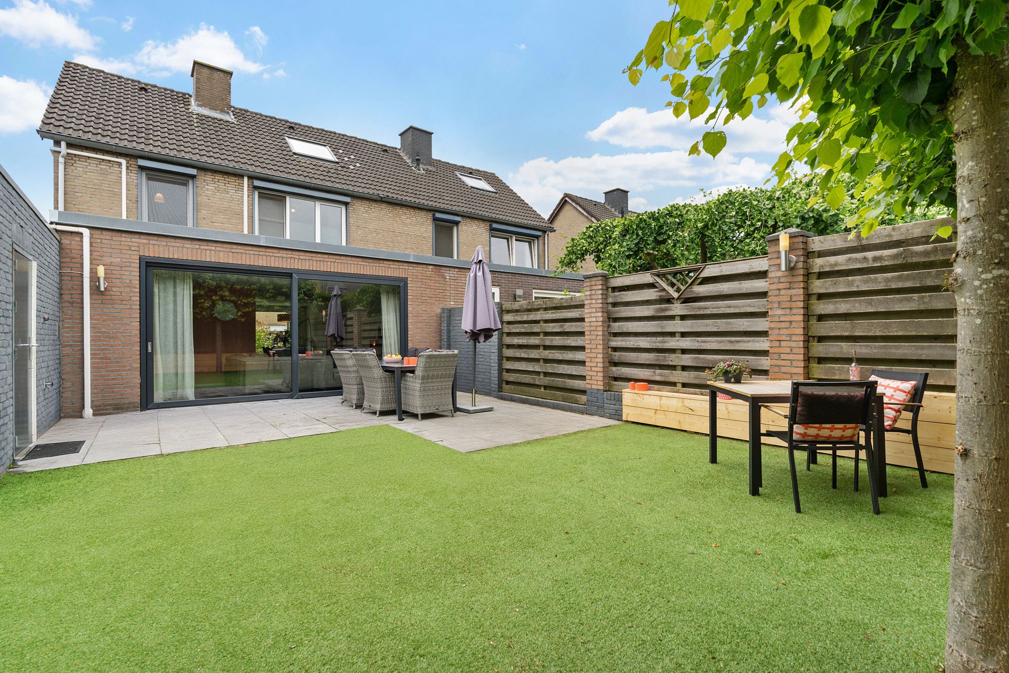 De achtertuin is onderhoudsvriendelijk aangelegd met kunstgras en heeft twee gezellige zitgedeeltes. Of je nu wilt zonnen, barbecueën of gewoon lekker buiten zitten: hier is alle ruimte voor ontspanning. Door de boompjes aan de achterzijde geniet u optimaal van de privacy.