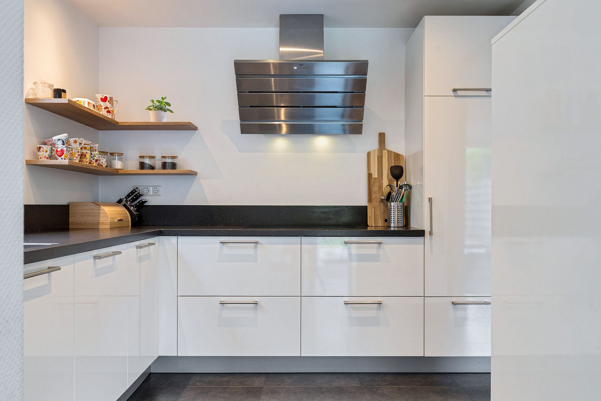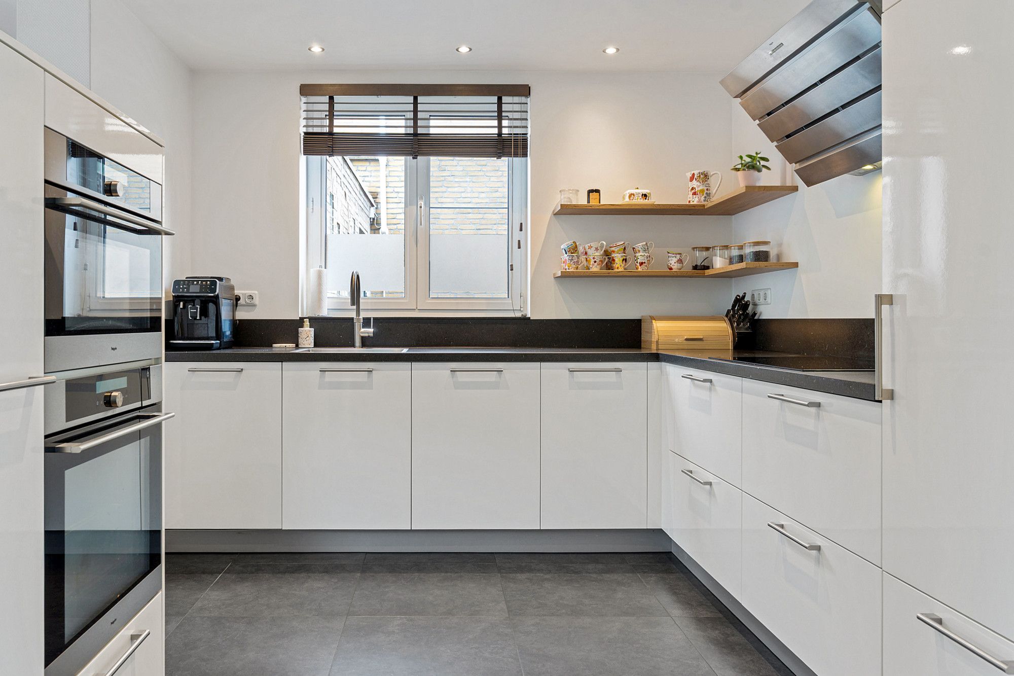 De open keuken (ca. 3,04 x 2,99 m) is van alle gemakken voorzien: een inductiekookplaat, wasemkap, vaatwasser, magnetron en stoomoven. Bovendien is er een Quooker-kraan voor direct kokend water. Vanuit de woonkamer loop je via de schuifpui direct de tuin in, waardoor binnen en buiten mooi in elkaar overlopen. In de aanbouw is tevens een airco, voor een aangenaam klimaat, zowel om te koelen als te verwarmen.