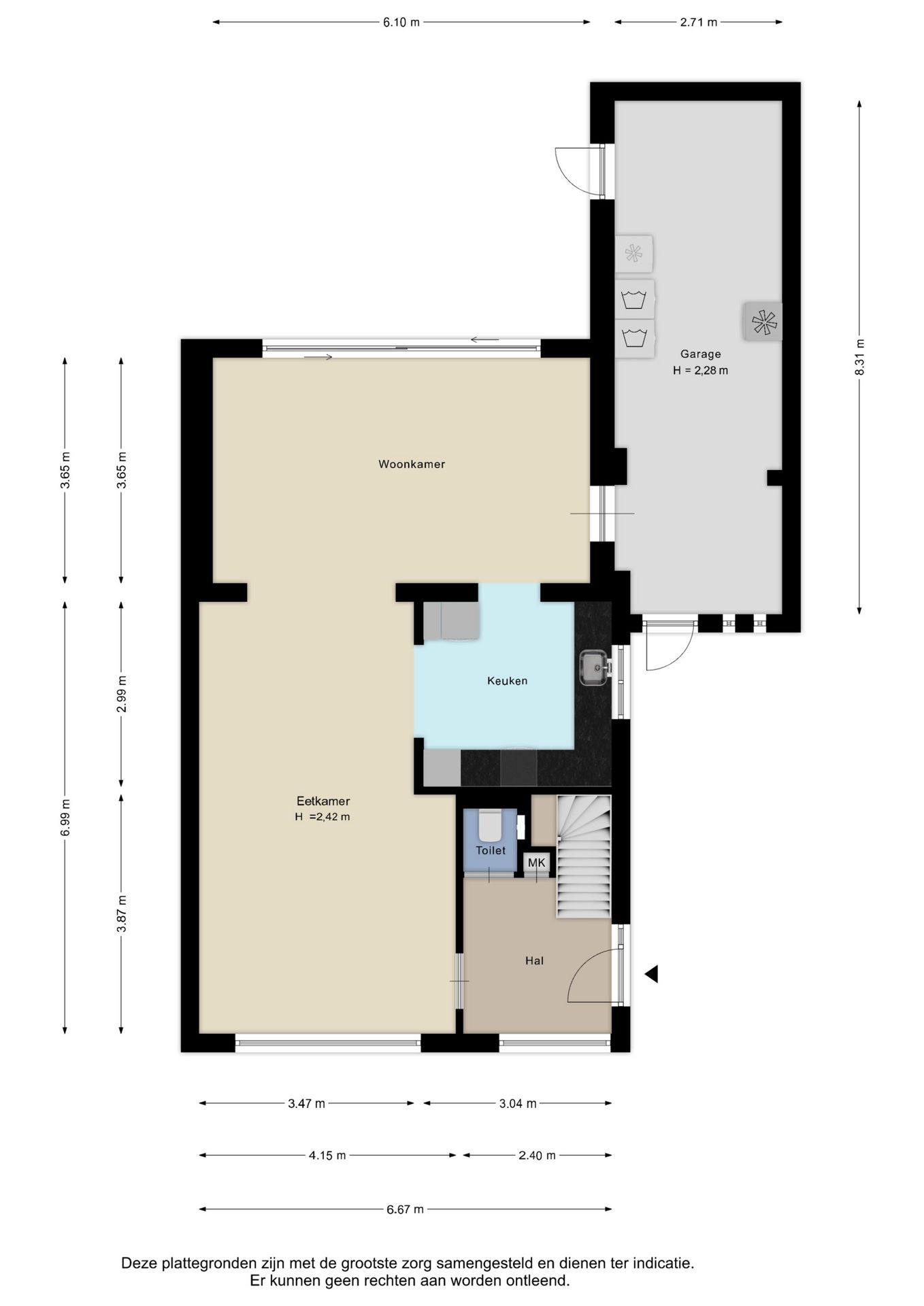 Alle door ons kantoor verstrekte informatie omtrent onroerende zaken, moet beschouwd worden als een uitnodiging om in onderhandeling te treden, en is geheel vrijblijvend! Alle vermelde maten en afmetingen zijn slechts bij benadering. Aan deze beperkte info kunnen geen rechten worden ontleend. Indien in enige documentatie of op enige website informatie staat die niet overeen komt met de werkelijkheid, dan geldt de feitelijke situatie waarin de woning zich bevindt, zoals koper deze tijdens de bezichtiging heeft kunnen waarnemen, en wordt de woning in deze feitelijke situatie/staat verkocht. Een (eventueel) bijgevoegde plattegrond dient uitsluitend als globale indicatie/visualisatie. Hieraan kunnen uitdrukkelijk geen rechten worden ontleend.