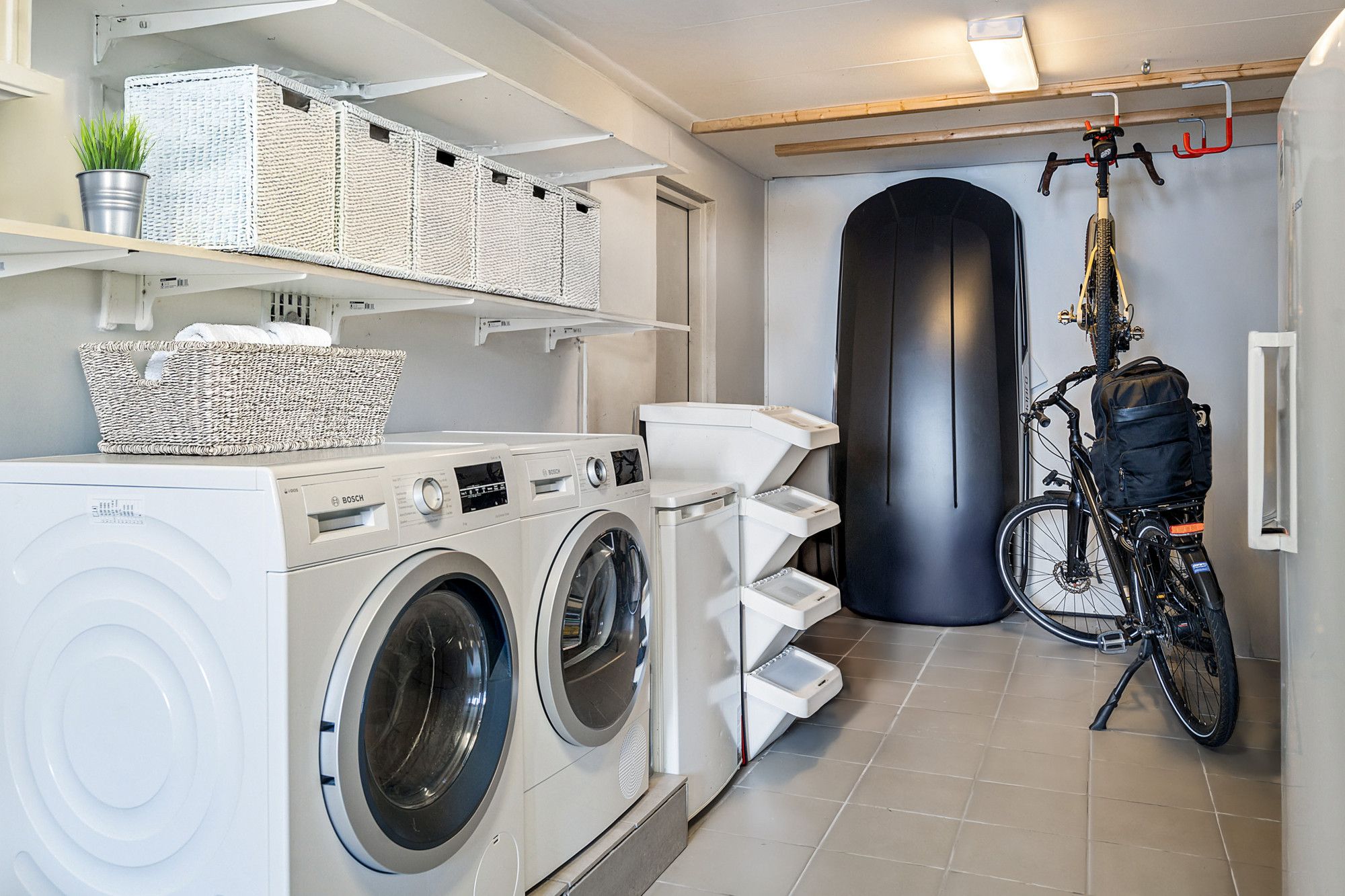 De ruime garage (ca. 8,31 x 2,71 m) is toegankelijk vanuit de woonkamer en beschikt over aansluitingen voor de wasmachine, droger, koelkast en diepvries. Tevens is er een loopdeur naar de tuin.