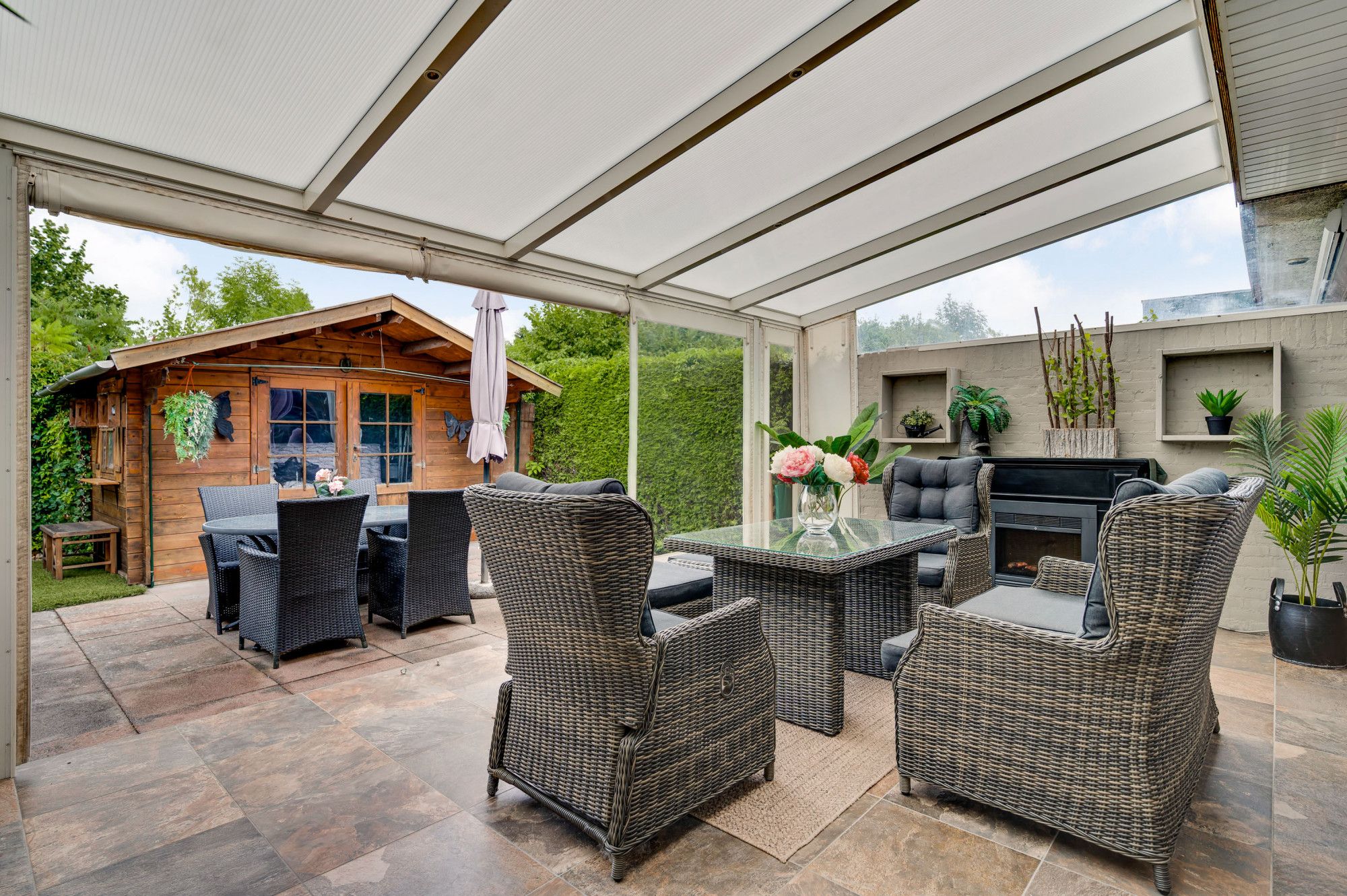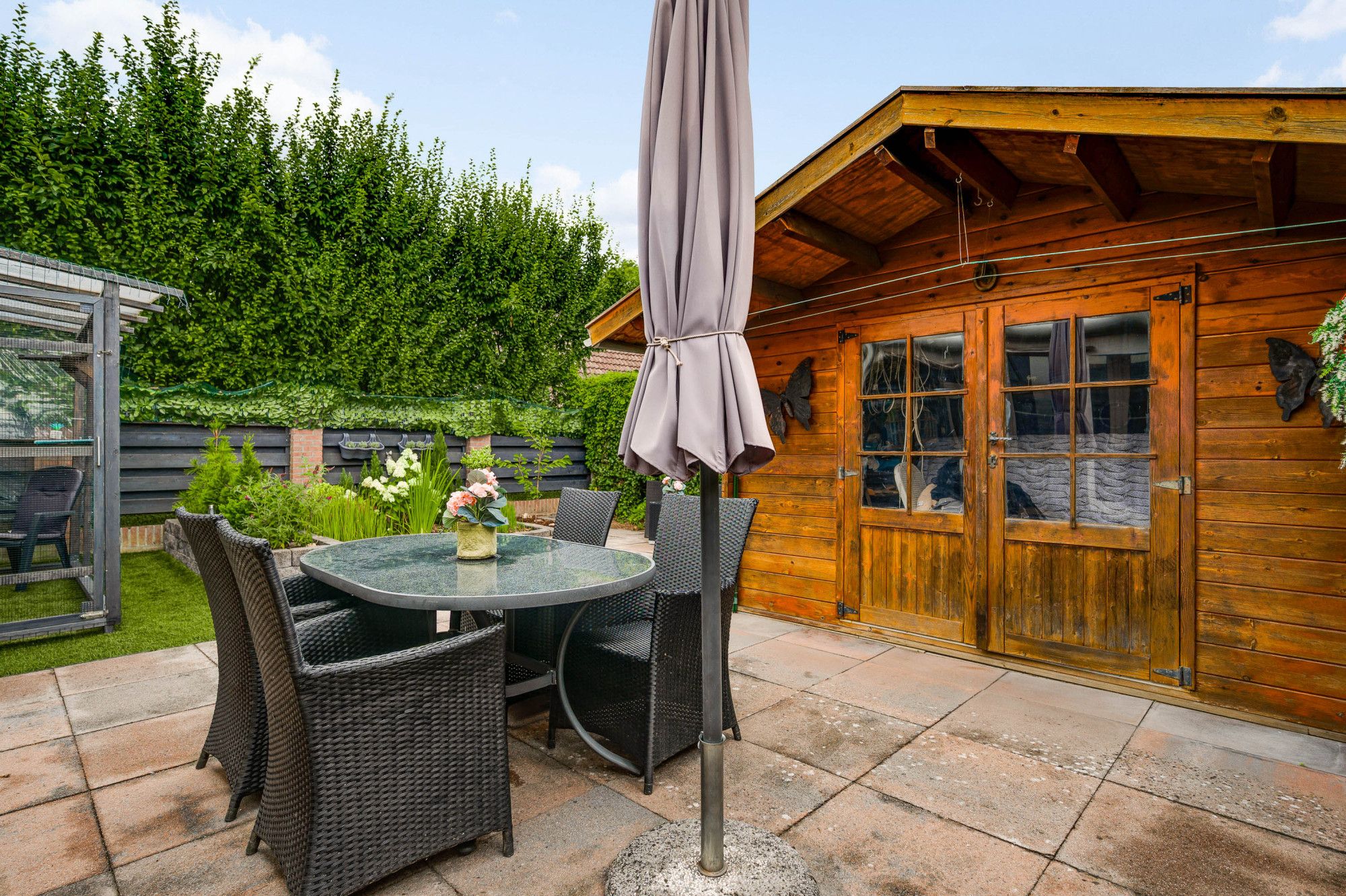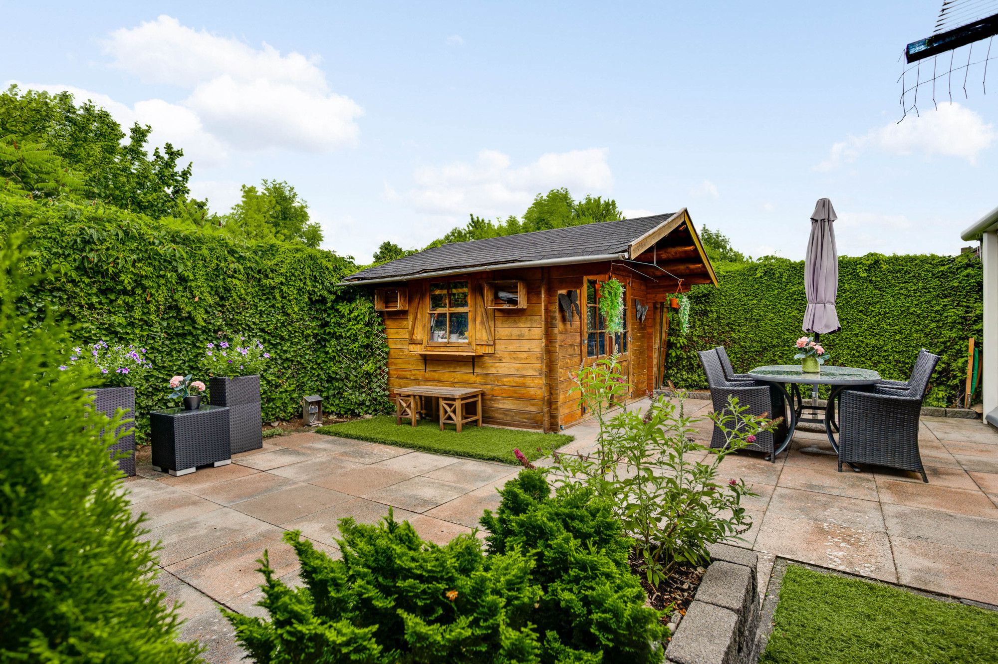 De achtertuin is een heerlijke plek om te ontspannen. Hier vind je een ruime overkapping, een houten tuinhuis, gazon, bestrating en beplanting. Dankzij de vrije ligging is er altijd een fijne plek in de zon of juist in de schaduw. Aan de voorzijde bevindt zich een onderhoudsvriendelijke voortuin met een oprit naar de garage.