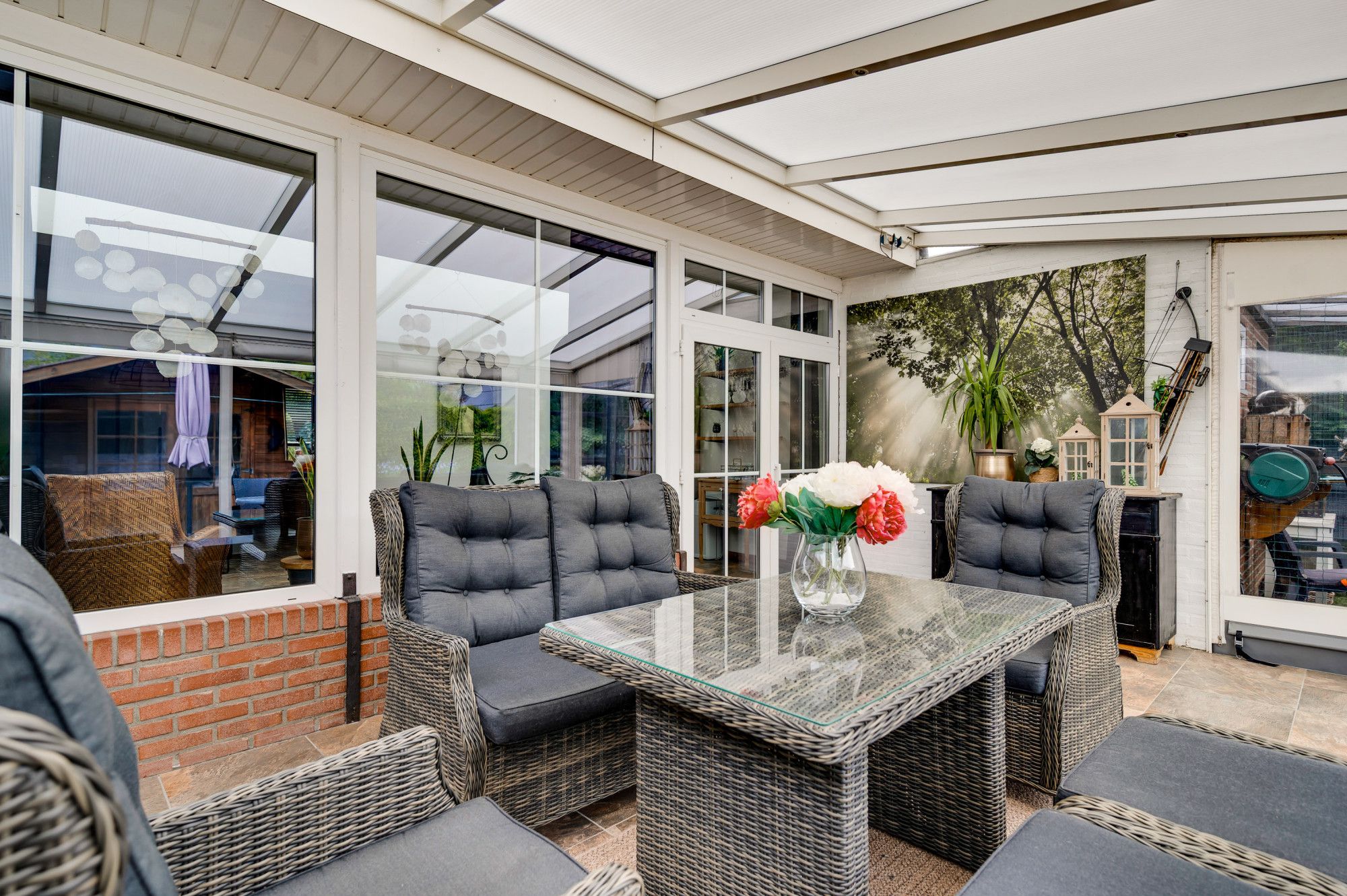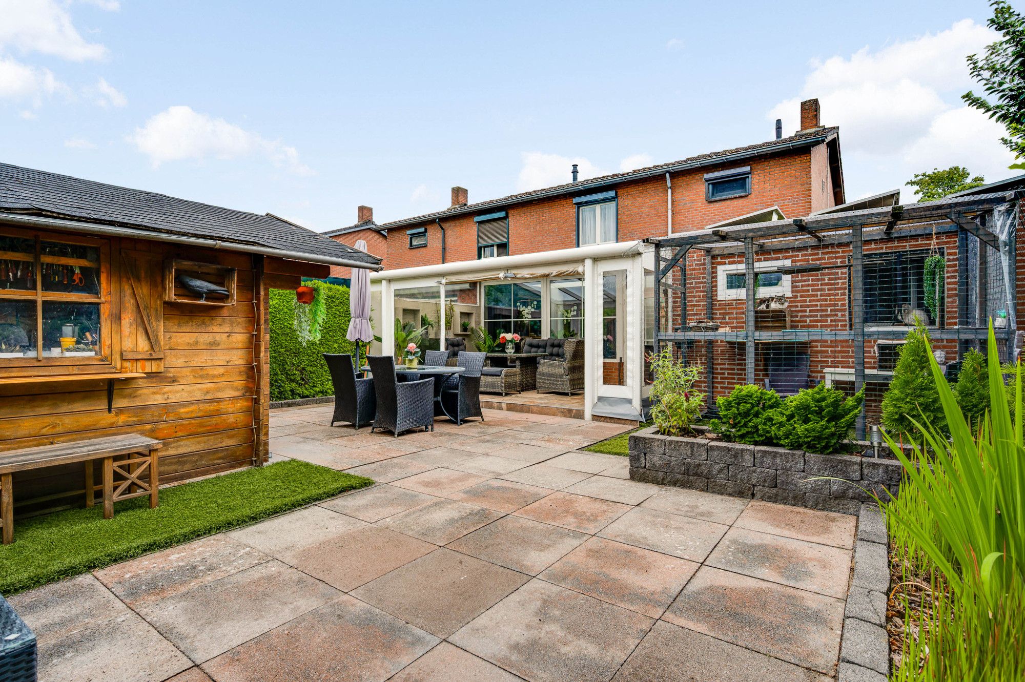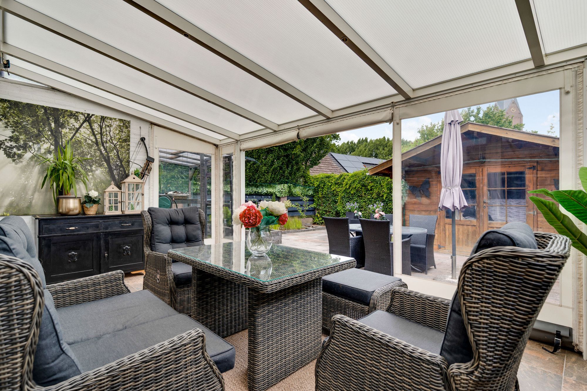 De achtertuin is een heerlijke plek om te ontspannen. Hier vind je een ruime overkapping, een houten tuinhuis, gazon, bestrating en beplanting. Dankzij de vrije ligging is er altijd een fijne plek in de zon of juist in de schaduw. Aan de voorzijde bevindt zich een onderhoudsvriendelijke voortuin met een oprit naar de garage.