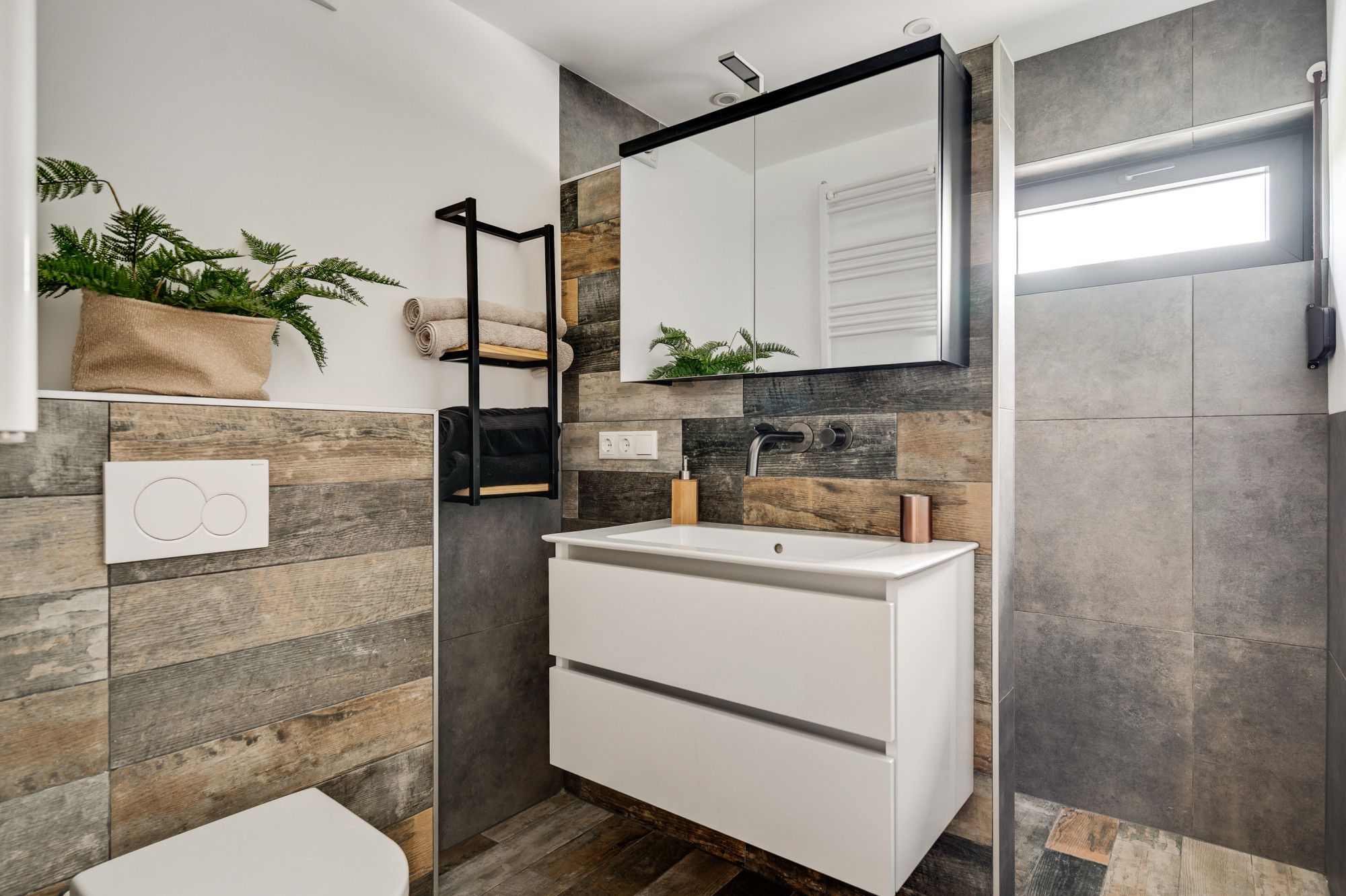 Op de eerste verdieping bevinden zich nog drie volwaardige slaapkamers, waarvan één met airco en één met een handige muurkast. De badkamer is eveneens in 2023 vernieuwd en voorzien van een luxe inloopdouche, modern wastafelmeubel en toilet. Op de overloop bevindt zich nog een muurkast met de cv-installatie (Nefit HR, eigendom, ca. 2018) en de witgoedaansluitingen. De verdieping is, met uitzondering van de badkamer, afgewerkt met een laminaatvloer.