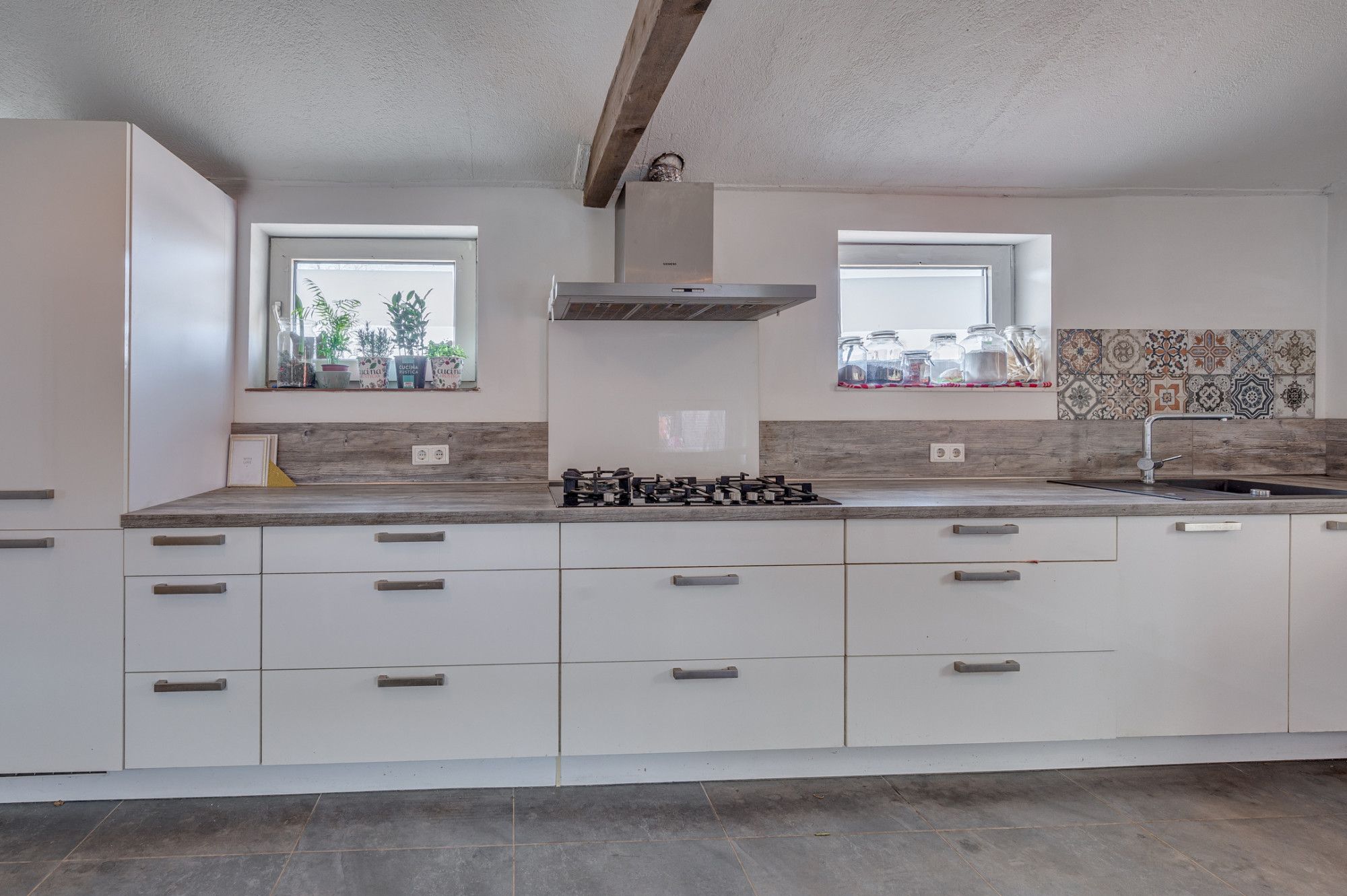 Vanuit een looppad is de entree van de woning te bereiken. De hal geeft toegang tot de trapopgang naar de 1e verdieping, meterkast en loopdeur naar de zitkamer. Aan de rechterzijde van de woning is de ruime woonkamer gelegen welke voorzien is van een houtkachel. Aan de linkerzijde van de woning is de zitkamer met bijvoorbeeld kantoor etc. gelegen. Middels een loopdeur is er toegang tot de hal welke vanuit de tuin ook te bereiken is. Hier is er toegang tot de separate toiletruimte welke is voorzien van een zwevend toilet, fonteintje en buitenraam. Vanuit de hal is er toegang tot de ruime woonkeuken. De keuken is in 2017 vernieuwd en voorzien van een 5-pits gasfornuis, afzuigkap, koelkast, vaatwasmachine en combioven/ magnetron, tevens is er zeer veel werk en opbergruimte. De keuken geeft toegang tot de CV-ketel welke in eigendom is en van het merk Intergas met bouwjaar 2017. De gehele begane grond is voorzien van een tegelvloer met vloerverwarming.