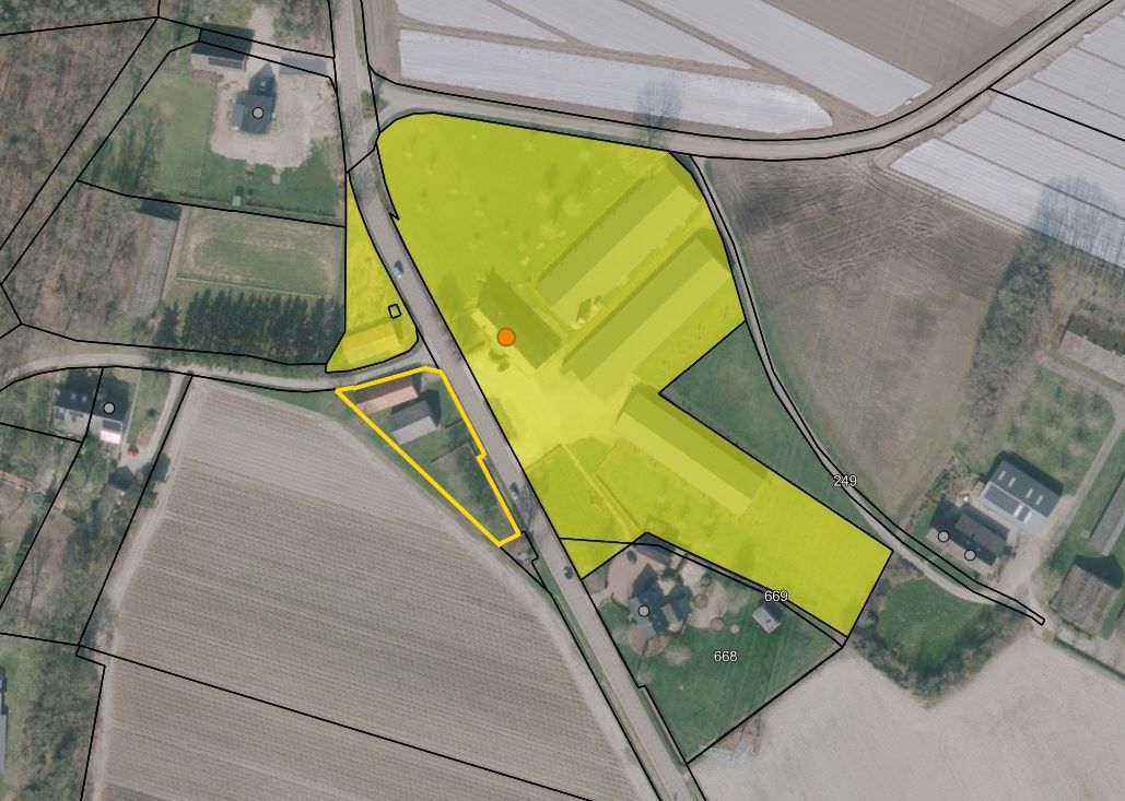 1. Een voormalige kippenstal die nu verhuurd wordt t.b.v. opslag (circa 60m x 16m)