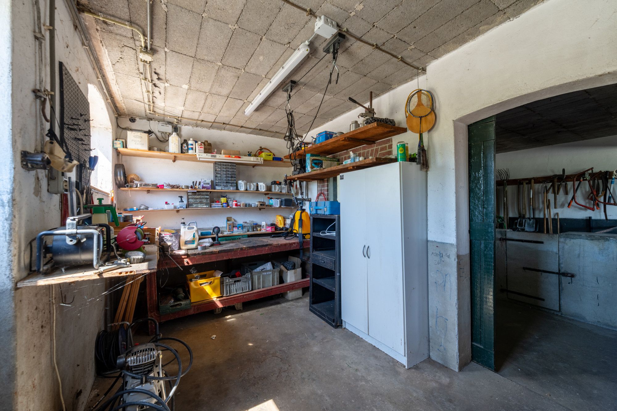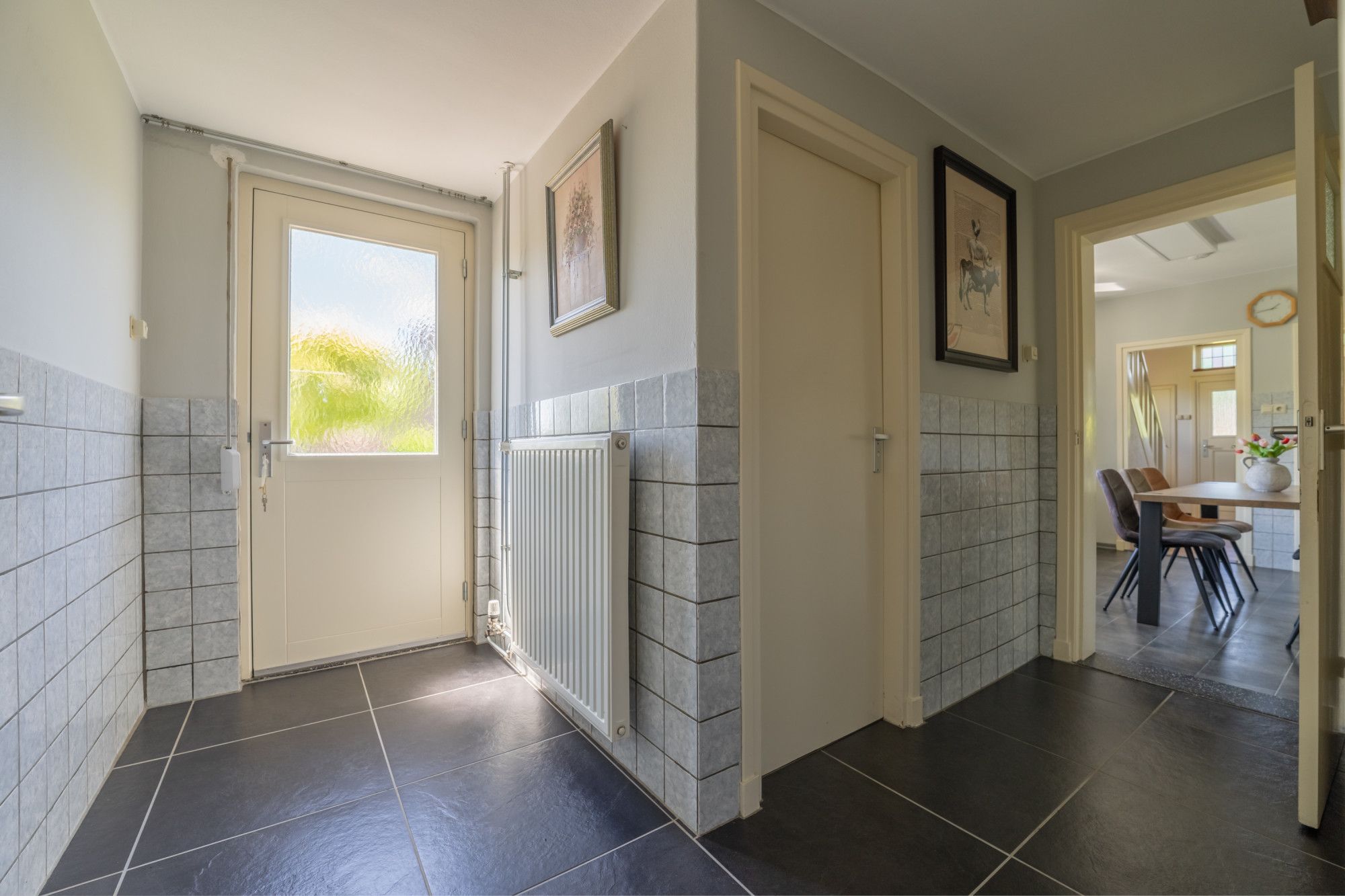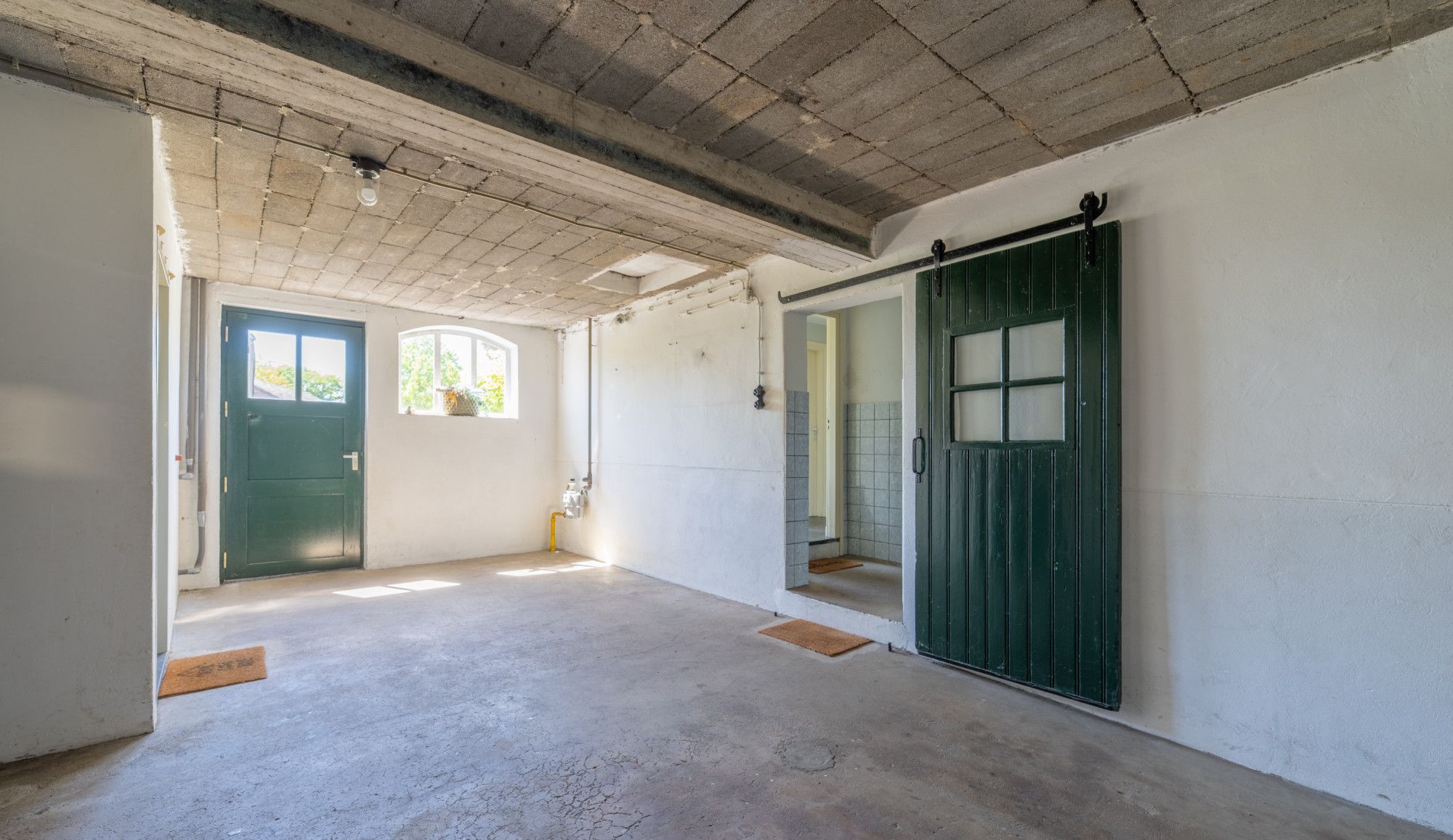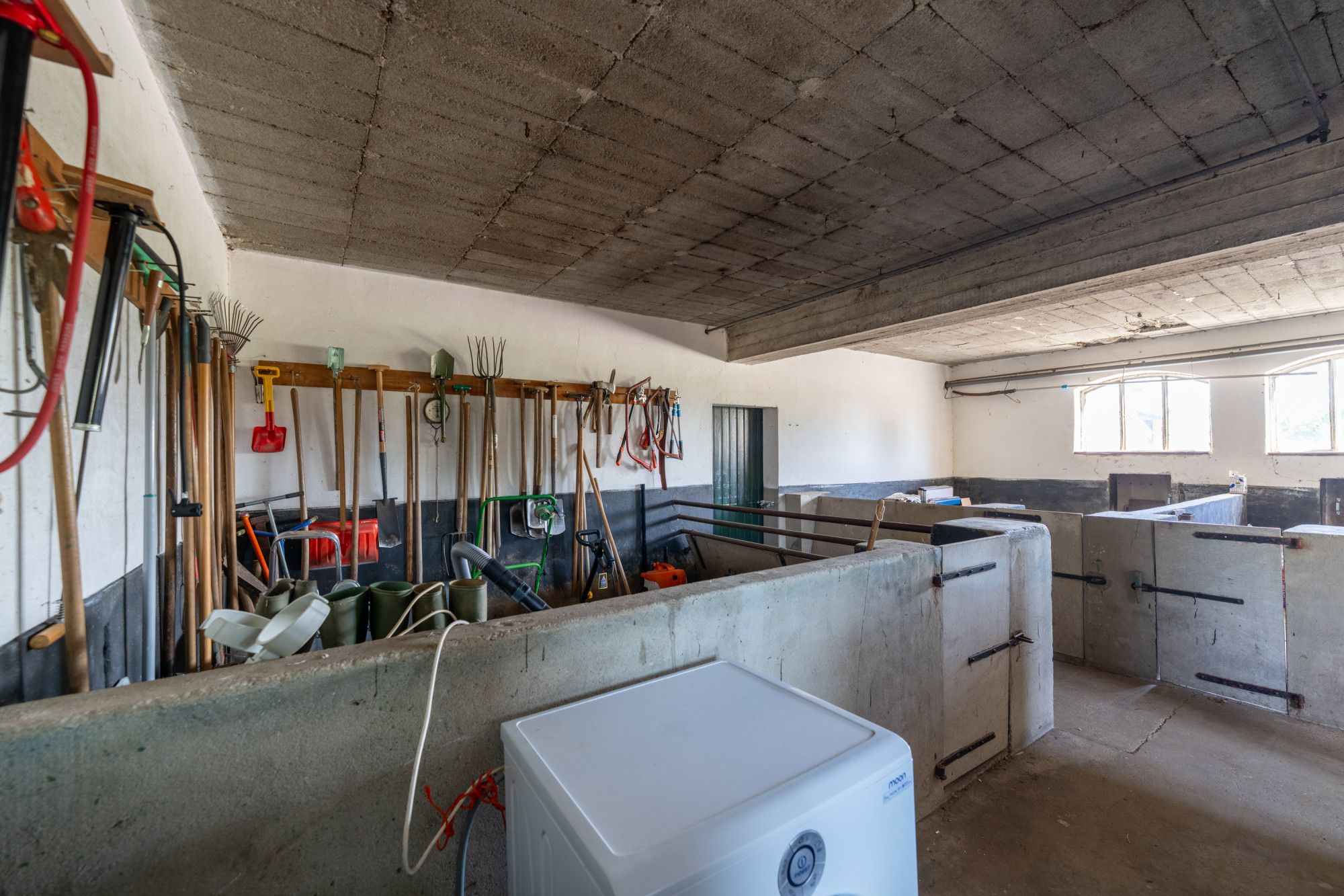 Vanuit de keuken is het achterportaal te bereiken, dit geeft toegang tot de toiletruimte, de badkamer op de begane grond, de bijkeuken en de tuin. De toiletruimte is geheel betegeld en voorzien van zwevend toilet en fonteintje. De badkamer is eveneens geheel betegeld en uitgerust met ligbad, inloopdouche en wastafel. De bijkeuken is voorzien van witgoedaansluitingen en geeft toegang tot de diverse inpandig bergingen/stallen en kantoorruimte. Tevens bevindt zich in de bijkeuken een trapopgang naar de zolder welke is gelegen boven de inpandige bergingen/stallen en het kantoor.