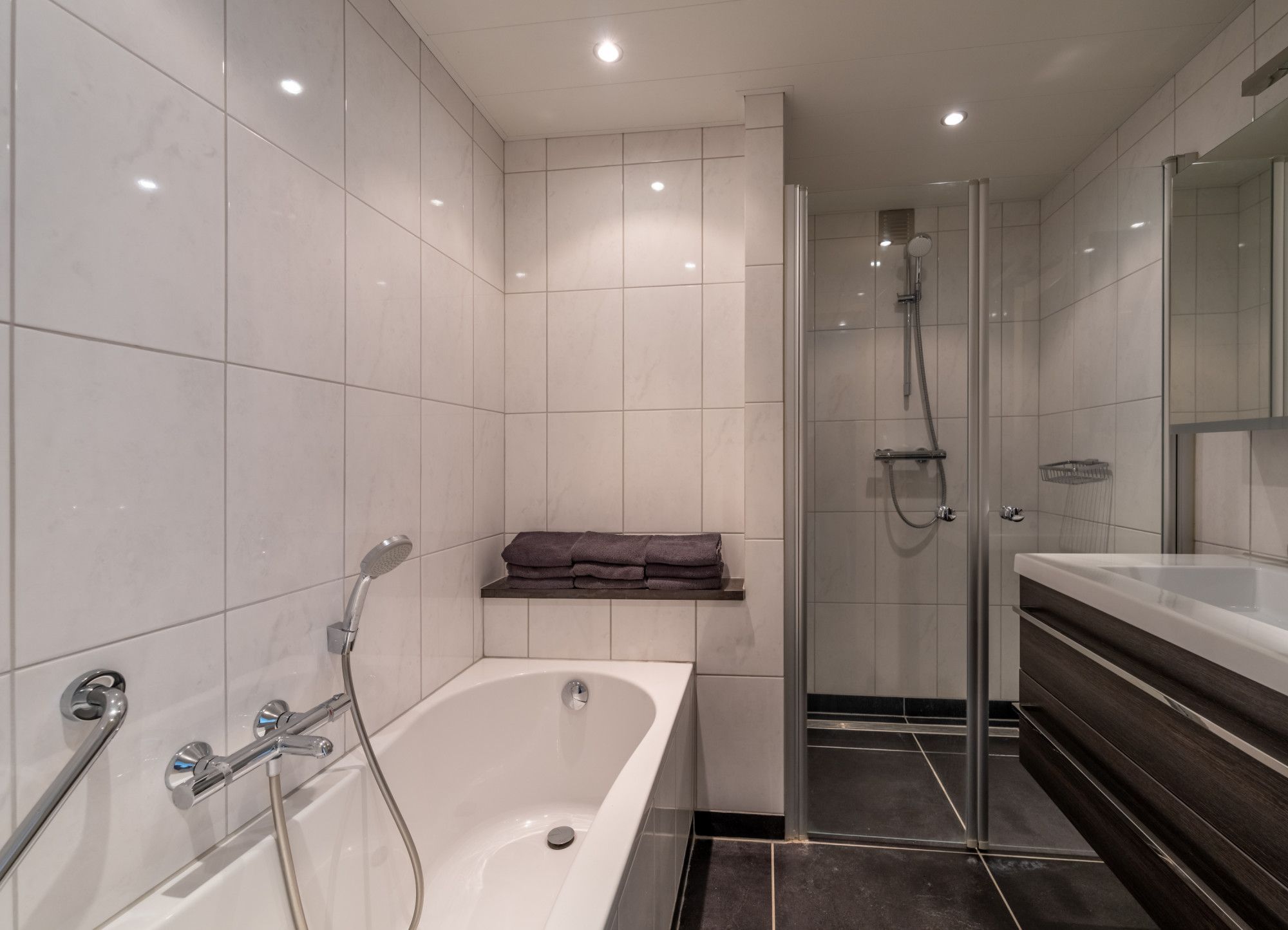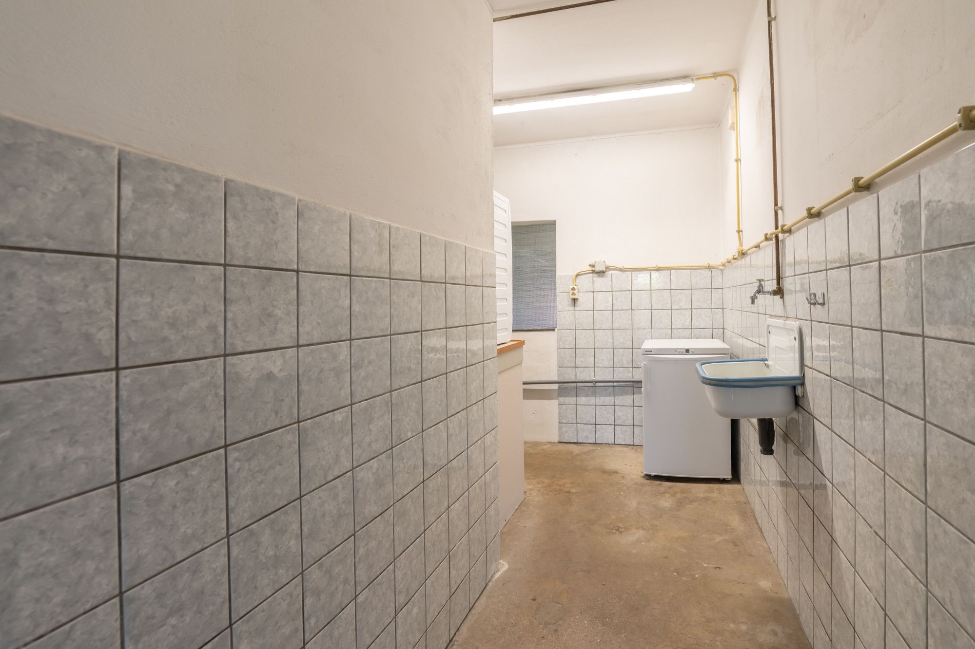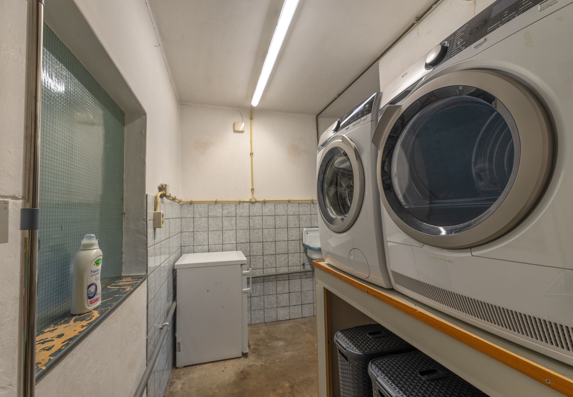 Vanuit de keuken is het achterportaal te bereiken, dit geeft toegang tot de toiletruimte, de badkamer op de begane grond, de bijkeuken en de tuin. De toiletruimte is geheel betegeld en voorzien van zwevend toilet en fonteintje. De badkamer is eveneens geheel betegeld en uitgerust met ligbad, inloopdouche en wastafel. De bijkeuken is voorzien van witgoedaansluitingen en geeft toegang tot de diverse inpandig bergingen/stallen en kantoorruimte. Tevens bevindt zich in de bijkeuken een trapopgang naar de zolder welke is gelegen boven de inpandige bergingen/stallen en het kantoor.