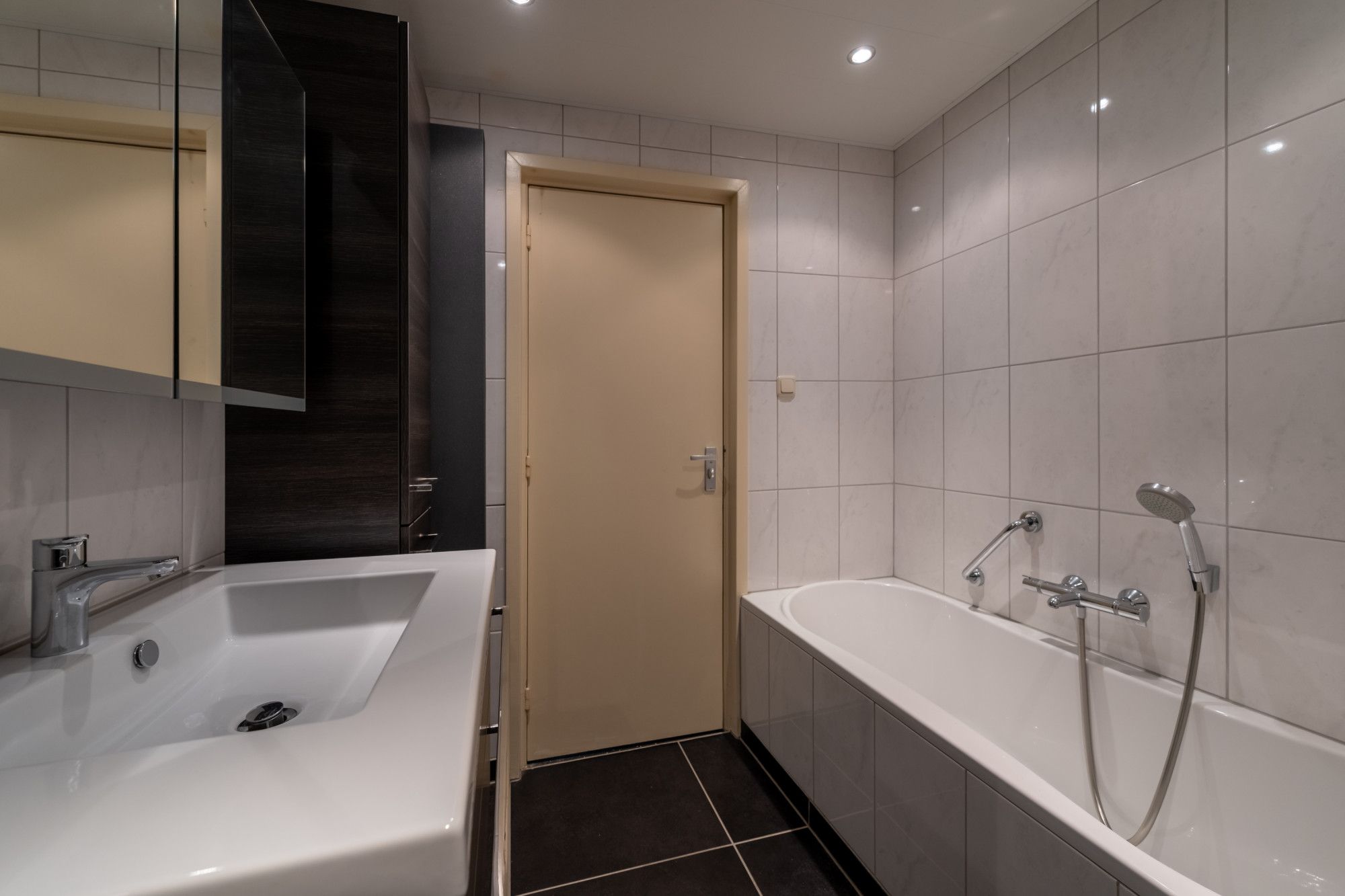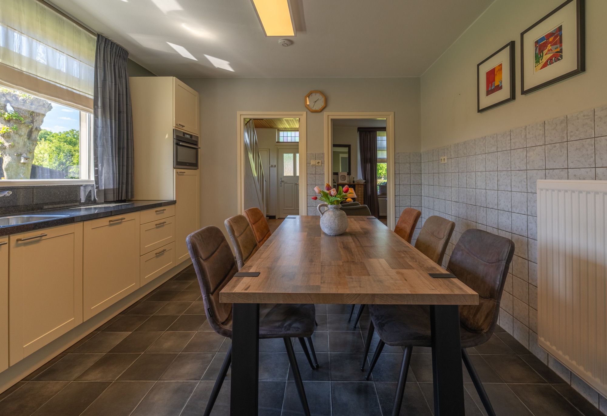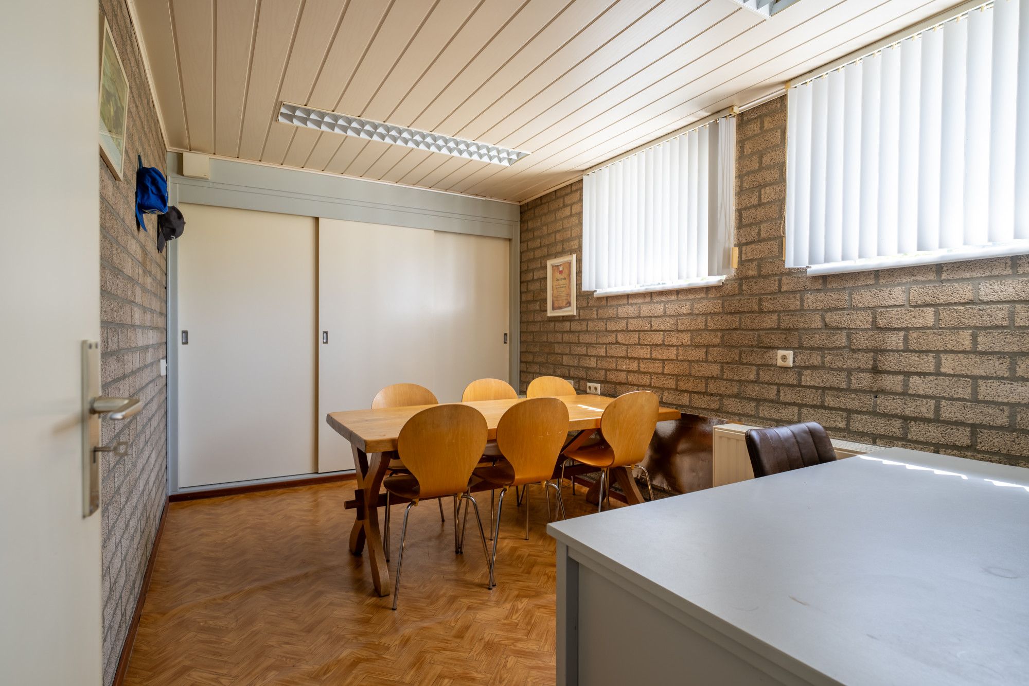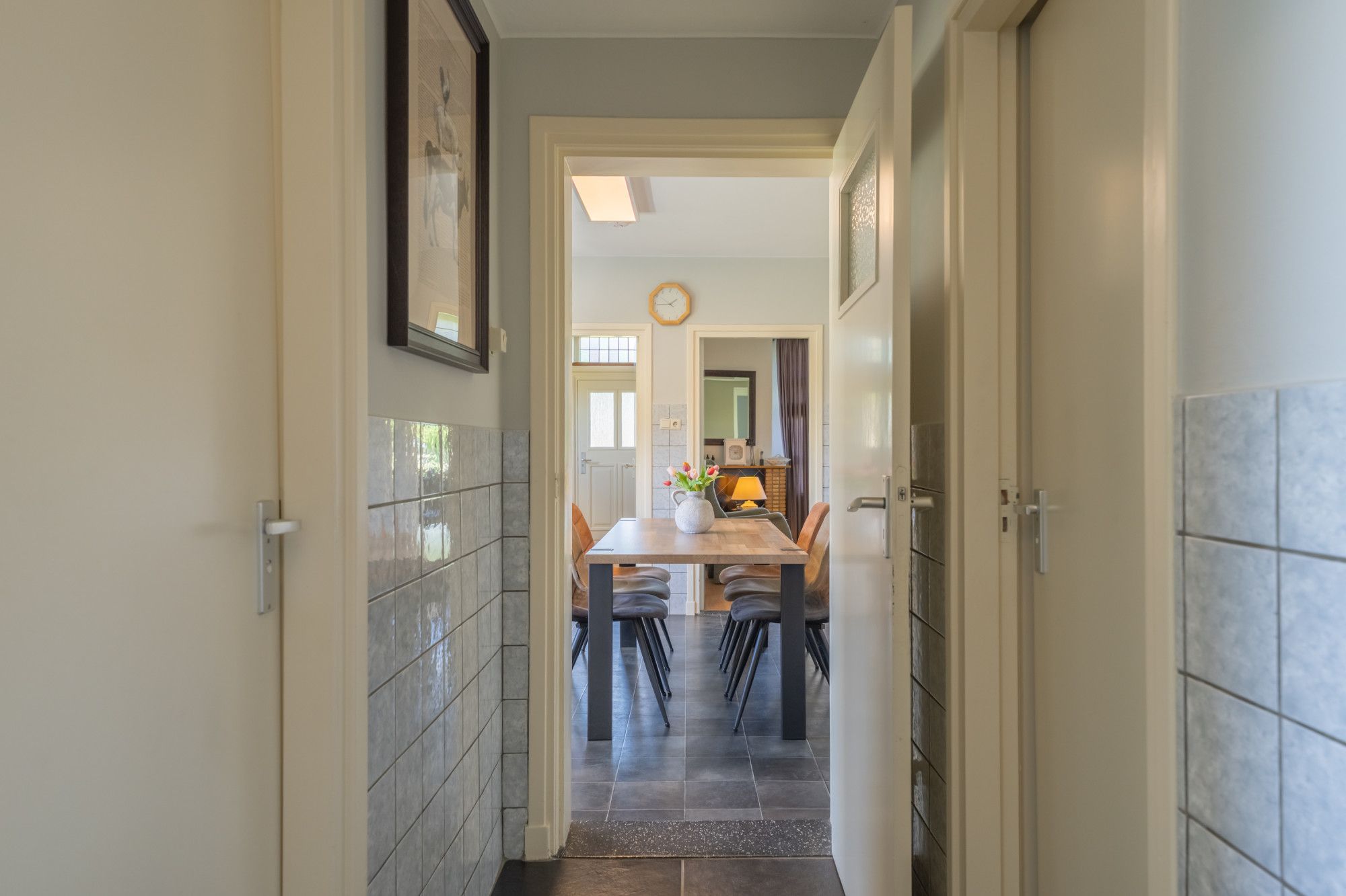 Vanuit de keuken is het achterportaal te bereiken, dit geeft toegang tot de toiletruimte, de badkamer op de begane grond, de bijkeuken en de tuin. De toiletruimte is geheel betegeld en voorzien van zwevend toilet en fonteintje. De badkamer is eveneens geheel betegeld en uitgerust met ligbad, inloopdouche en wastafel. De bijkeuken is voorzien van witgoedaansluitingen en geeft toegang tot de diverse inpandig bergingen/stallen en kantoorruimte. Tevens bevindt zich in de bijkeuken een trapopgang naar de zolder welke is gelegen boven de inpandige bergingen/stallen en het kantoor.