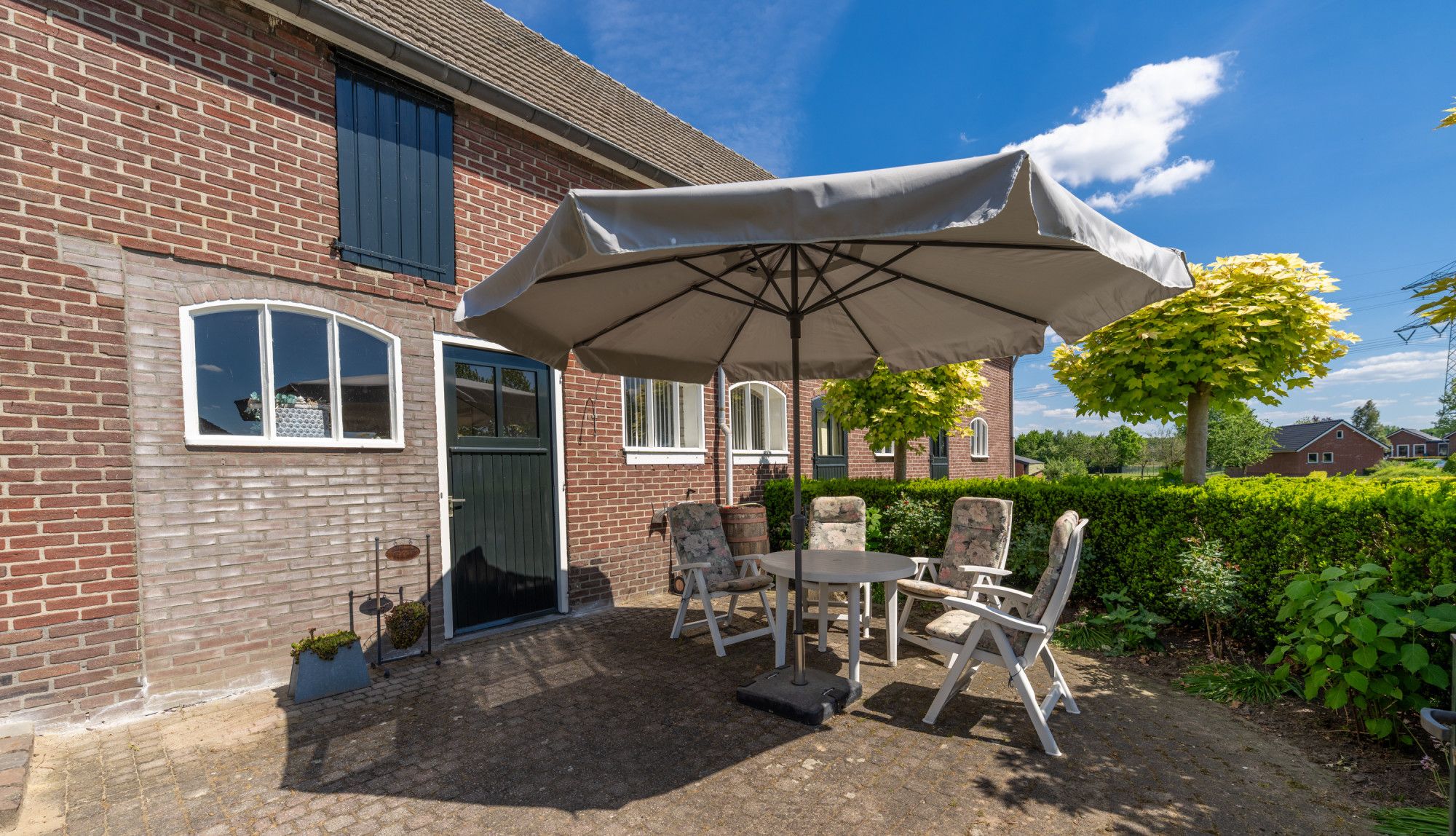 Aan de voorzijde van de woning ligt een riante oprit met toegang tot de bedrijfsgebouwen. Het erf is verhard met beton en grind.