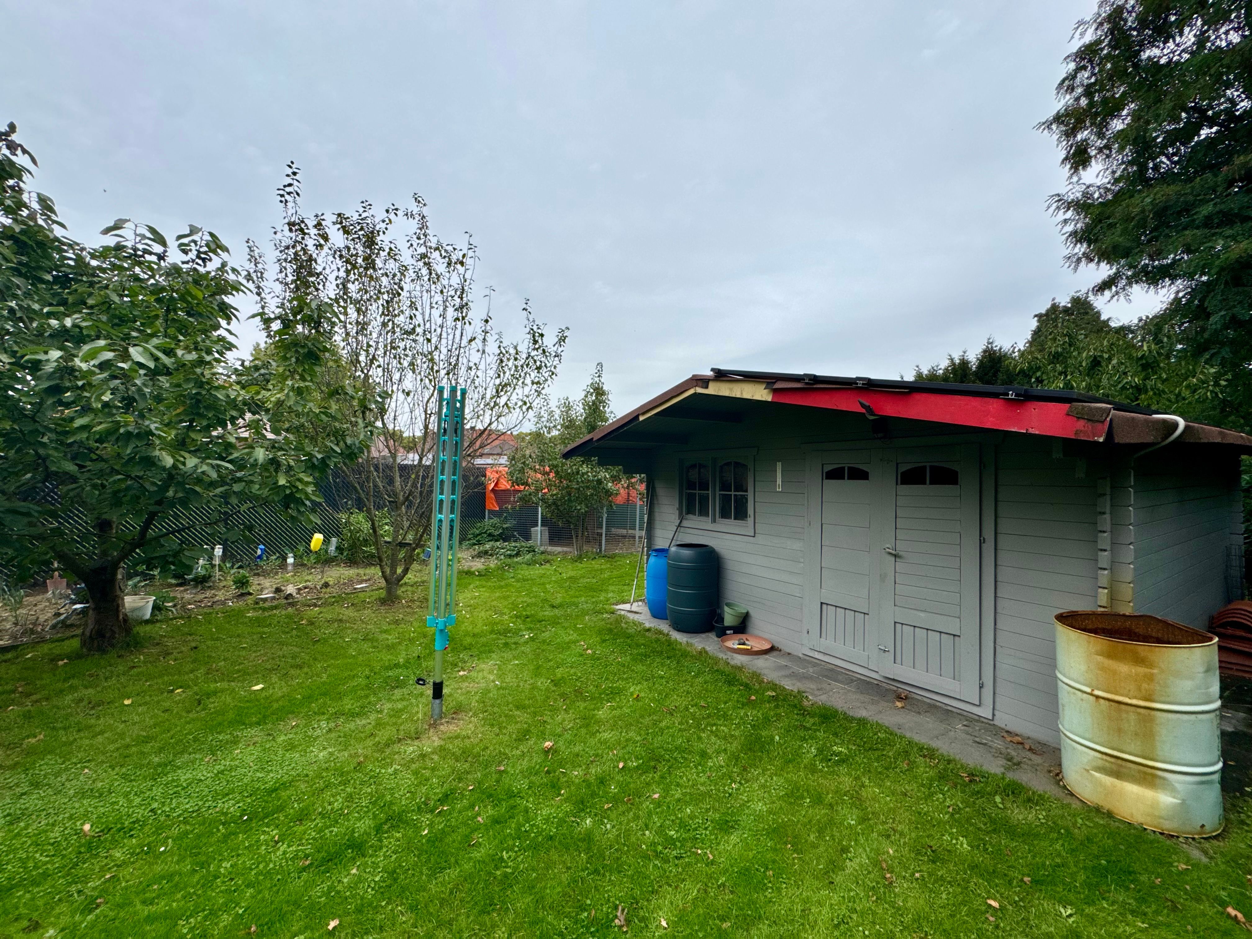 De ruime tuin is een absolute troef met twee overkappingen, een garage en een tuinhuis voor extra bergruimte.