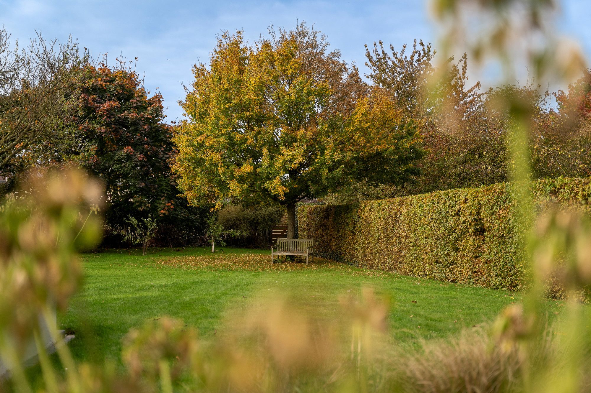 On the ground floor, a spacious entrance hall with cloakroom and guest toilet welcomes you into the house. From here, you enter the impressive dining room with a loft and large windows that offer a beautiful view of the garden. Adjacent to this is a cozy sitting area with a gas fireplace, next to a separate TV corner. The dining room also provides access to the renovated, luxury kitchen from 2016. Further on the ground floor, there is a utility room with built-in cupboards and connections for a washing machine and dryer, a second separate toilet, and a spacious office—ideal for working from home or practicing a liberal profession.