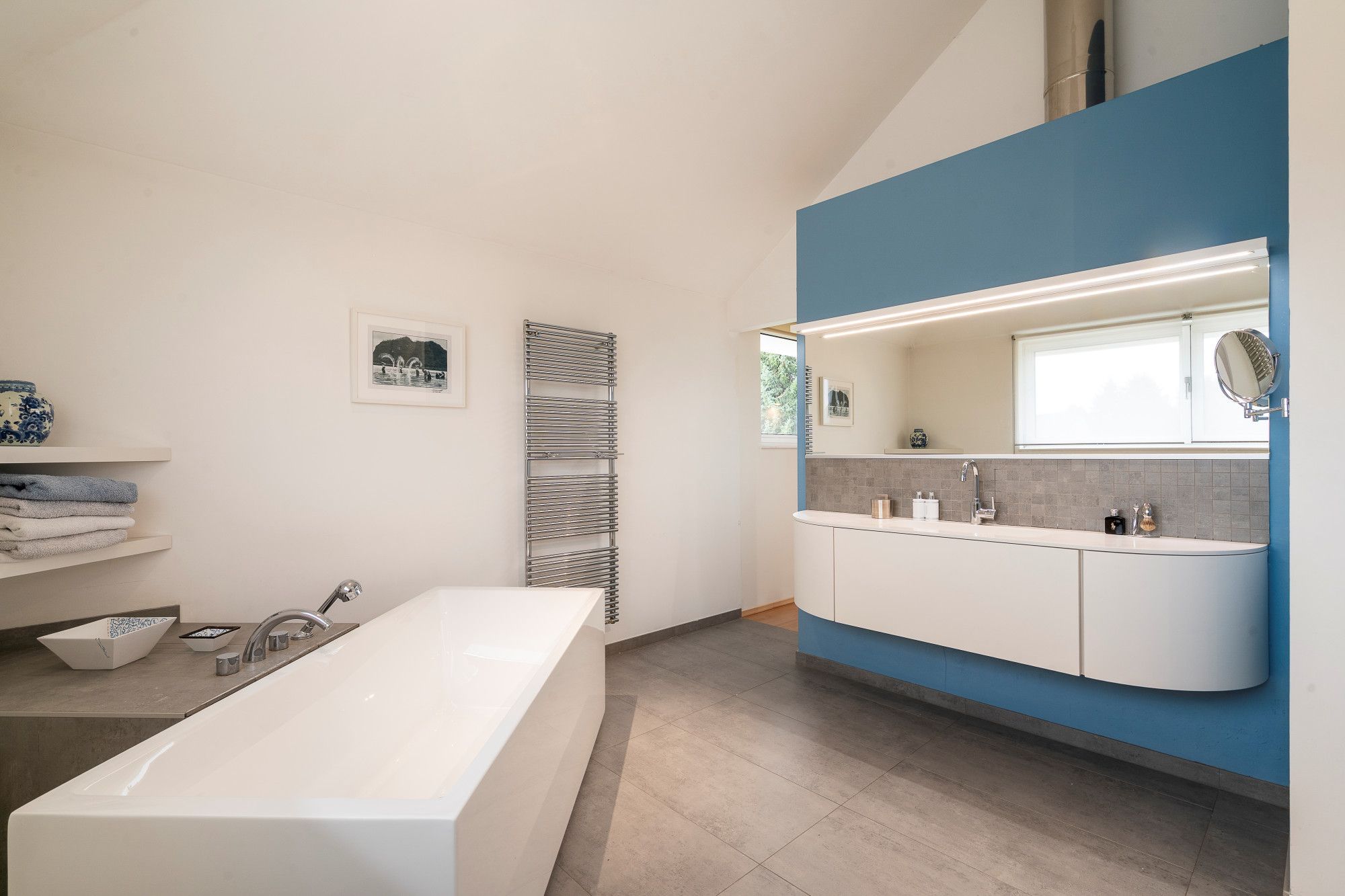 The ensuite bathroom in the master bedroom has been luxuriously renovated and equipped with a freestanding bathtub, a walk-in shower, and a sink in a sleek bathroom cabinet.
