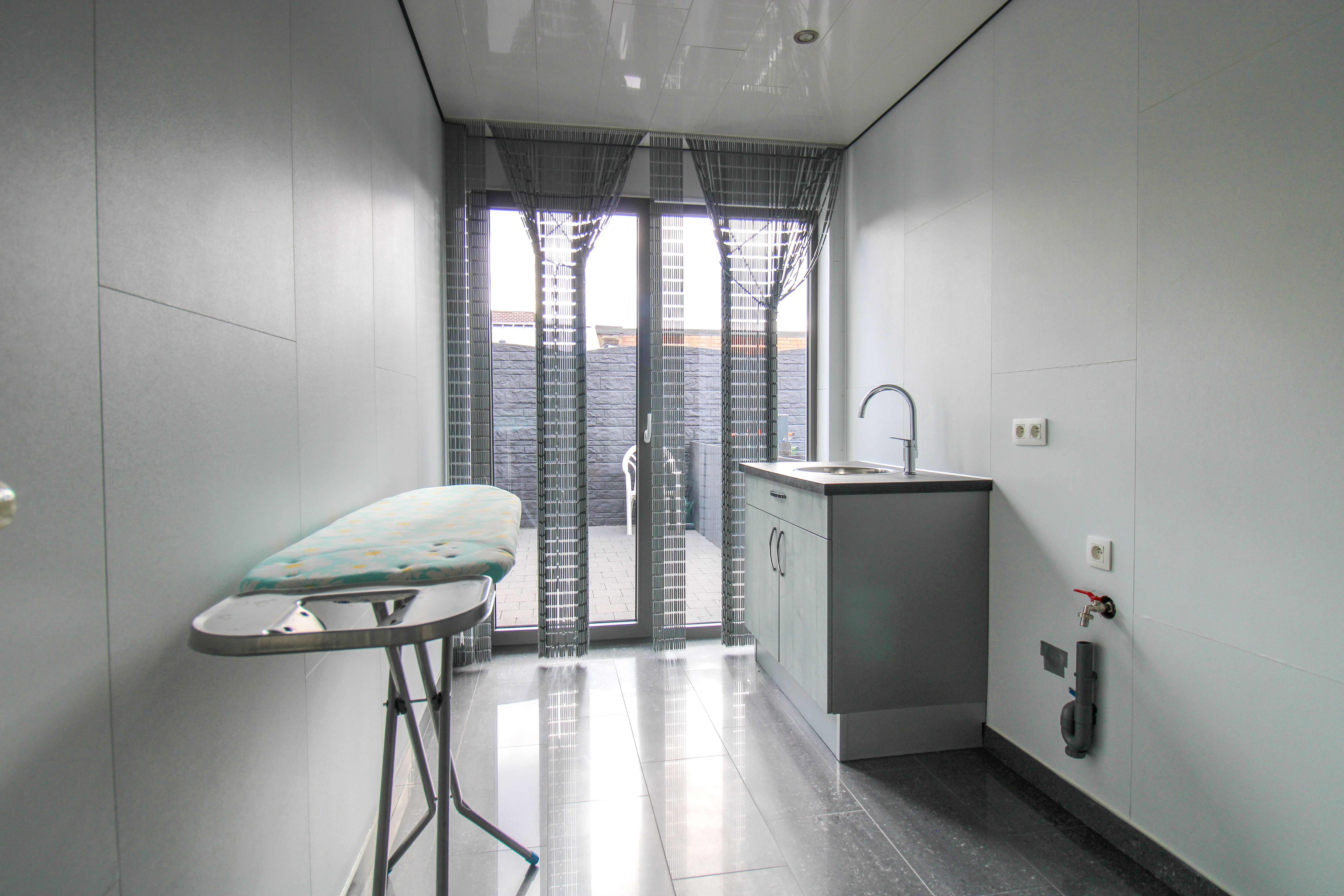 Vanuit de keuken is er rechtstreekse toegang tot de inpandige garage (27,25 m²). Via deze garage bereikt u een aparte hal met praktische berging en toegang tot de ruime, volledig afgesloten tuin.