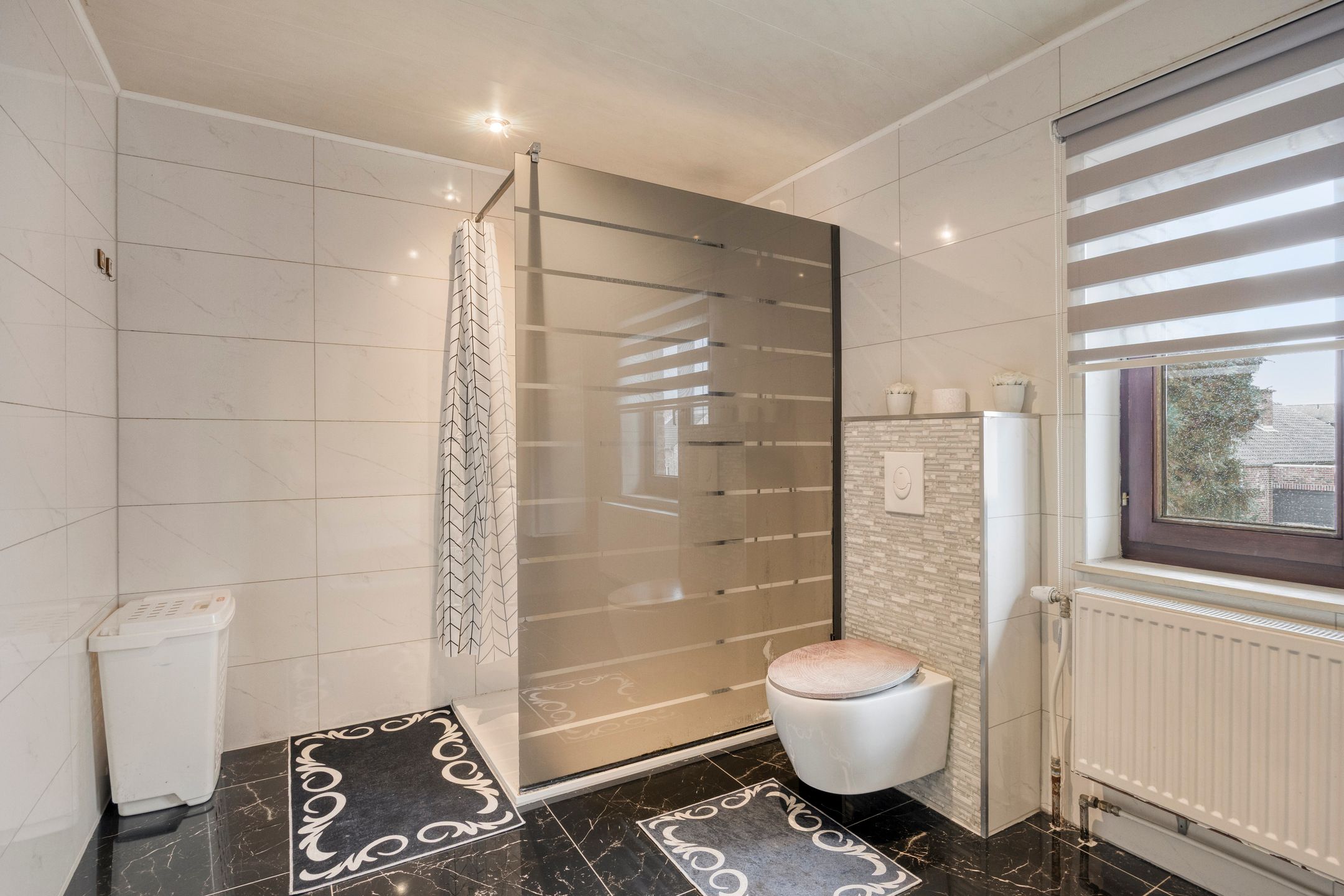 - Inkom: (3,89 m x 3,88 m = 15 m²) – tegelvloer – toegang naar woonkamer en naar leefkeuken