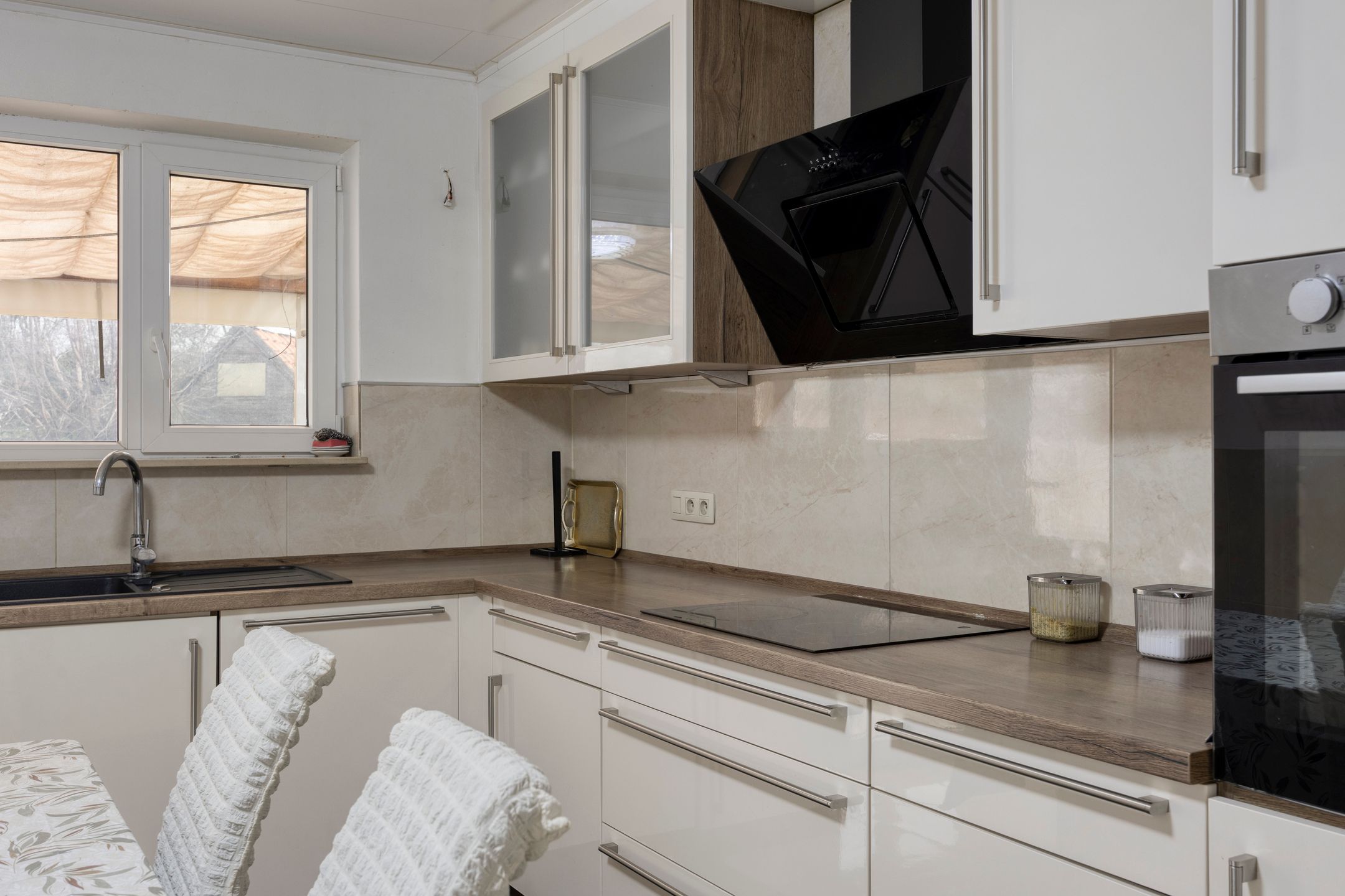 - Keuken : (3,88 m x 4,60 m = 18 m²) – tegelvloer – de keuken is volledig ingericht met spoeltafel, inductie fornuis en dampkap, vaartwasser, veel kastruimte..