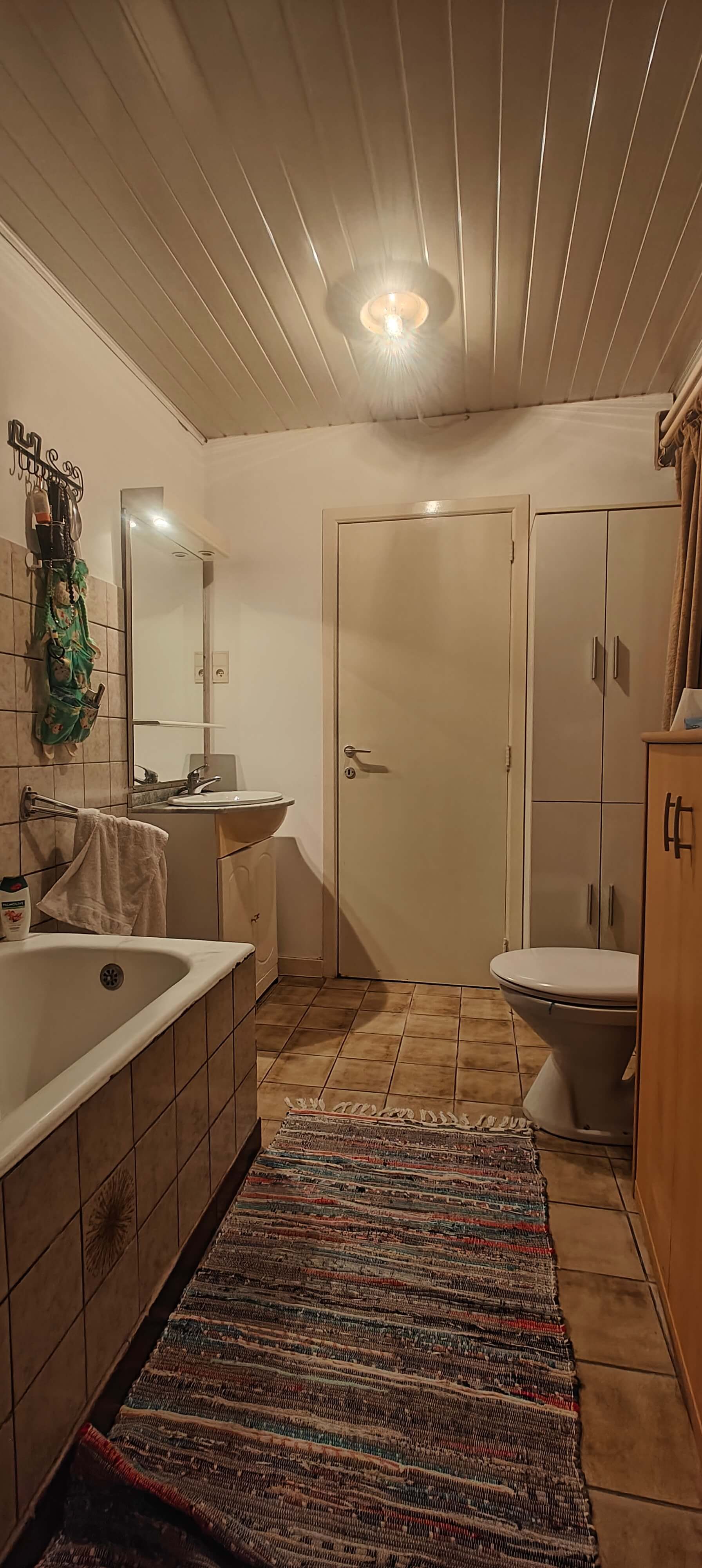Aansluitend bevindt zich de keuken, die toegang biedt tot verschillende praktische ruimtes. Via een sas bereikt u enerzijds de badkamer, uitgerust met toilet, bad en lavabo met aansluitend de technische ruimte met stookolieketel en aansluiting voor de wasmachine. Verder geeft de keuken uit op de trappenhal, die extra bergruimte biedt en toegang geeft tot de eerste verdieping.