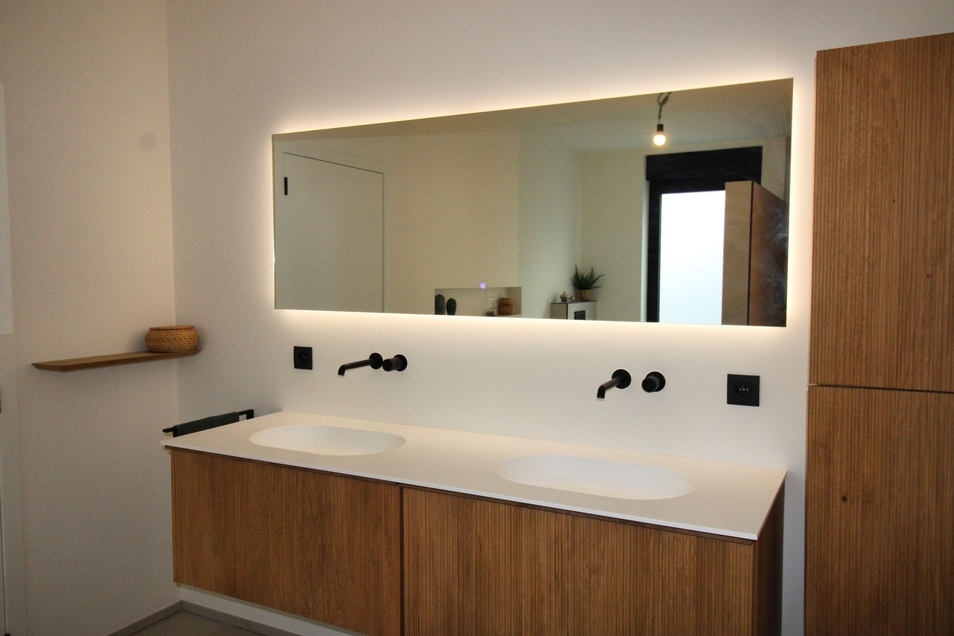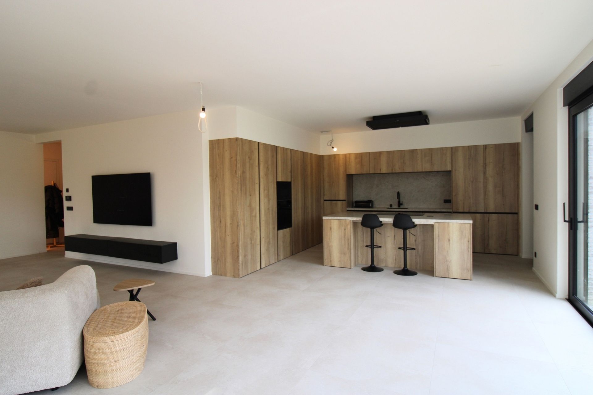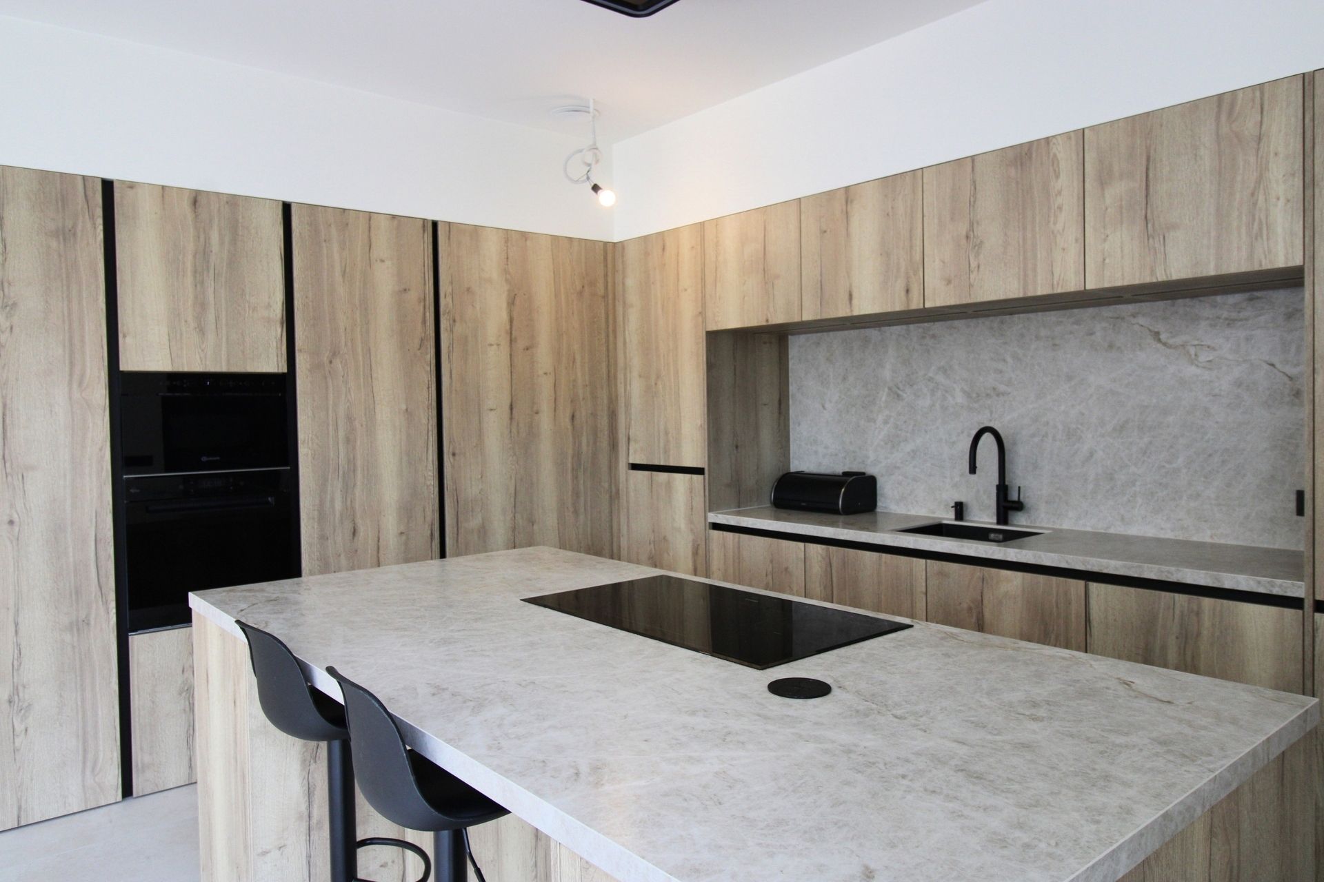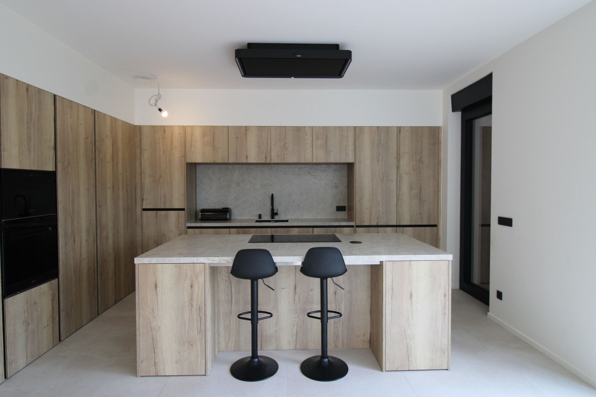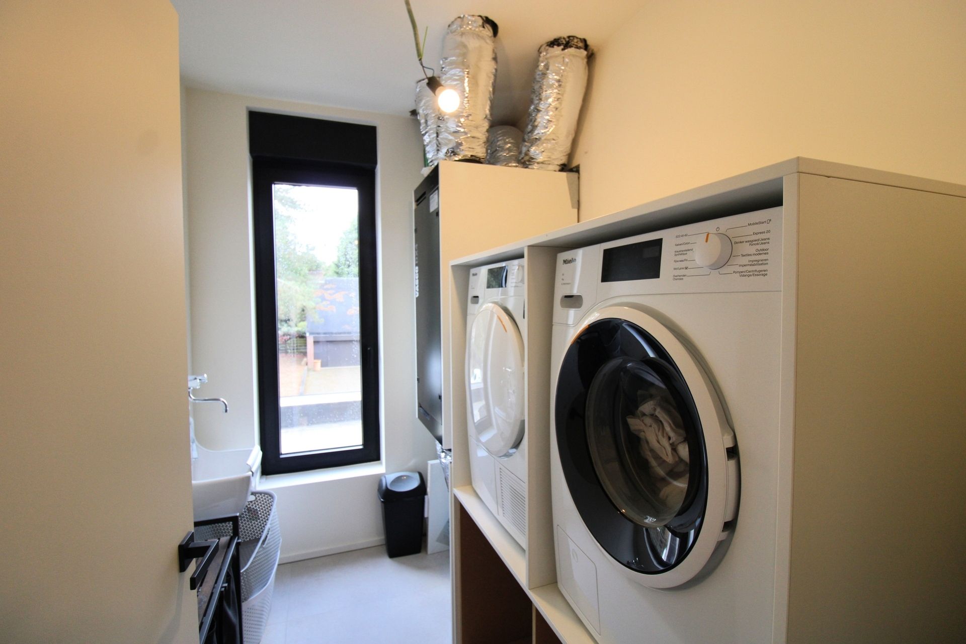 De keuken is afgewerkt met een keramisch werkblad met verdikte randen en uitgerust met alle moderne toestellen: inductiekookplaat, Novy dampkap, oven, microgolfoven, vaatwasser en koelkast van Bauknecht. Daarnaast beschikt de keuken over een Quooker (kokendwaterkraan) en handige ingebouwde stopcontacten in het werkblad. Via een discreet ingewerkte deur bereikt u de ruime berging, die ook rechtstreeks toegankelijk is via een buitendeur.