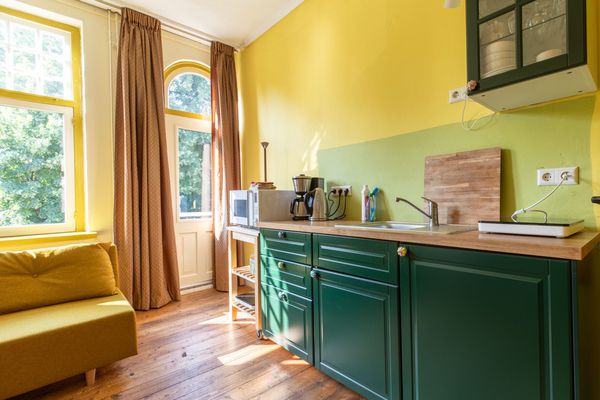 Op een fraaie locatie op loopafstand van het centrum, gaat achter de statige voorgevel van dit gemeentelijk monument heel veel ruimte schuil. Veel woonruimte, waarbij momenteel een verdeling is gemaakt tussen een ruim woonhuis met stadstuin op de begane grond en eerste verdieping aan de achterzijde en 2 B&B appartementen (op de 1e en 2e verdieping aan de voorzijde) met eigen ingang. Het is ook zeer goed mogelijk het als 1 gehele woning te bewonen.