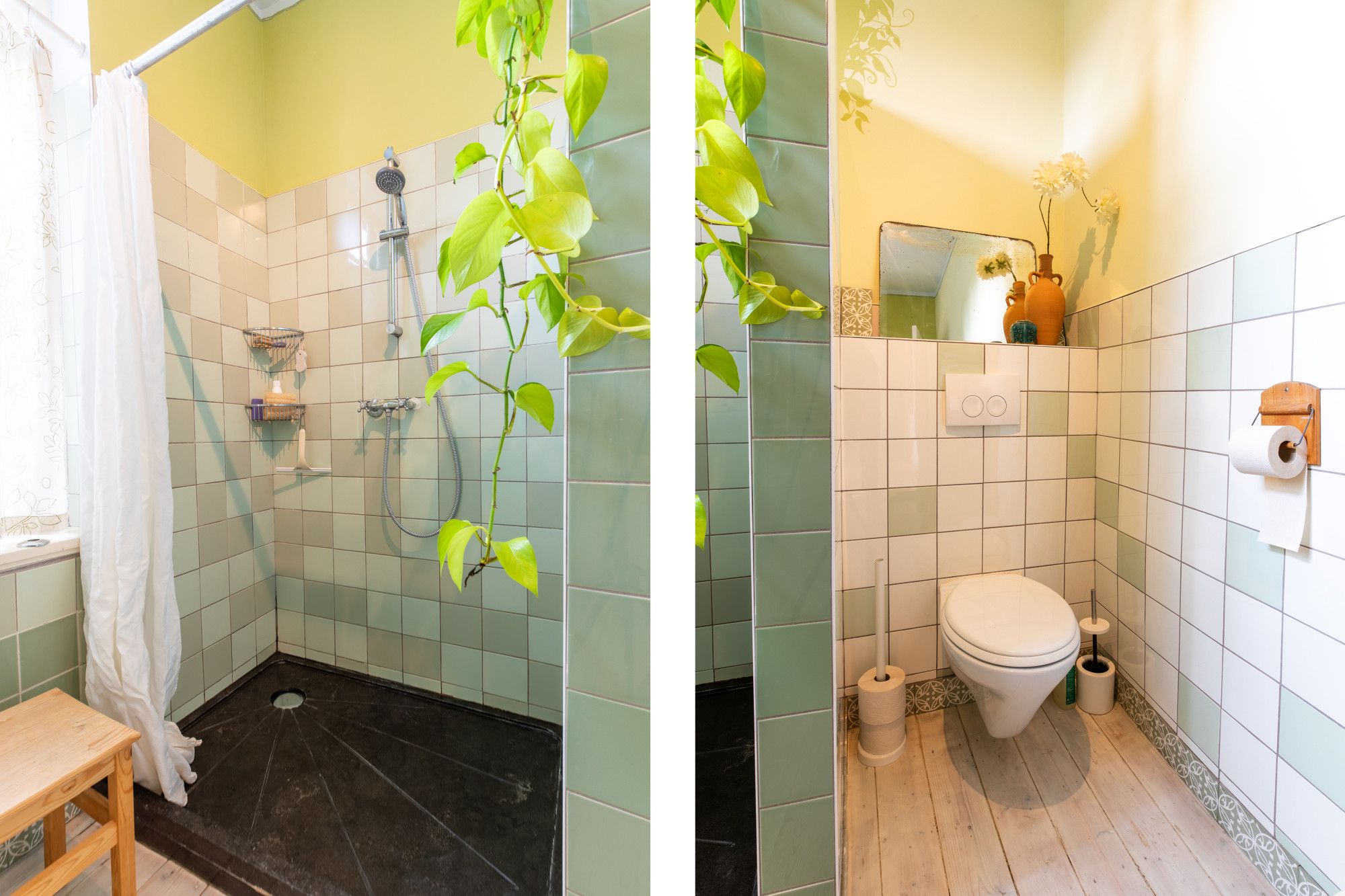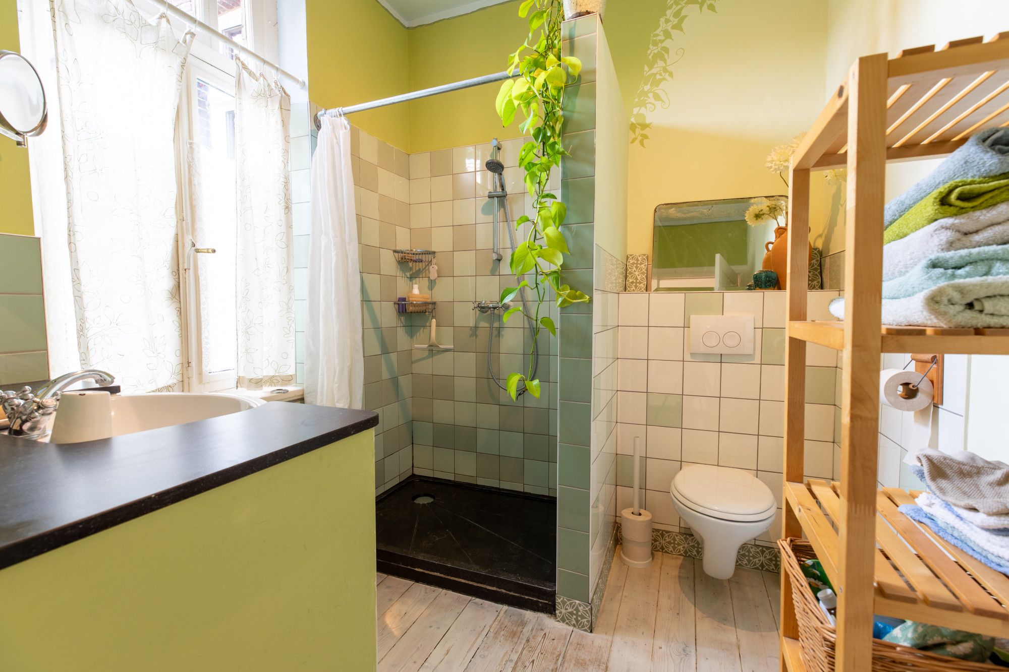 Badkamer voorzien van ruime douche, wandcloset, wastafel in groot stenen plateau.