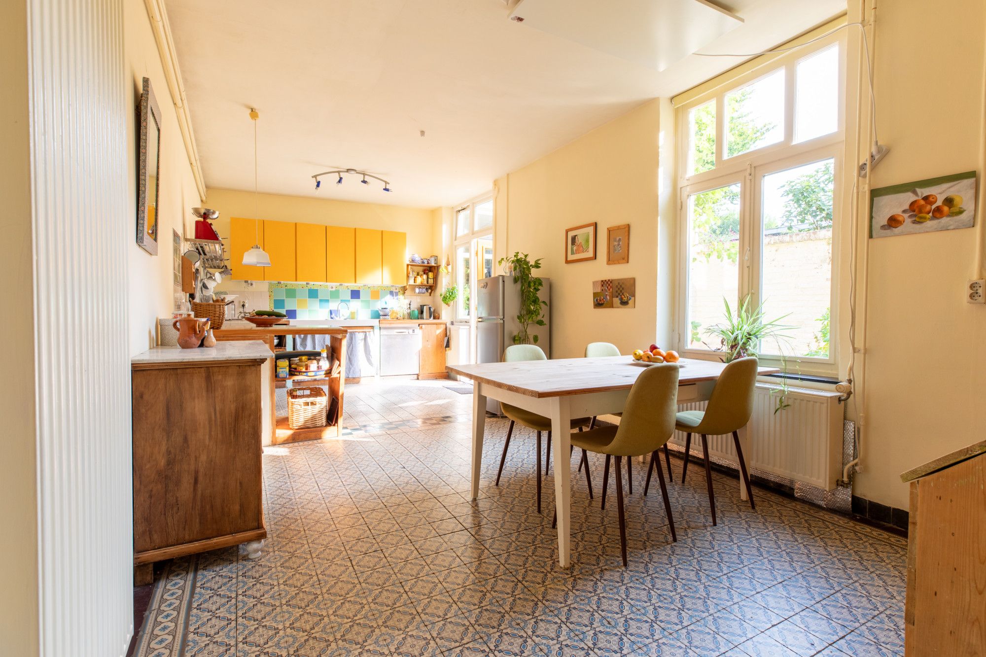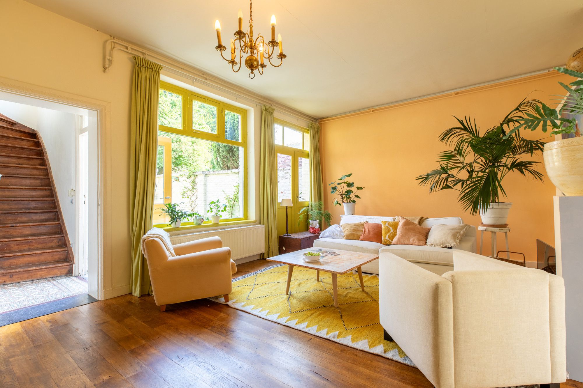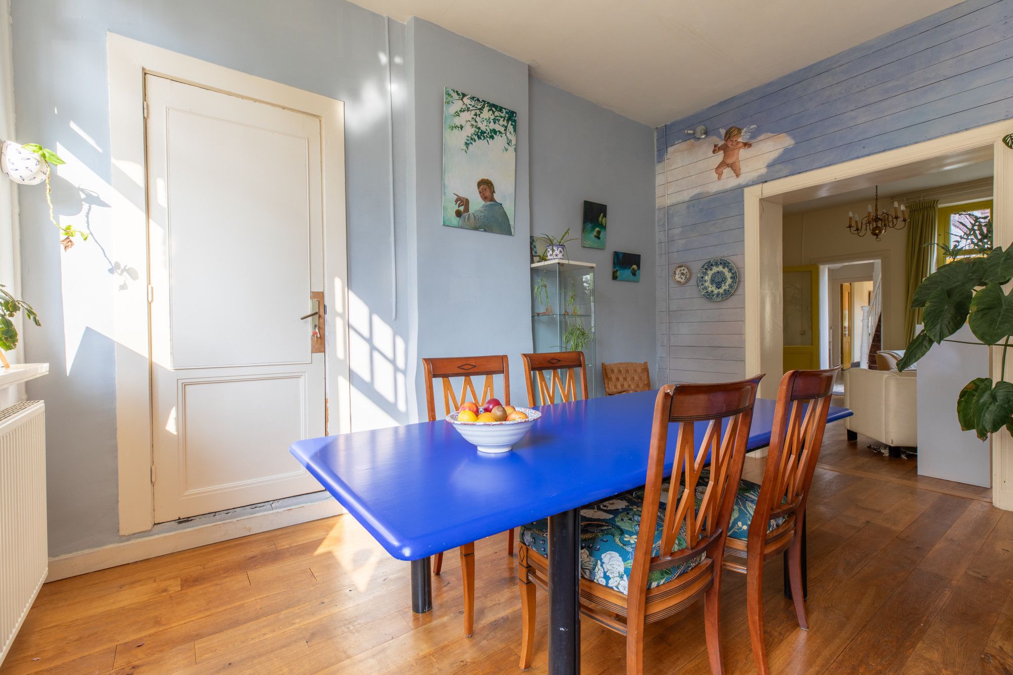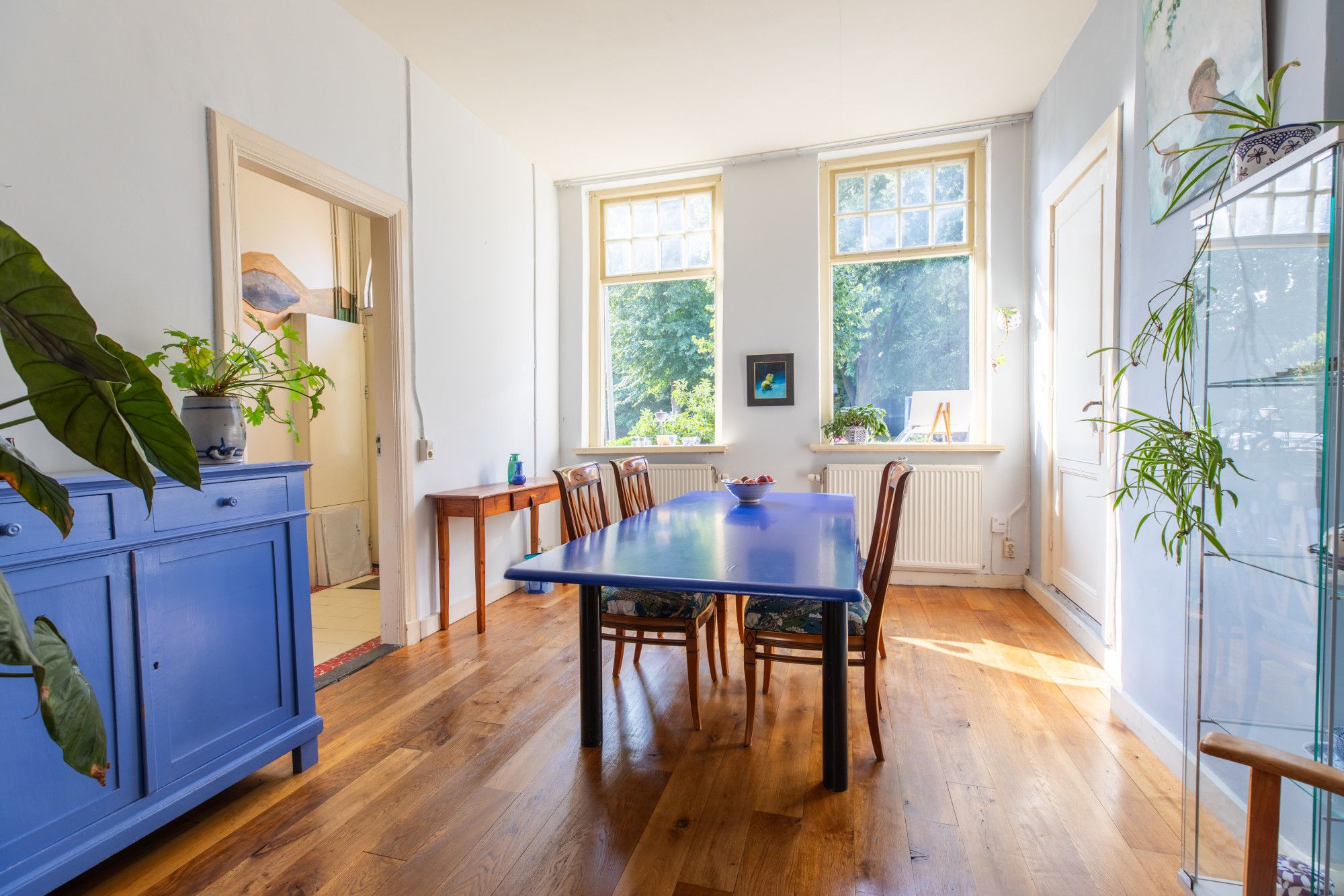 Lichte eetkamer (circa 14m²) aan de voorzijde en-suite met de royale aan de achterzijde gelegen woonkamer (circa 30m²) met trapkast en zicht op de stadstuin.