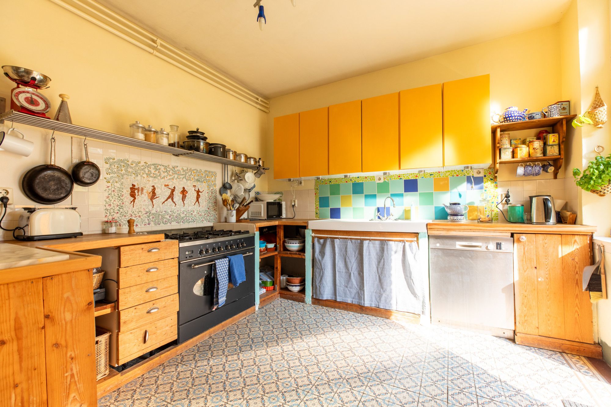 Woonkeuken (ruim 20m²) voorzien van L-vormige opstelling voorzien van een robuust 6-pits fornuis.