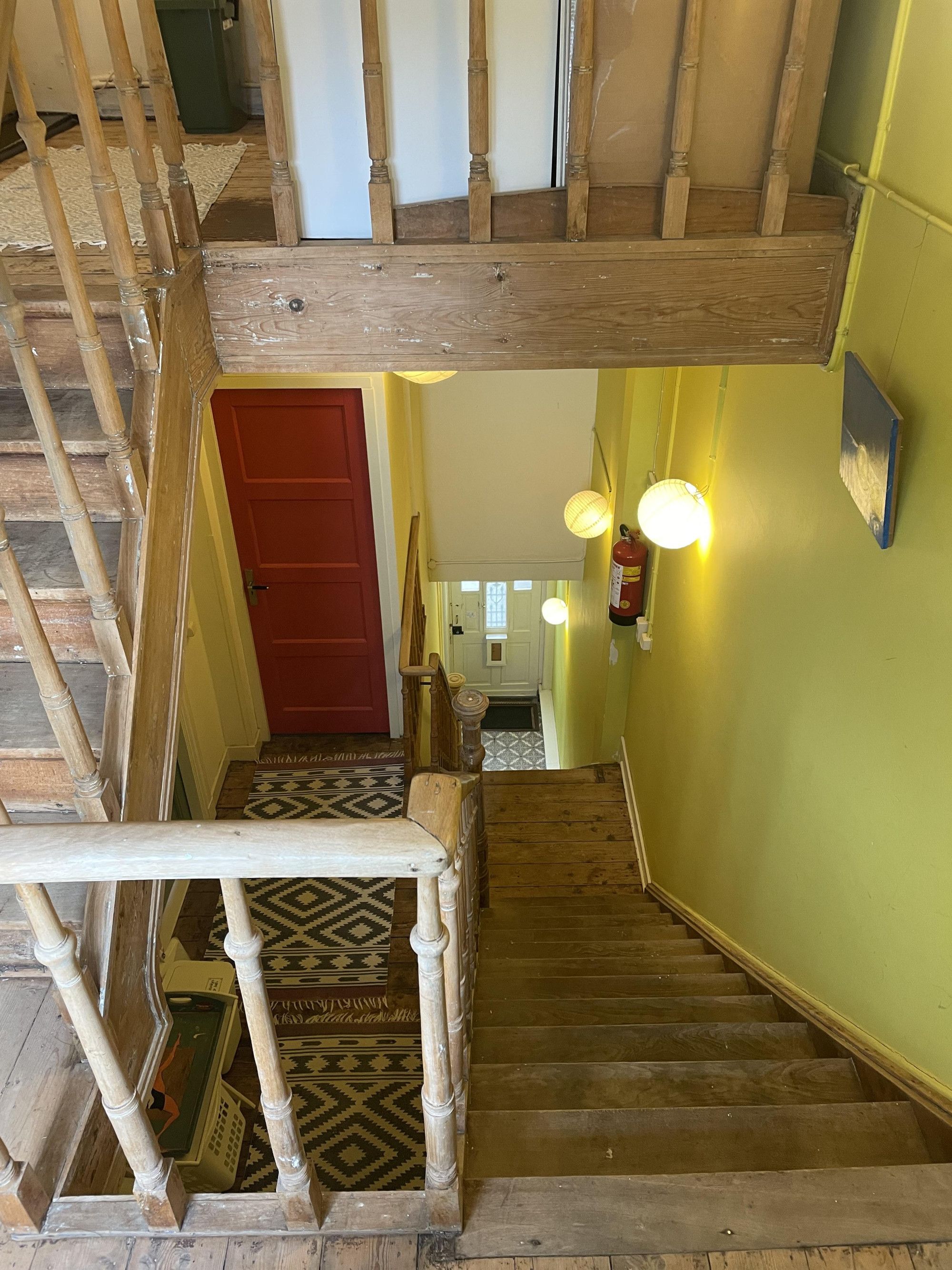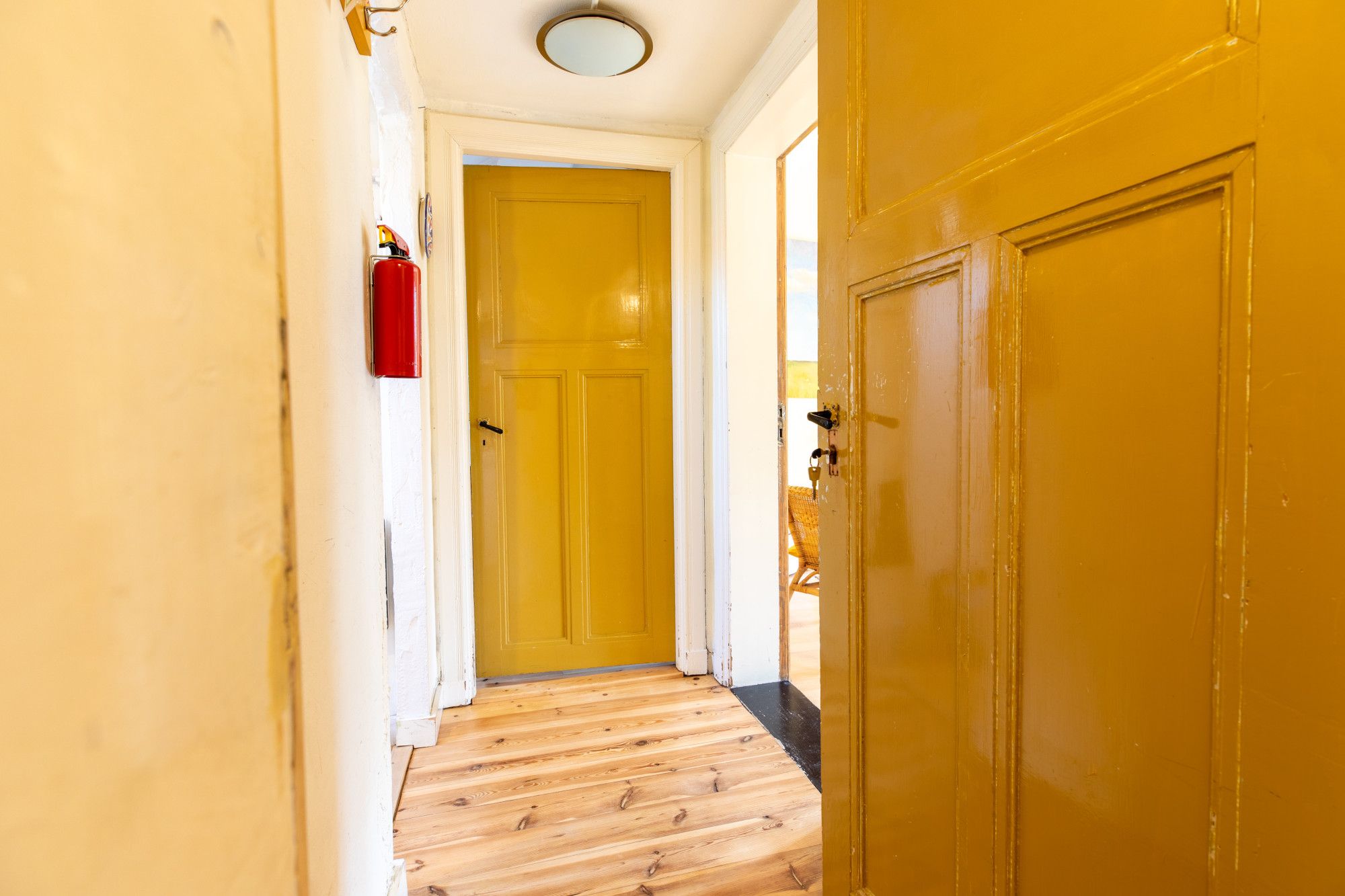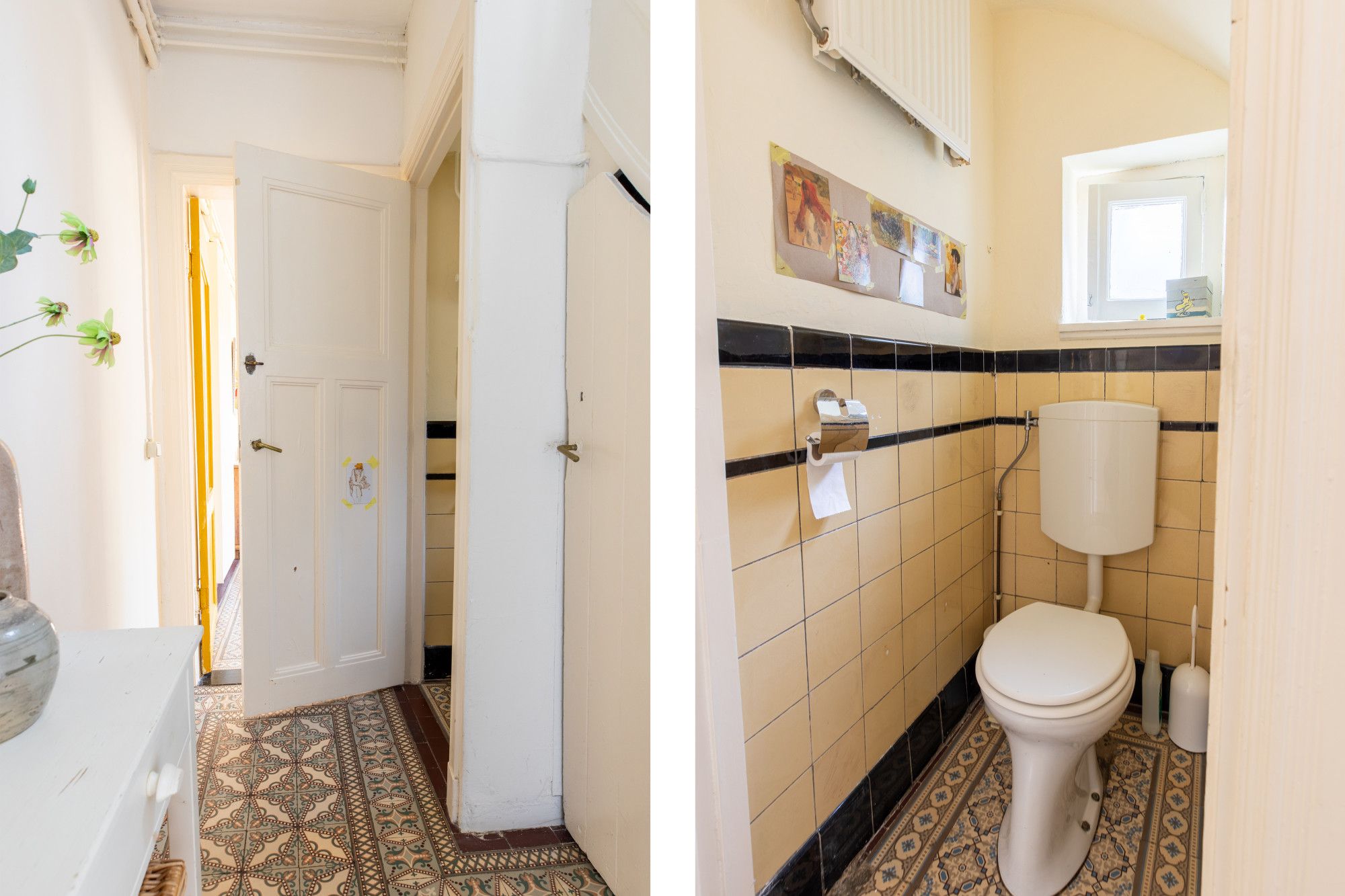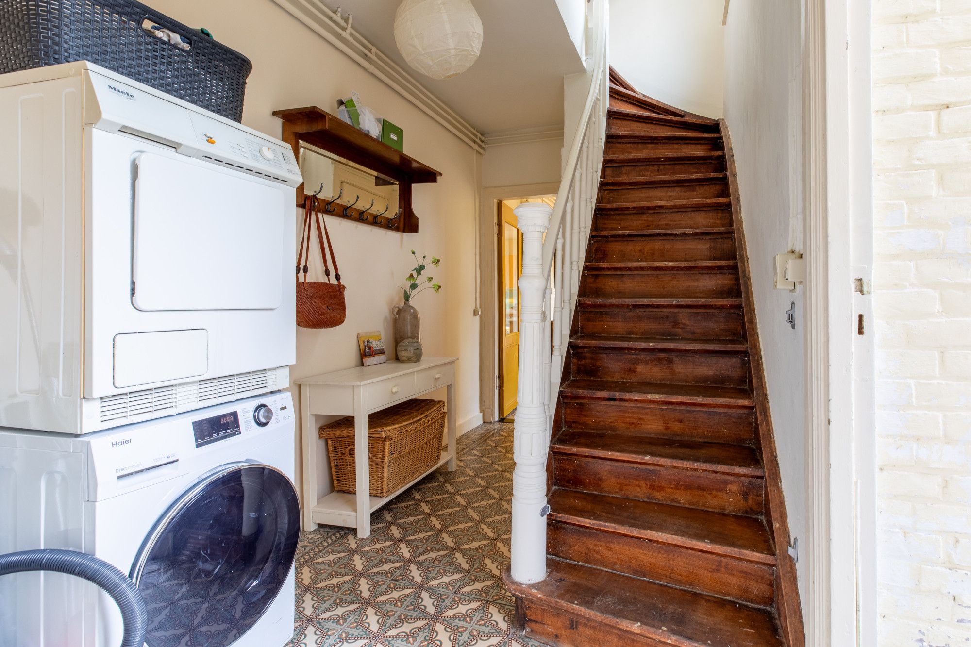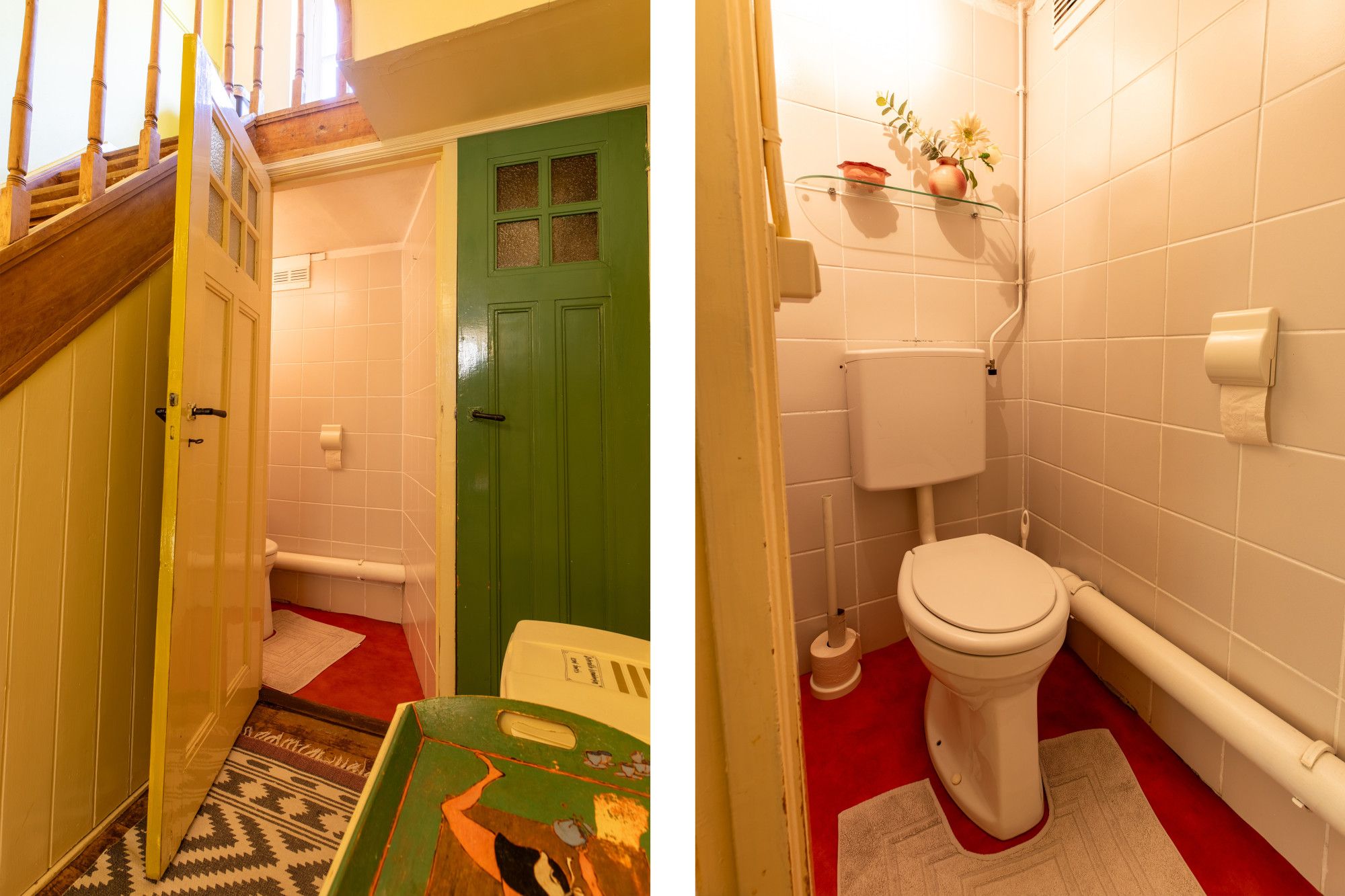 Gang met aansluiting/afvoer wasmachine, toiletruimte, toegang tot kleine kelder en de trap naar de eerste verdieping.