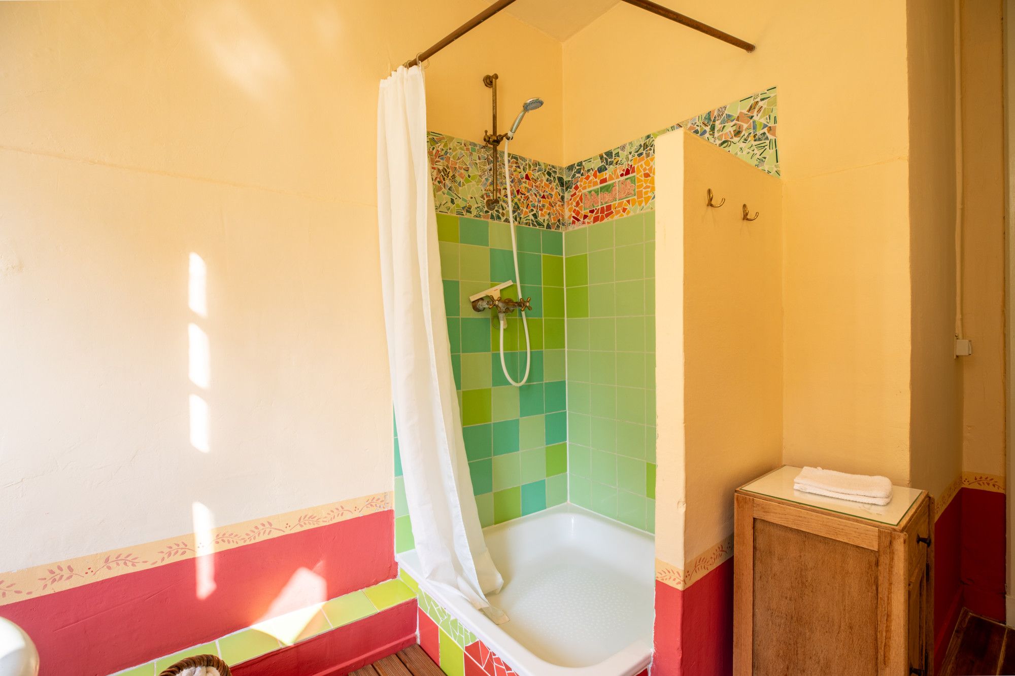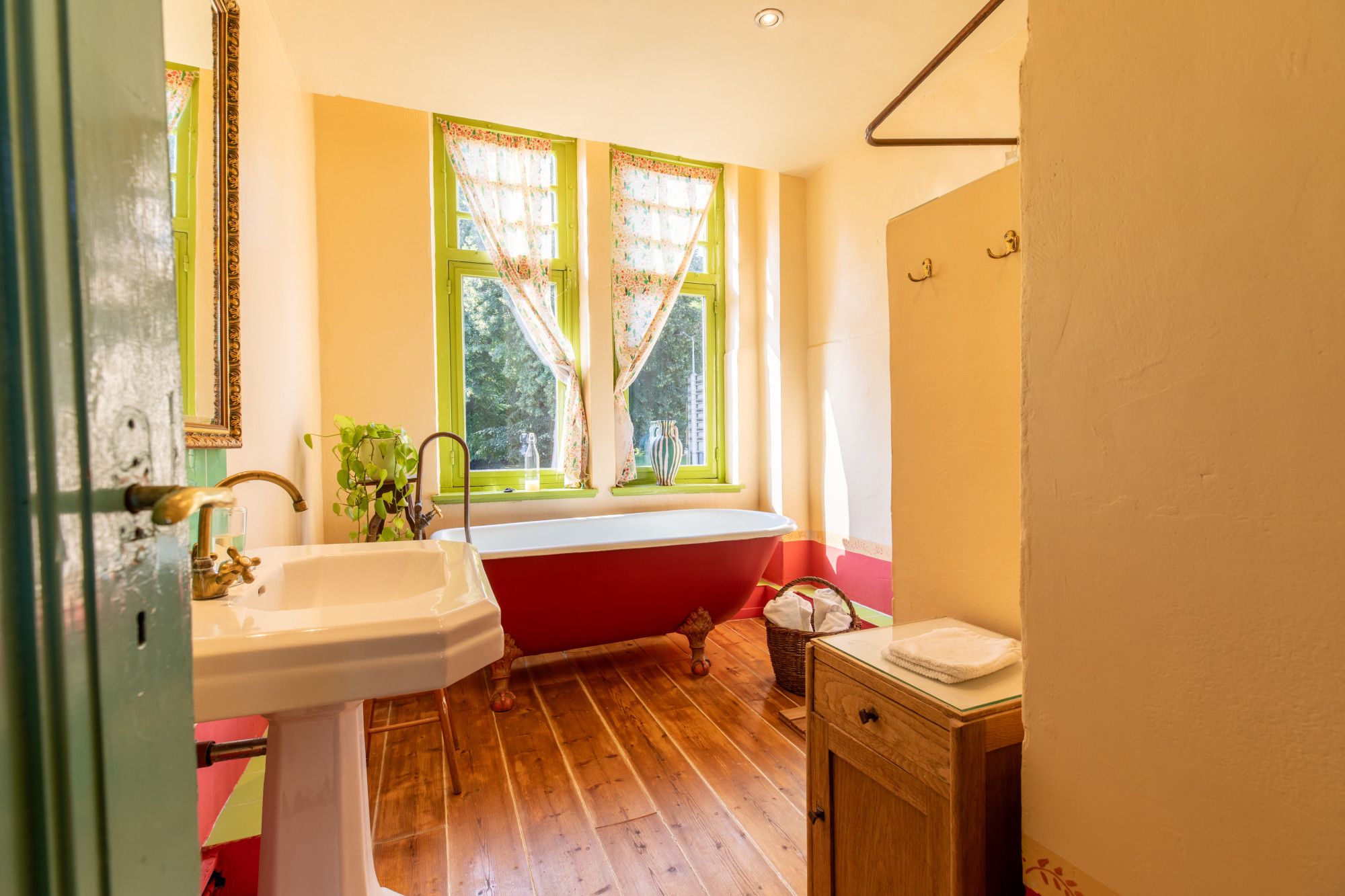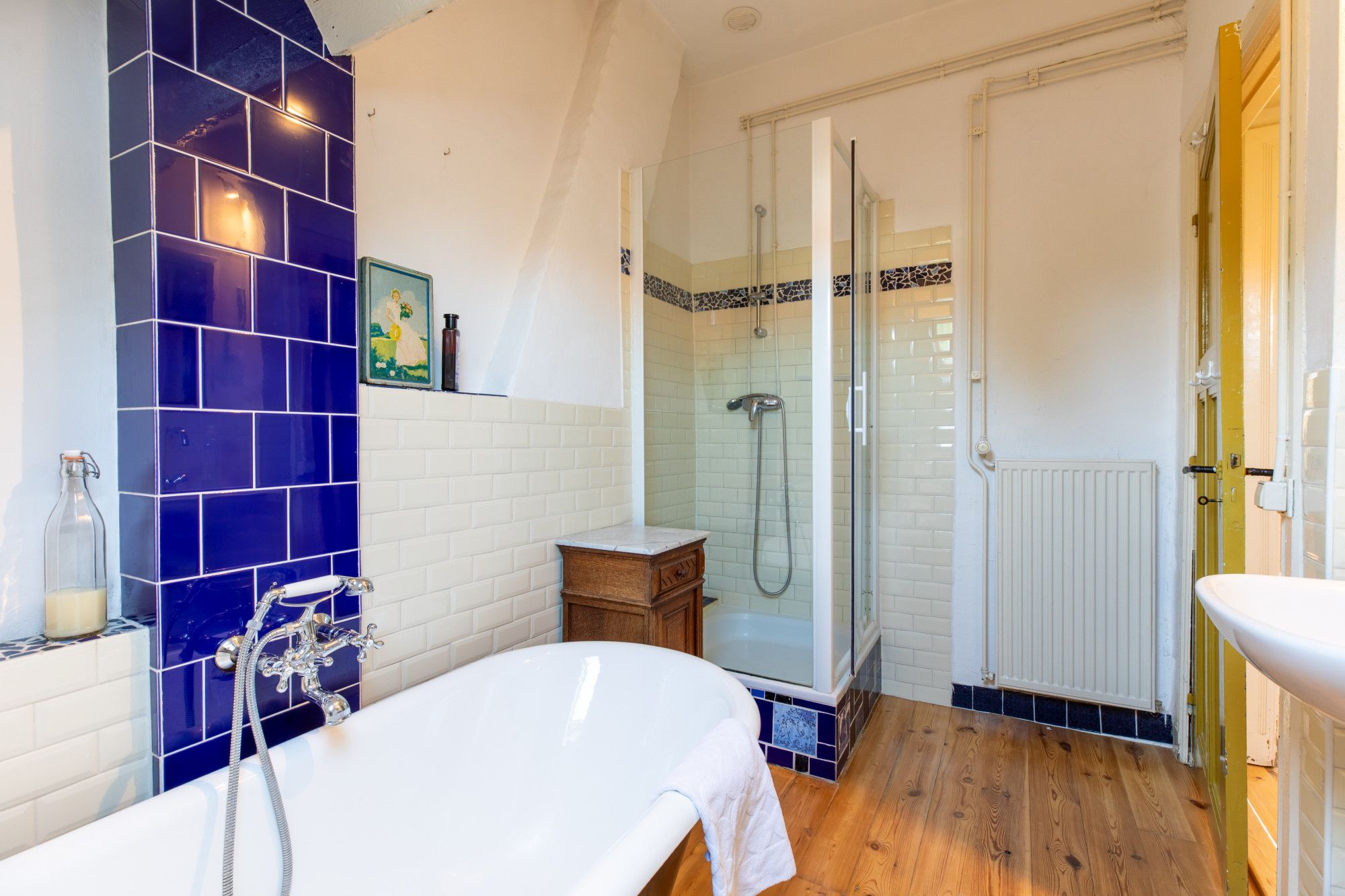 Badkamer voorzien van vrijstaand ligbad, douche en wastafel.