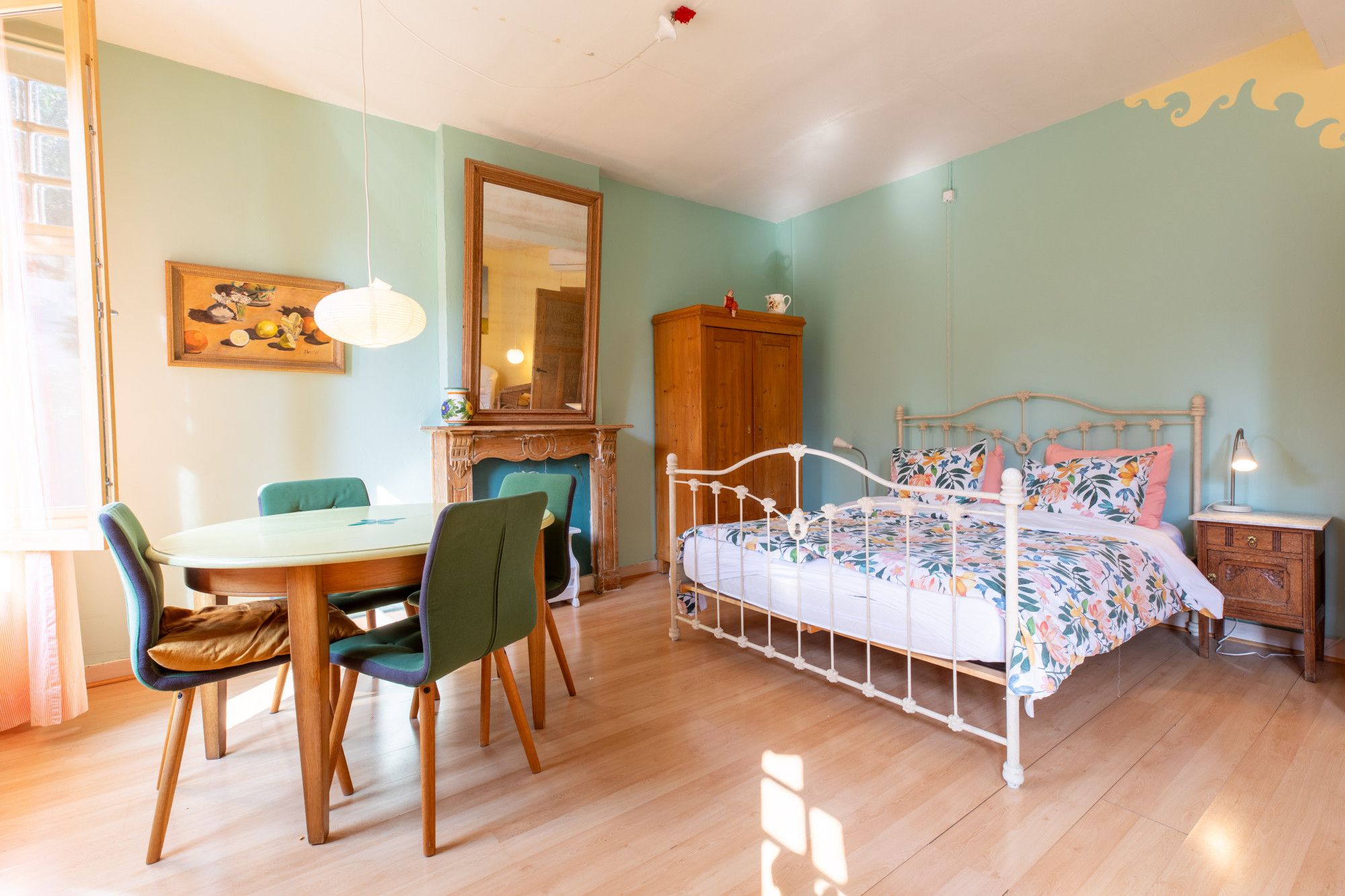 Kamer-en-suite met schuifseparatie. Te gebruiken als slaapkamer aan achterzijde en zitkamer met pantry aan voorzijde. Deze kamer kan ook als tweede slaapkamer gebruikt worden. Voorzien van airco. Balkon met fraai ijzeren hekwerk aan de voorzijde, ruim genoeg om heerlijk van de zon en uitzicht op het park te genieten.