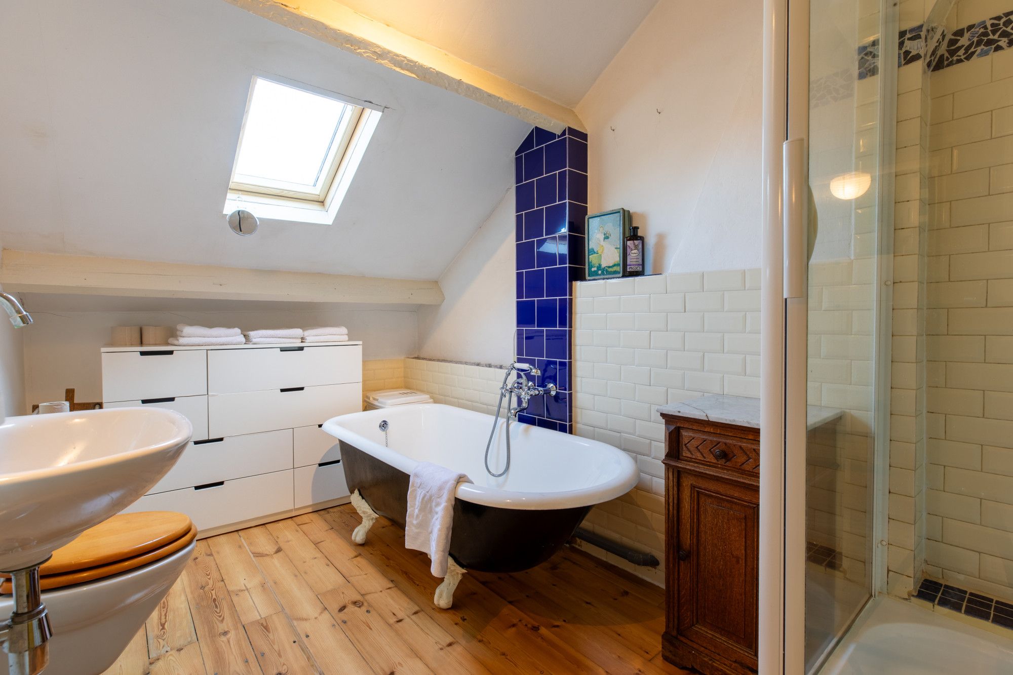 Badkamer voorzien van vrijstaand bad op pootjes, douchecabine, wandcloset en wastafel; dakraam.