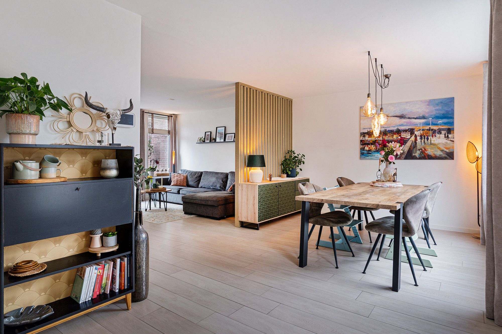 De lichte woonkamer heeft een aparte zit- en eethoek met toegang tot de tuin. In de aanbouw bevindt zich de moderne open keuken welke is voorzien van een kookeiland, 4-pits inductiekookplaat, afzuigkap, Quooker, combi-oven, vaatwasser, koelkast en diepvries. Vanuit de keuken is de praktische bijkeuken, met alle witgoedaansluitingen en bergruimte, te bereiken. De gehele begane grond is voorzien van een nette tegelvloer met vloerverwarming m.u.v. de bijkeuken. Deze heeft een nette pvc-vloer.