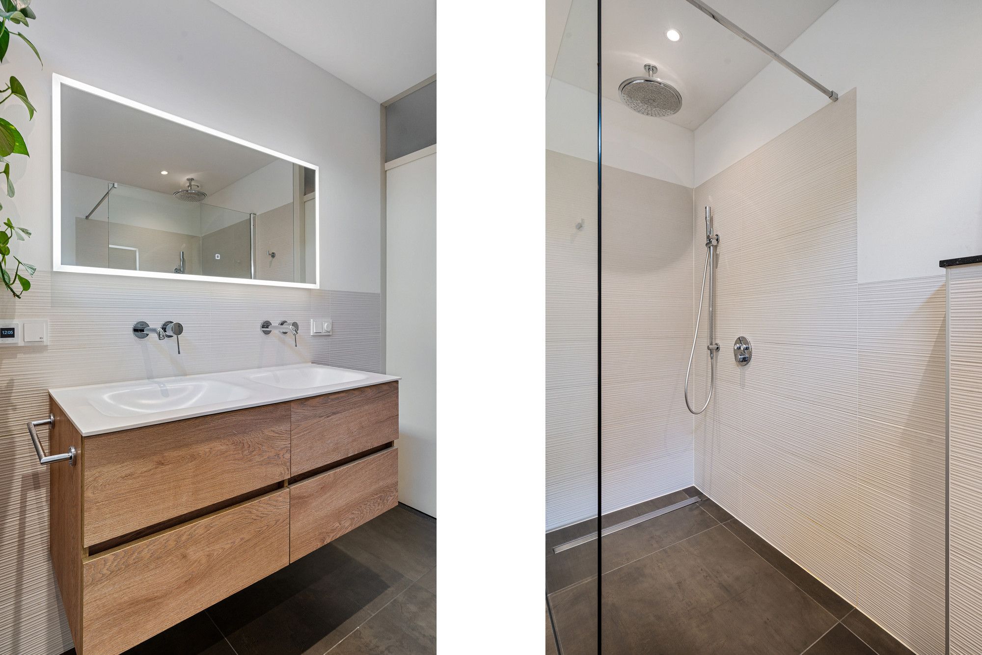 De badkamer is compleet uitgevoerd met een inloopdouche, toilet, dubbele wastafel met meubel en elektrische vloerverwarming.