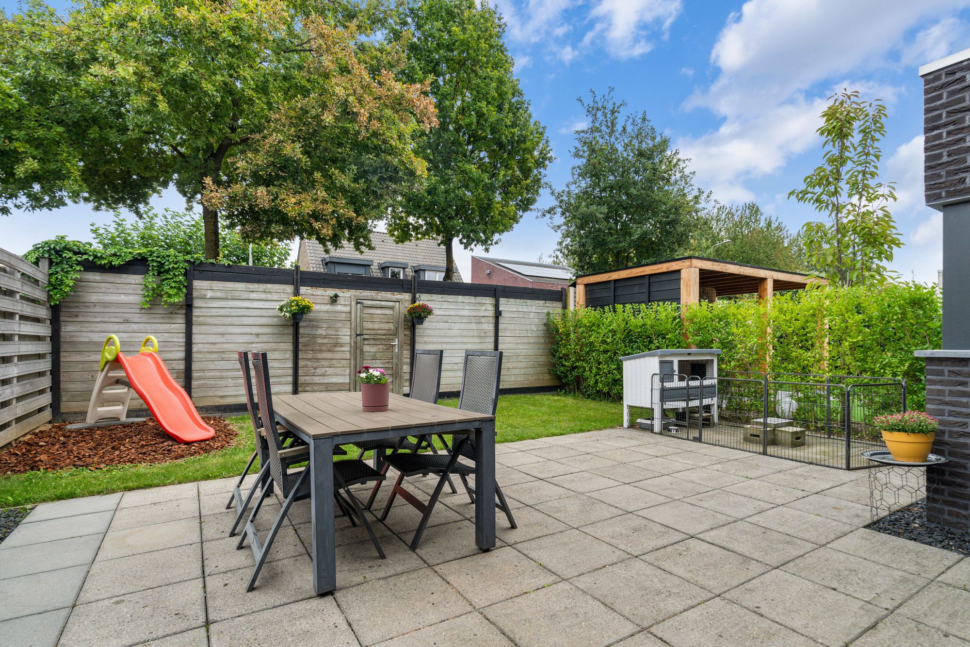 De achtertuin is ingericht met een terras, gazon en achteringang.