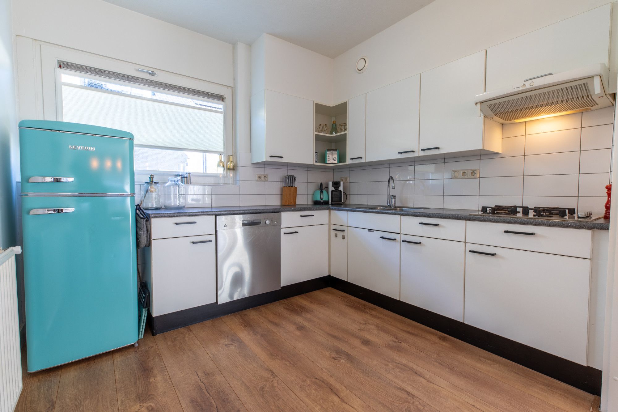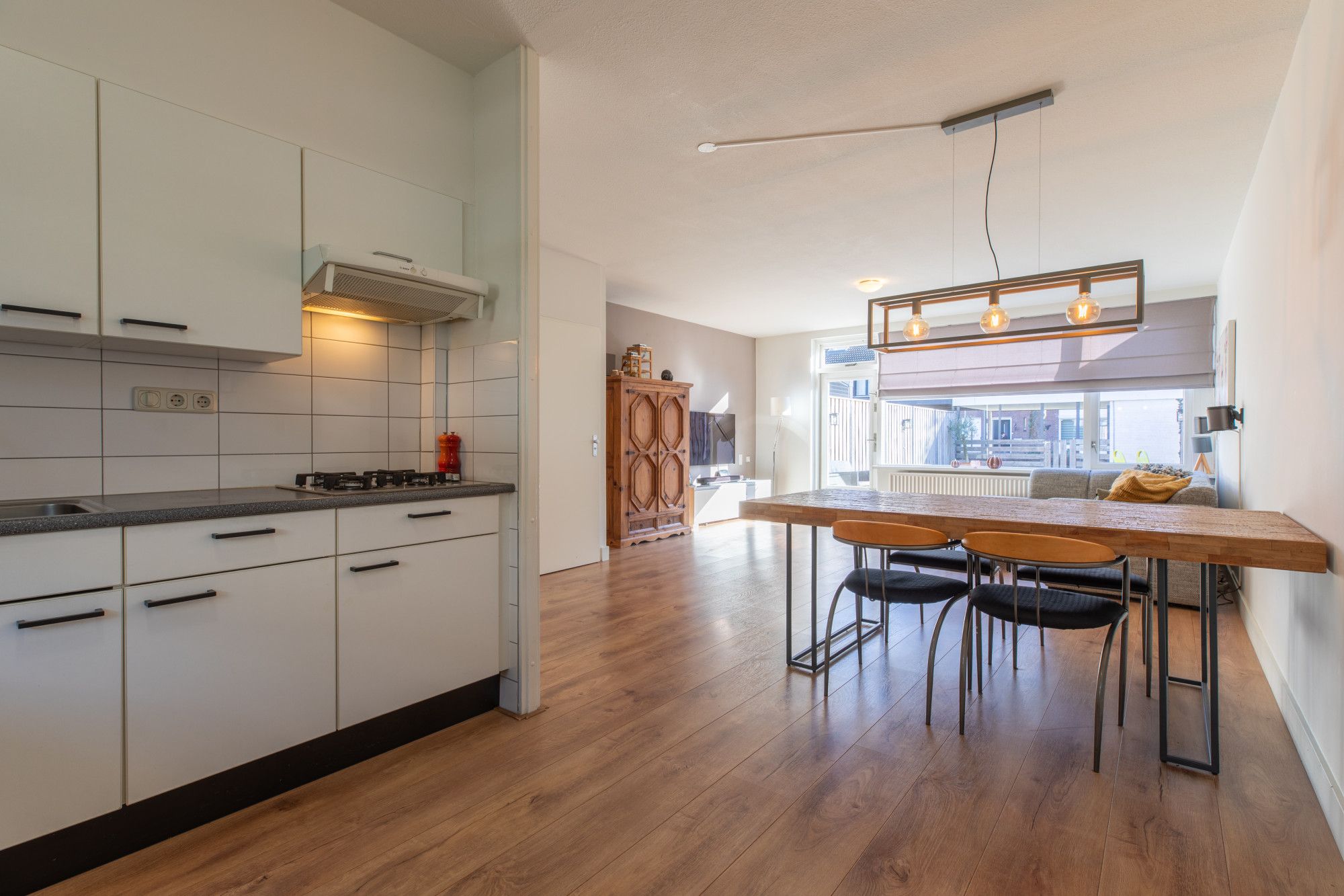 - Doorzon woonkamer met open keuken van totaal ca. 40 m² met muurkast en openslaande deur naar de achtertuin. De keuken is voorzien van een witte L-vormige keukenopstelling met o.a. een vaatwasser, oven, koelkast en een gasfornuis.